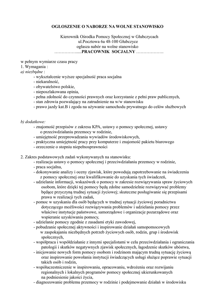 OGŁOSZENIE O NABORZE NA WOLNE STANOWISKO Kierownik Ośrodka Pomocy Społecznej w Głubczycach ul.Pocztowa 6a 48-100 Głubczyce ogłasza nabór na wolne stanowisko …………….....PRACOWNIK SOCJALNY ………………. w pełnym wymiarze czasu pracy 1. Wymagania : a) niezbędne : - wykształcenie wyższe specjalność praca socjalna - niekaralność, - obywatelstwo polskie, - nieposzlakowana opinia, - pełna zdolność do czynności prawnych oraz korzystanie z pełni praw publicznych, - stan zdrowia pozwalający na zatrudnienie na w/w stanowisku - prawo jazdy kat.B i zgoda na używanie samochodu prywatnego do celów służbowych b) dodatkowe: - znajomość przepisów z zakresu KPA, ustawy o pomocy społecznej, ustawy o przeciwdziałaniu przemocy w rodzinie, - umiejętność przeprowadzania wywiadów środowiskowych, - praktyczna umiejętność pracy przy komputerze i znajomość pakietu biurowego - orzeczenie o stopniu niepełnosprawności 2. Zakres podstawowych zadań wykonywanych na stanowisku: - realizacja ustawy o pomocy społecznej i przeciwdziałaniu przemocy w rodzinie, - praca socjalna, - dokonywanie analizy i oceny zjawisk, które powodują zapotrzebowanie na świadczenia z pomocy społecznej oraz kwalifikowanie do uzyskania tych świadczeń, - udzielanie informacji, wskazówek o pomocy w zakresie rozwiązywania spraw życiowych osobom, które dzięki tej pomocy będą zdolne samodzielnie rozwiązywać problemy będące przyczyną trudnej sytuacji życiowej; skuteczne posługiwanie się przepisami prawa w realizacji tych zadań, - pomoc w uzyskaniu dla osób będących w trudnej sytuacji życiowej poradnictwa dotyczącego możliwości rozwiązywania problemów i udzielania pomocy przez właściwe instytucje państwowe, samorządowe i organizacje pozarządowe oraz wspieranie uzyskiwaniu pomocy, - udzielanie pomocy zgodnie z zasadami etyki zawodowej, - pobudzanie społecznej aktywności i inspirowanie działań samopomocowych w zaspokajaniu niezbędnych potrzeb życiowych osób, rodzin, grup i środowisk społecznych, - współpraca i współdziałanie z innymi specjalistami w celu przeciwdziałania i ograniczania patologii i skutków negatywnych zjawisk społecznych, łagodzenie skutków ubóstwa, - inicjowanie nowych form pomocy osobom i rodzinom mającym trudną sytuację życiową oraz inspirowanie powołania instytucji świadczących usługi służące poprawie sytuacji takich osób i rodzin, - współuczestniczenie w inspirowaniu, opracowaniu, wdrożeniu oraz rozwijaniu regionalnych i lokalnych programów pomocy społecznej ukierunkowanych na podniesienie jakości życia, - diagnozowanie problemu przemocy w rodzinie i podejmowanie działań w środowisku mających na celu przeciwdziałanie temu zjawisku, - inicjowanie interwencji w środowisku dotkniętym przemocą w rodzinie oraz w stosunku do osób stosujących przemoc w rodzinie, - rozpowszechnianie informacji o instytucjach, osobach i możliwościach udzielania pomocy w środowisku lokalnym, - opracowanie i realizacja planu pomocy w indywidualnych przypadkach wystąpienia przemocy w rodzinie, monitorowanie sytuacji tych rodzin, dokumentowanie działań podejmowanych wobec tych rodzin oraz efektów tych działań - sprawowanie funkcji kuratora lub opiekuna prawnego na zlecenie sądu rodzinnego 3. Wymagane dokumenty: - list motywacyjny, - życiorys – curriculum vitae, - kserokopie świadectw pracy, - kserokopie dyplomów potwierdzających wykształcenie, kserokopie zaświadczeń o ukończonych kursach, szkoleniach, - opinie, referencje, - oświadczenie o posiadaniu pełni praw publicznych i niekaralności za przestępstwo popełnione umyślnie, - oryginał kwestionariusza osobowego - oświadczenie kandydata na opiekuna prawnego lub kuratora Druk kwestionariusza osobowego, oświadczenia na kuratora i opiekuna prawnego jest dostępny w Dziale Księgowość Ośrodka Pomocy Społecznej w Głubczycach, ul. Pocztowa 6a pokój nr 22 lub na stronie internetowej Ośrodka. Regulamin naboru na wolne stanowiska urzędnicze w Ośrodku Pomocy Społecznej w Głubczycach jest opublikowany w Biuletynie Informacji Publicznej na stronie internetowej bip.ops.glubczyce.pl Wymagane dokumenty aplikacyjne należy składać osobiście w zamkniętej kopercie w sekretariacie Ośrodka (pok. nr21) lub za pośrednictwem poczty na adres : Ośrodek Pomocy Społecznej 48-100 Głubczyce ul. Pocztowa 6a z dopiskiem „ Dotyczy naboru na stanowisko PRACOWNIK SOCJALNY” Oferty należy złożyć w nieprzekraczalnym terminie do dnia 04.07.2016r. Aplikacje, które wpłyną do Ośrodka po wyżej określonym terminie lub bez kompletu wymaganych dokumentów nie wezmą udziału w postępowaniu rekrutacyjnym . Wszelkie informacje związane z przedmiotowym naborem, w tym także o ewentualnych etapach rekrutacji będą umieszczane na stronie internetowej Biuletynu Informacji Publicznej oraz tablicy ogłoszeń w Ośrodku Pomocy Społecznej w Głubczycach ul.Pocztowa 6a. Wymagane dokumenty aplikacyjne: list motywacyjny, szczegółowe CV ( z uwzględnieniem dokładnego przebiegu kariery zawodowej), powinny być opatrzone klauzulą: Wyrażam zgodę na przetwarzanie moich danych osobowych zawartych w ofercie dla potrzeb niezbędnych do realizacji procesu rekrutacji zgodnie z ustawą z dnia 29 sierpnia 1997r. o ochronie danych osobowych ( t.j.Dz.U. z 2002r. Nr 101,poz. 926 z późn. zm.) oraz ustawą z dnia 22 marca 1999r. o pracownikach samorządowych ( Dz.U. z 2001r. Nr 142, poz. 1593 z późn. zm.). Głubczyce, dnia 23 czerwiec 2016r. Bożena Ziółkowska Kierownik Ośrodka Pomocy Społecznej w Głubczycach