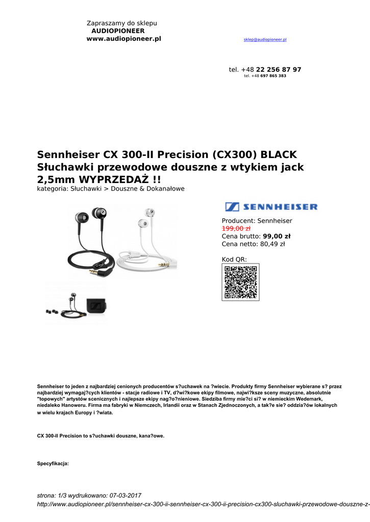 Zapraszamy do sklepu AUDIOPIONEER www.audiopioneer.pl [email protected] tel. +48 22 256 87 97 tel. +48 697 865 383 Sennheiser CX 300-II Precision (CX300) BLACK Słuchawki przewodowe douszne z wtykiem jack 2,5mm WYPRZEDAŻ !! kategoria: Słuchawki > Douszne & Dokanałowe Producent: Sennheiser 199,00 zł Cena brutto: 99,00 zł Cena netto: 80,49 zł Kod QR: Sennheiser to jeden z najbardziej cenionych producentów s?uchawek na ?wiecie. Produkty firmy Sennheiser wybierane s? przez najbardziej wymagaj?cych klientów - stacje radiowe i TV, d?wi?kowe ekipy filmowe, najwi?ksze sceny muzyczne, absolutnie "topowych" artystów scenicznych i najlepsze ekipy nag?o?nieniowe. Siedziba firmy mie?ci si? w niemieckim Wedemark, niedaleko Hanoweru. Firma ma fabryki w Niemczech, Irlandii oraz w Stanach Zjednoczonych, a tak?e sie? oddzia?ów lokalnych w wielu krajach Europy i ?wiata. CX 300-II Precision to s?uchawki douszne, kana?owe. Specyfikacja: strona: 1/3 wydrukowano: 07-03-2017 http://www.audiopioneer.pl/sennheiser-cx-300-ii-sennheiser-cx-300-ii-precision-cx300-sluchawki-przewodowe-douszne-z- Bardzo solidnie i precyzyjnie wykonane Przetworniki: dynamiczne Pasmo przenoszenia: 19-21.000 Hz Impedancja: 16 Ohm SPL (Sound pressure level) (1 kHz, 1 V RMS): 113 dB Kabel po??czeniowy: 1.2 m; asymetryczne Rodzaj wtyku: mini jack 2.5mm W zestawie: s?uchawki, 3 komplety nak?adek dousznych w ró?nych rozmiarach kolor: srebrny, z?oty ( przed zakupem prosz? potwierdzi? dost?pno??:[email protected] ) kolor: CZARNY jest dostepny S?uchawki s? nowe, w oryginalnym opakowaniu. Pochodz? od Polskiego oficjalnego dystrybutora i s? z Polsk? 24 miesi?czn? gwarancj?. strona: 2/3 wydrukowano: 07-03-2017 http://www.audiopioneer.pl/sennheiser-cx-300-ii-sennheiser-cx-300-ii-precision-cx300-sluchawki-przewodowe-douszne-z- strona: 3/3 wydrukowano: 07-03-2017 http://www.audiopioneer.pl/sennheiser-cx-300-ii-sennheiser-cx-300-ii-precision-cx300-sluchawki-przewodowe-douszne-z-
