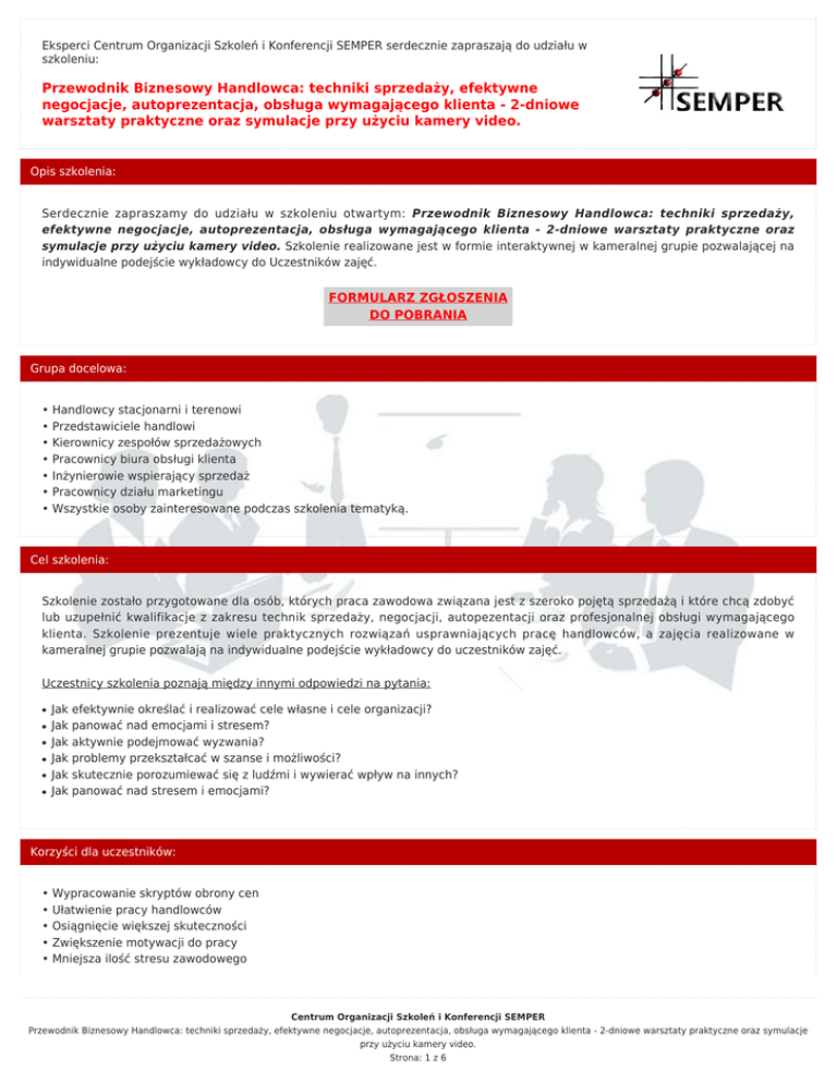 Eksperci Centrum Organizacji Szkoleń i Konferencji SEMPER serdecznie zapraszają do udziału w szkoleniu: Przewodnik Biznesowy Handlowca: techniki sprzedaży, efektywne negocjacje, autoprezentacja, obsługa wymagającego klienta - 2-dniowe warsztaty praktyczne oraz symulacje przy użyciu kamery video. Opis szkolenia: Serdecznie zapraszamy do udziału w szkoleniu otwartym: Przewodnik Biznesowy Handlowca: techniki sprzedaży, efektywne negocjacje, autoprezentacja, obsługa wymagającego klienta - 2-dniowe warsztaty praktyczne oraz symulacje przy użyciu kamery video. Szkolenie realizowane jest w formie interaktywnej w kameralnej grupie pozwalającej na indywidualne podejście wykładowcy do Uczestników zajęć. FORMULARZ ZGŁOSZENIA DO POBRANIA Grupa docelowa: • Handlowcy stacjonarni i terenowi • Przedstawiciele handlowi • Kierownicy zespołów sprzedażowych • Pracownicy biura obsługi klienta • Inżynierowie wspierający sprzedaż • Pracownicy działu marketingu • Wszystkie osoby zainteresowane podczas szkolenia tematyką. Cel szkolenia: Szkolenie zostało przygotowane dla osób, których praca zawodowa związana jest z szeroko pojętą sprzedażą i które chcą zdobyć lub uzupełnić kwalifikacje z zakresu technik sprzedaży, negocjacji, autopezentacji oraz profesjonalnej obsługi wymagającego klienta. Szkolenie prezentuje wiele praktycznych rozwiązań usprawniających pracę handlowców, a zajęcia realizowane w kameralnej grupie pozwalają na indywidualne podejście wykładowcy do uczestników zajęć. Uczestnicy szkolenia poznają między innymi odpowiedzi na pytania: ● ● ● ● ● ● Jak efektywnie określać i realizować cele własne i cele organizacji? Jak panować nad emocjami i stresem? Jak aktywnie podejmować wyzwania? Jak problemy przekształcać w szanse i możliwości? Jak skutecznie porozumiewać się z ludźmi i wywierać wpływ na innych? Jak panować nad stresem i emocjami? Korzyści dla uczestników: • Wypracowanie skryptów obrony cen • Ułatwienie pracy handlowców • Osiągnięcie większej skuteczności • Zwiększenie motywacji do pracy • Mniejsza ilość stresu zawodowego Centrum Organizacji Szkoleń i Konferencji SEMPER Przewodnik Biznesowy Handlowca: techniki sprzedaży, efektywne negocjacje, autoprezentacja, obsługa wymagającego klienta - 2-dniowe warsztaty praktyczne oraz symulacje przy użyciu kamery video. Strona: 1 z 6 • Wzrost efektywności sprzedaży • Większa satysfakcja klientów • Umocnienie pozycji na rynku Uczestnicy dokonają samoanalizy własnych umiejętności i kompetencji oraz poznają najistotniejsze narzędzia niezbędne do efektywnej pracy w charekterze handlowca. Podczas szkolenia uczestnicy dowiedzą się również w jaki sposób zapewnić realizację celów w danej organizacji. Zajęcia w małych grupach oraz ćwiczenia przy użyciu kamery video umożliwiają przeprowadzenie praktycznych symulacji także w odniesieniu do własnego celu, charakteru i stylu pracy. Dodatkowe korzyści: ● ● Poszerzenie wiedzy uczestników na temat istoty procesów sprzedażowych w różnych branżach. Analiza odpowiednich narzędzi pomagających w uzyskaniu lepszych rezultatów w dziedzinie sprzedaży. Metodologia: Jako pierwsza instytucja szkoleniowa w Polsce dbamy o to aby również szkolenia otwarte były dopasowane do oczekiwań oraz stylu pracy uczestników! Indywidualizacja szkolenia - dzięki udziałowi w takim szkoleniu uczestnicy osiągają oczekiwany przez pracodawcę poziom kompetencji i umiejętności. Zajęcia są prowadzone metodą warsztatową opartą na aktywizacji uczestników szkolenia poprzez pracę w małych grupach, dyskusje na forum grupy oraz ćwiczenia, studia przypadków, scenki rodzajowe, pracę indywidualną, symulacje i mini- wykłady z omówieniem przykładów z życia i prezentacją multimedialną. Przedmiotem zajęć są realne trudności uwzględniające specyfikę danej branży oraz potrzeby i możliwości osób biorących udział w warsztatach. Uczestnicy uczą się poprzez doświadczenie – ćwiczą różne sytuacje, mają możliwość konsultacji indywidualnych. Nauka poprzez kreatywność, elastyczność i osobiste doświadczenia jest najskuteczniejszą formą zdobywania nowych umiejętności. SZKOLENIE REALIZOWANE PRZY UŻYCIU KAMERY VIDEO Szczególnie ciekawe i pozwalające spojrzeć na siebie z innej perspektywy będą zajęcia z użyciem kamery, podczas których każdy z uczestników szkolenia będzie mógł zostać poddany konstruktywnej ocenie. Trener: Zygmunt Dolata Specjalizacja trenerska: Trener biznesu, wykładowca i konsultant HR. Posiada wieloletnie doświadczenie zawodowe na stanowiskach menedżerskich (Dyrektor Oddziału, Kierownik marketingu) oraz handlowych. Specjalizuje się w szkoleniach i konsultacjach dla zarządzających zespołami pracowniczymi. Stosuje Regułę Pareto w prowadzonych przez siebie szkoleniach: 80 % zajęć warsztatowych i 20% mini wykład wraz z podsumowaniem przez trenera. Pracował w charakterze Trenera Regionalnego (zarządzał zespołem Trenerów Obszarowych) i Głównego specjalisty w korporacjach: TP SA., oraz Ergo Hestia. Ekspert w zakresie zarządzania ludźmi, HR, przywództwa i sprzedaży. Autor wielu publikacji w prasie specjalistycznej i serwisach internetowych z zakresu kierowania zespołami, negocjacji i HR. Twórca instrukcji procesu coaching’owego oraz finalista konkursu „Mówca znakomity. Twórca wielu programów szkoleniowych. Absolwent Politechniki Warszawskiej (mgr inż.) i kilku studiów podyplomowych (zarządzanie, komunikacja i promocja w biznesie, polsko-niemieckich menedżerskich studiów podyplomowych Centrum Organizacji Szkoleń i Konferencji SEMPER Przewodnik Biznesowy Handlowca: techniki sprzedaży, efektywne negocjacje, autoprezentacja, obsługa wymagającego klienta - 2-dniowe warsztaty praktyczne oraz symulacje przy użyciu kamery video. Strona: 2 z 6 oraz studiów MBA ZZL. Wykładowca na studiach pod