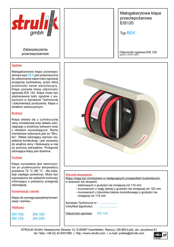 Małogabarytowa klapa przeciwpożarowa EIS120 Typ BEK Zabezpieczenia przeciwpożarowe Odporność ogniowa EIS 120 zgodnie z PN EN 1366-2 Ogólnie Małogabarytowa klapa przeciwpożarowa typu BEK jest przeznaczona do odtworzenia odporności ogniowej przegrody budowlanej, przez którą przechodzi kanał wentylacyjny. Klapa posiada klasę odporności ogniowej EIS 120. Klapa może być zastosowana tylko zgodnie z wytycznymi w Aprobacie Technicznej i dokumentacji producenta. Klapa o działaniu samoczynnym. Budowa Klapa składa się z cylindrycznej ramy montażowej oraz wkładu odcinającego o przekroju kołowym wraz z układem wyzwalającym. Rama montażowa wykonana jest ze "Strulitu". Wkład odcinający stanowi niezależną konstrukcję i jest wsuwany do wnętrza ramy i blokowany w niej za pomocą zatrzasków. Przegroda odcinająca klapy jest dzielona. Funkcja Klapa wyzwalana jest samoczynnie po przekroczeniu temperatury powietrza 72 °C (90 °C - dla instalacji ciepłego powietrza). Może być wyposażona we wskaźnik krańcowy informujący o położeniu przegrody odcinającej. Konserwacja i serwis Klapa nie wymaga specjalnej konserwacji i serwisu. Wielkości DN 100 DN 125 DN 160 DN 200 Warunki stosowania Klapy mogą być montowane w następujących przegrodach budowlanych: w ścianach lub stropach: - betonowych o grubości nie mniejszej niż 110 mm - murowanych z cegły pełnej o grubości nie mniejszej niż 120 mm - murowanych z bloczków betonu komórkowego o grubości nie mniejszej niż 115 mm Aprobata Techniczna nr : ....................... Certyfikat Zgodności: ....................... Odporność ogniowa: EIS 120 STRULIK GmbH, Neesbacher Strasse 13, D-65597 Huenfelden, Niemcy | 90-983 Łódź, skr. pocztowa 61 tel./ faks: +48 (0) 42 6401560 | http: //www.strulik.com | e-mail: [email protected] Małogabarytowa klapa przeciwpożarowa EIS 120 rama montażowa wkład Typ BEK odcinający ø zew. ø wew. Wymiary Budowa Wskaźnik krańcowy 15 Wymiary (mm) i masa (kg) øwew øzew DN L P masa P 100 101 131 210 140 2,7 125 126 156 210 140 3,1 160 161 191 210 140 3,8 200 201 232 210 140 5,1 Budowa wkładu odcinającego 3 4 3 L Wyposażenie opcjonalne: wskaźnik krańcowy "ZAMKNIĘTA" / "OTWARTA" Klapa może być wyposażona we wskaźnik krańcowy wskazujący położenie skrzydeł przegrody odcinającej. Wskaźnik krańcowy jest dostarczany opcjonalnie. Schemat i położenia wskaźnika pokazane są na rysunkach poniżej. 2 Dane elektryczne 5 6 DN 7 Sygnalizacja "otwarta" - zabezpieczenie : IP 65 - napięcie : 240V / 3A - test zgodnie z IEC 947-5-1 i EN 60947-5-1 - długość przewodu : 2 mb - przekrój przewodu : 3 x 0,34 mm2 1 Schemat elektryczny Przewody czarny / brązowy Sygnalizacja "zamknięta" 1 - Przegroda 2 - Uszczelka EPDM 3 - Uszczelka pęczniejąca 4 - Sprężyna wyzwalająca 5 - Element topikowy 6 - Zderzak przegrody 7 - Zatrzask blokujący 24V/230V + L1 - N PE Przewody czarny / biały Uwaga : ) należy pozostawić otwór rewizyjny w kanale wentylacyjnym aby umożliwić dostęp serwisowy Małogabarytowa klapa przeciwpożarowa EIS 120 1) Zamocowanie w ścianach Typ BEK Montaż Wymagania Montaż Klapa powinna być zamontowana z zachowaniem podanych warunków montażu w ścianach lub sufitach betonowych lub murowanych. Dla zamontowania w ścianach należy pozostawić otwór montażowy większy od średnicy zewnętrznej ramy montażowej o 60 mm dla przypadku montażu zaprawą murarską lub maks. 20 mm dla montażu z wełną mineralną i opcjonalnym pierścieniem montażowym. Zachowanie wielkości otworu montażowego wymagane jest ze względu na konieczność zachowania wymaganej odporności ogniowej przegrody budowlanej. Oznaczenia na rysunkach obok 16 - rama montażowa 17 - kotwy 18 - nity stalowe 19 - pierścień mocujący (opcja) Przed zamurowaniem w otworze montażowym należy klapę BEK umieścić centralnie w otworze montażowym, umieszczając ją symetrycznie w ścianie lub suficie. Od opisanej strony obsługowej BEK należy przewidzieć rewizję lub możliwość rozebrania kanału przyłączonego do klapy BEK w celu przeprowadzenia sprawdzenia serwisowego lub wymiany elementów. Kanały o przekroju okrągłym należy podłączyć za pomocą kształtek typu pan - pan (nypel). Elementy połączeniowe jak nypel typ NP, trójnik z rewizją typ RT, oraz nypel przedłużony typu SNP-S (do podłączenia kanału typu flex) mogą być dostarczone jako wyposażenie (patrz cennik katalogowy). 2) Zamocowanie w suficie Dane techniczne Małogabarytowa klapa przeciwpożarowa EIS 120 Typ BEK Charakterystyka przepływu W funkcji wydatku powietrza q v (m 3/h), przedstawiono poziom mocy akustycznej Lw w dB(A) i spadek ciśnienia na klapie w (Pa). Lw dB(A) 80 100 200 300 500 600 800 80 70 60 50 30 20 20 90 80 90 80 70 70 60 60 50 50 40 40 30 30 20 20 10 100 200 300 ø 200 30 ø 160 40 ø 125 40 ø 100 ∆p (Pa) ø 200 50 ø 125 ø 100 60 ø 160 70 500 600 800 qv (m3/h) STRULIK GmbH, Neesbacher Strasse 13, D-65597 Huenfelden | PL-90983 Łódź, skr. pocztowa 61 http: //www.strulik.com - E.mail: [email protected] 10