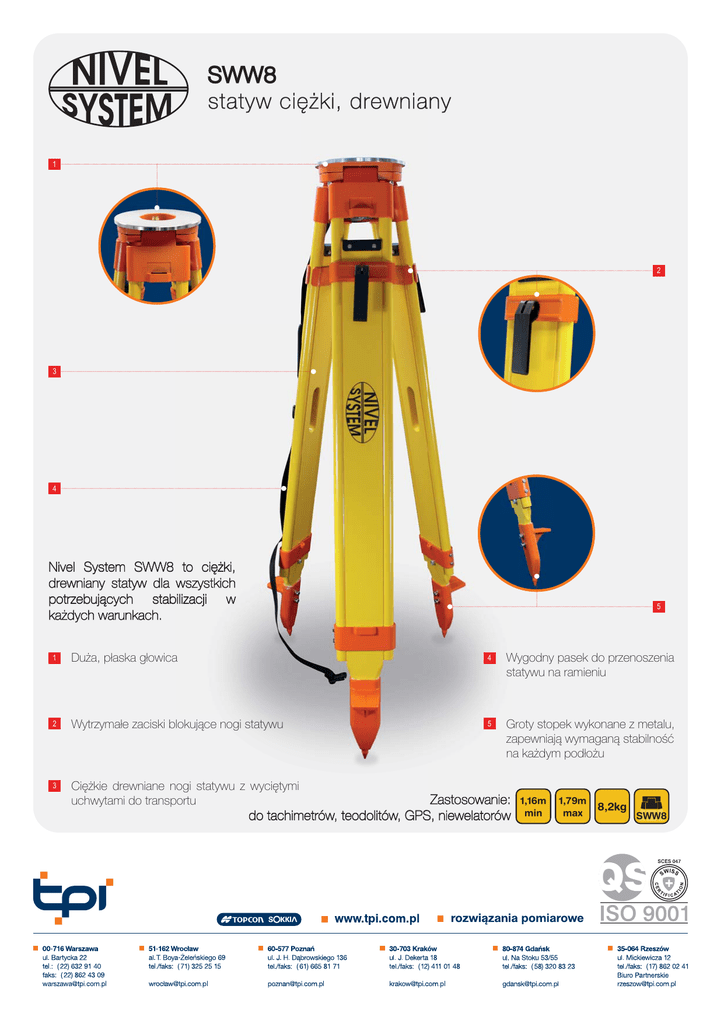 SWW8 statyw ciê¿ki, drewniany 1 2 3 4 Nivel System SWW8 to ciê¿ki, drewniany statyw dla wszystkich potrzebuj¹cych stabilizacji w ka¿dych warunkach. 5 1 Du¿a, p³aska g³owica 4 Wygodny pasek do przenoszenia statywu na ramieniu 2 Wytrzyma³e zaciski blokuj¹ce nogi statywu 5 Groty stopek wykonane z metalu, zapewniaj¹ wymagan¹ stabilnośæ na ka¿dym pod³o¿u 3 Ciê¿kie drewniane nogi statywu z wyciêtymi uchwytami do transportu Zastosowanie: do tachimetrów, teodolitów, GPS, niewelatorów 1,16m min 1,79m max 8,2kg SWW8