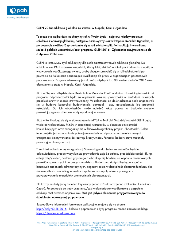 GLEN 2016: edukacja globalna ze stażami w Nepalu, Kenii i Ugandzie To może być najbardziej edukacyjny rok w Twoim życiu– najpierw międzynarodowe szkolenia z edukacji globalnej, następnie 3-miesięczny staż w Nepalu, Kenii lub Ugandzie, a po powrocie możliwość sprawdzenia się w roli edukatora/ki. Polska Akcja Humanitarna szuka 3 polskich uczestników/czek programu GLEN 2016. Zgłoszenia przyjmowane są do 6 stycznia 2016 roku. GLEN to intensywny cykl edukacyjny dla osób zainteresowanych edukacja globalną. Do udziału w nim PAH zaprasza wszystkich, którzy lubią działać w lokalnym środowisku z myślą o wyzwaniach współczesnego świata, osoby chcące sprawdzić się w roli edukatora/ki po powrocie do Polski oraz posiadające kwalifikacje do pracy w organizacjach goszczących podczas staży. Program skierowany jest do osób między 21. a 30. rokiem życia W 2016 roku oferowane są staże w Nepalu, Kenii i Ugandzie. Staż w Nepalu odbędzie się w Kevin Rohan Memorial Eco-Foundation. Uczestnicy/uczestniczki programu odpowiedzialni będą za wspieranie lokalnej społeczności w zakładaniu własnych przedsiębiorstw w sposób zrównoważony. W zależności od doświadczenia będą angażowali się w budowę konstrukcji budowlanych, pomagali przy gospodarstwie lub produkcji rękodzieła. Do ich obowiązków może należeć także pomoc w budowie systemu pozwalającego na zbieranie wody opadowej w wiosce. Staż w Kenii odbędzie się w stowarzyszeniu MYSA w Nairobi. Stażyści/stażystki GLEN będą wspierać wolontariuszy MYSA w organizacji warsztatów w obszarze umiejętności komunikacyjnych oraz zaangażują się w filmowo-fotograficzny projekt „Shootback”. Celem tego projektu jest wzmacnianie potencjału młodych ludzi poprzez uczenie ich nowych umiejętności i motywowanie do rozwoju kreatywności. Ponadto, będą tworzyć materiały promocyjne dla organizacji. Trzeci staż odbędzie się w organizacji Somero Uganda. Jeden ze stażystów będzie odpowiedzialny przede wszystkim za prowadzenie zajęć z zakresu przedsiębiorczości i IT, np. edycji zdjęć/wideo, podczas gdy druga osoba skupi się bardziej na wsparciu realizowanych projektów społecznych i na pracy z młodzieżą. Dodatkowo stażyści będą pomagać w bieżących zadaniach administracyjnych, angażować się w działalność zbierania funduszy dla Somero, dbać o marketing w mediach społecznościowych, a także pomagać w przygotowywaniu materiałów promocyjnych dla organizacji. Na każdy ze staży jadą dwie lub trzy osoby (jedna z Polski oraz jedna z Niemiec, Estonii lub Czech). Po powrocie ze staży uczestnicy/czki wolontariacko współpracują z zespołem edukacji PAH przez co najmniej rok. Staż jest jedynie elementem przygotowawczym do działalności edukacyjnej po powrocie. Szczegółowe informacje i formularze aplikacyjne znajdują się na stronie: http://bit.ly/GLEN2016. Relacje z poprzednich edycji programu można znaleźć na blogu https://glennies.wordpress.com. Polska Akcja Humanitarna, ul. Szpitalna 5 lok. 3, 00-031 Warszawa, t +48 (22) 828-88-82, +48 (22) 828-90-86, f +48 (22) 831-99-38, [email protected] Biuro PAH w Toruniu, ul. Wita Stwosza 2, 87-100 Toruń, t +48 (56) 65 21 368, f +48 (56) 65 21 369, [email protected] www.pah.org.pl NIP: 525-14-41-253 REGON: 010849302 KRS: 0000136833