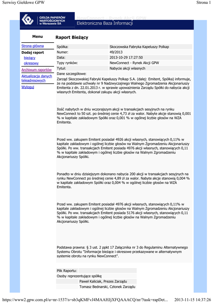 Serwisy Giełdowe GPW Strona 1 NewConnect - Rynek Akcji GPW Elektroniczna Baza Informacji Menu Raport Bieżący Strona główna Spółka: Skoczowska Fabryka Kapeluszy Polkap Dodaj raport Numer: 49/2013 bieżący Data: 2013-10-29 17:27:50 okresowy Typy rynków: NewConnect - Rynek Akcji GPW Tytuł: Nabycie akcji własnych Archiwum raportów Aktualizacja danych teleadresowych Wyloguj Dane szczegółowe: Zarząd Skoczowskiej Fabryki Kapeluszy Polkap S.A. (dalej: Emitent, Spółka) informuje, że na podstawie uchwały nr 9 Nadzwyczajnego Walnego Zgromadzenia Akcjonariuszy Emitenta z dn. 22.01.2013 r. w sprawie upoważnienia Zarządu Spółki do nabycia akcji własnych Emitenta, dokonał zakupu akcji własnych. Ilość nabytych w dniu wczorajszym akcji w transakcjach sesyjnych na rynku NewConnect to 50 szt. po średniej cenie 4,73 zł za walor. Nabyte akcje stanowią 0,001 % w kapitale zakładowym Spółki oraz 0,001 % w ogólnej liczbie głosów na WZA Emitenta. Przed ww. zakupem Emitent posiadał 4926 akcji własnych, stanowiących 0,11% w kapitale zakładowym i ogólnej liczbie głosów na Walnym Zgromadzeniu Akcjonariuszy Spółki. Po ww. transakcjach Emitent posiada 4976 akcji własnych, stanowiących 0,11 % w kapitale zakładowym i ogólnej liczbie głosów na Walnym Zgromadzeniu Akcjonariuszy Spółki. Ponadto w dniu dzisiejszym dokonano nabycia 200 akcji w transakcjach sesyjnych na rynku NewConnect po średniej cenie 4,89 zł za walor. Nabyte akcje stanowią 0,004 % w kapitale zakładowym Spółki oraz 0,004 % w ogólnej liczbie głosów na WZA Emitenta. Przed ww. zakupem Emitent posiadał 4976 akcji własnych, stanowiących 0,11% w kapitale zakładowym i ogólnej liczbie głosów na Walnym Zgromadzeniu Akcjonariuszy Spółki. Po ww. transakcjach Emitent posiada 5176 akcji własnych, stanowiących 0,11 % w kapitale zakładowym i ogólnej liczbie głosów na Walnym Zgromadzeniu Akcjonariuszy Spółki. Podstawa prawna: § 3 ust. 2 ppkt 17 Załącznika nr 3 do Regulaminu Alternatywnego Systemu Obrotu "Informacje bieżące i okresowe przekazywane w alternatywnym systemie obrotu na rynku NewConnect". Plik Raportu: Osoby reprezentujące spółkę Paweł Kaliciak, Prezes Zarządu Tomasz Bednarski, Członek Zarządu https://www2.gpw.com.pl/u=nr-1537/s=sb3qKMFvJ4MAAHJjXFQAAACQ/nr/?task=rapDet... 2013-11-15 14:37:26 Serwisy Giełdowe GPW Strona 2 Login Regulacje || kontakt nr-1537 Tryb testowy || english https://www2.gpw.com.pl/u=nr-1537/s=sb3qKMFvJ4MAAHJjXFQAAACQ/nr/?task=rapDet... 2013-11-15 14:37:26