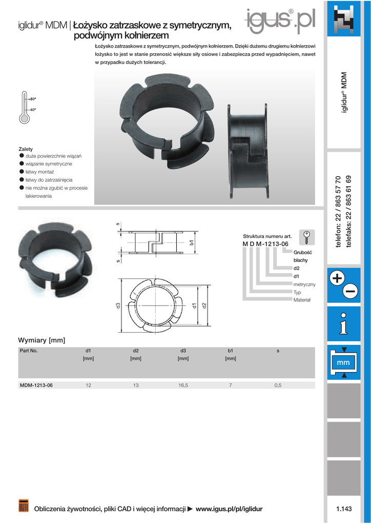 iglidur® MDM | Łożysko zatrzaskowe z symetrycznym, podwójnym kołnierzem Łożysko zatrzaskowe z symetrycznym, podwójnym kołnierzem. Dzięki dużemu drugiemu kołnierzowi łożysko to jest w stanie przenosić większe siły osiowe i zabezpiecza przed wypadnięciem, nawet iglidur® MDM w przypadku dużych tolerancji. Zalety duże powierzchnie wiązań wiązanie symetryczne łatwy do zatrzaśnięcia nie można zgubić w procesie lakierowania Struktura numeru art. M D M -12 13-06 telefaks: 22 / 863 61 69 telefon: 22 / 863 57 70 łatwy montaż Grubość blachy d2 d1 metryczny Typ Materiał Wymiary [mm] Part No. MDM-1213-06 d1 d2 d3 b1 [mm] [mm] [mm] [mm] 12 13 16,5 7 Obliczenia żywotności, pliki CAD i więcej informacji www.igus.pl/pl/iglidur s 0,5 1.143