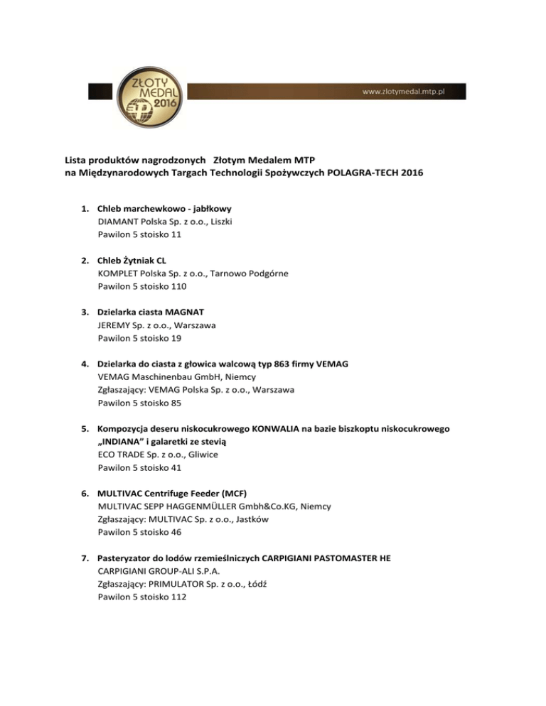 Lista produktów nagrodzonych Złotym Medalem MTP na Międzynarodowych Targach Technologii Spożywczych POLAGRA-TECH 2016 1. Chleb marchewkowo - jabłkowy DIAMANT Polska Sp. z o.o., Liszki Pawilon 5 stoisko 11 2. Chleb Żytniak CL KOMPLET Polska Sp. z o.o., Tarnowo Podgórne Pawilon 5 stoisko 110 3. Dzielarka ciasta MAGNAT JEREMY Sp. z o.o., Warszawa Pawilon 5 stoisko 19 4. Dzielarka do ciasta z głowica walcową typ 863 firmy VEMAG VEMAG Maschinenbau GmbH, Niemcy Zgłaszający: VEMAG Polska Sp. z o.o., Warszawa Pawilon 5 stoisko 85 5. Kompozycja deseru niskocukrowego KONWALIA na bazie biszkoptu niskocukrowego „INDIANA” i galaretki ze stevią ECO TRADE Sp. z o.o., Gliwice Pawilon 5 stoisko 41 6. MULTIVAC Centrifuge Feeder (MCF) MULTIVAC SEPP HAGGENMÜLLER Gmbh&Co.KG, Niemcy Zgłaszający: MULTIVAC Sp. z o.o., Jastków Pawilon 5 stoisko 46 7. Pasteryzator do lodów rzemieślniczych CARPIGIANI PASTOMASTER HE CARPIGIANI GROUP-ALI S.P.A. Zgłaszający: PRIMULATOR Sp. z o.o., Łódź Pawilon 5 stoisko 112 8. Piec konwekcyjno-mikrofalowy Merrychef e2s Manitowoc Foodservice UK Limited, Anglia Zgłaszający: PRIMULATOR Sp. z o.o. Pawilon 5 stoisko 112 9. Śluza higieniczna SANICARE – TAP – 1500 – B - R ELPRESS BV, Holandia Pawilon 5A stoisko 44 10. Urządzenie do sterylizacji produktów spożywczych z kaskadowym systemem schładzania oraz zintegrowany układ do wykorzystania ciepła procesowego Fabryka Maszyn Spożywczych „SPOMASZ” Pleszew S.A., Pleszew Pawilon 7A stoisko 53 Wszystkie przyznane Złote Medale MTP są równoważne. Listy ułożone alfabetycznie wg produktów.