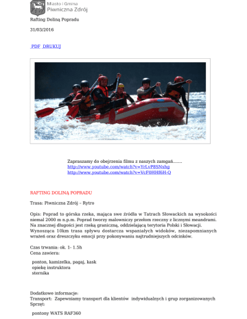 Rafting Doliną Popradu 31/03/2016 PDF DRUKUJ Zapraszamy do obejrzenia filmu z naszych zamgań....... http://www.youtube.com/watch?v=YrLvP8SNxhg http://www.youtube.com/watch?v=VcF0HHf6H-Q RAFTING DOLINĄ POPRADU Trasa: Piwniczna Zdrój – Rytro Opis: Poprad to górska rzeka, mająca swe źródła w Tatrach Słowackich na wysokości niemal 2000 m n.p.m. Poprad tworzy malowniczy przełom rzeczny z licznymi meandrami. Na znacznej długości jest rzeką graniczną, oddzielającą terytoria Polski i Słowacji. Wynosząca 10km trasa spływu dostarcza wspaniałych widoków, niezapomnianych wrażeń oraz dreszczyku emocji przy pokonywaniu najtrudniejszych odcinków. Czas trwania: ok. 1- 1.5h Cena zawiera: ponton, kamizelka, pagaj, kask opiekę instruktora sternika Dodatkowe informacje: Transport: Zapewniamy transport dla klientów indywidualnych i grup zorganizowanych Sprzęt: pontony WATS RAF360 Kamizelki ratunkowe, kaski, pagaje, rzutki ratunkowe Sprzęt jest każdorazowo dostarczany na miejsce spływu Instruktorzy: o komfort i bezpieczeństwo klientów dbają Instruktorzy posiadający uprawnienia Instruktora Sportu – kajakarstwo górskie oraz Mistrzowie Polski w kajakarstwie górskim. Telefon kontaktowy: 609 375 913 501 724 216