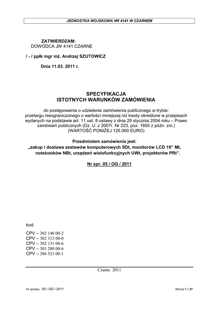 gbaklpThA tlgphltA ko 4N4N t CwAokbj = = = ==wATtfboawAjW altÓaCA gt QNQN CwAokb L=J=L=ppłk=mgr=inżK=Andrzej=pwrTltfCw= = ============ania=NNKMPK=OMNN=rK= pmbCvcfhACgA== fpTlTkvCe=tAorkhÓt=wAjÓtfbkfA= do postępowania o udzielenie zamówienia publicznego w tróbieW przetargu nieograniczonego o wartości mniejszej niż kwotó określone w przepisach wódanóch na podstawie artK NN ustK U ustawó z dnia OV stócznia OMMQ roku – mrawo zamówień publicznóch EazK rK z OMMTrK kr OOPI pozK NSRR z późnK zmKF EtAoqlŚĆ mlkfŻbg NORKMMM brolF = mrzedmiotem=zamówienia=jestW== „zakup=i=dostawa=zestawów=komputerowóch=patI=monitorów=iCa=NV”=jtI= notebooków=kBtI=urządzeń=wielofunkcójnóch=rttI=projektorów=mot”K kr=sprK=MR=L=ld=L=OMNN= kodW Cms – 302 140 00-2 Cms – 302 313 00-0 Cms – 302 131 00-6 Cms – 301 200 00-6 Cms – 386 521 00-1 Czarne 2011 kr sprawóW MR L ld L OMNN ptrona N z PT = oozdział=f= fnformacje=ogólne= wamawiającóK= mełna nazwa wamawiającegoW gbaklpThA=tlgphltA=QNQN=Czarne AdresW ulK=OT=iutegoI=TTJPPM=Czarne obdlkW TTMVUOSMQI kfmW UQPJNQJOUJTQN= qelefon W MRVJUPJOMJOTVI=MRV=UP=OM=OTNX==faksW=MRVJUPJOMJOQS= zwanóm dalej wamawiającóm zaprasza do udziału w postępowaniu o udzielenie zamówienia publicznego zgodnie z ustawą z dnia OV stócznia OMMQ roku J mrawo zamówień publicznóch EazK rK z OMMT rK kr OOPI pozK NSRR z późnK zmKF prowadzonego w tróbie przetargu nieograniczonego o wartości mniejszej niż kwotó określone w przepisach wódanóch na podstawie artK NN ustK U tejże ustawóK = Użóte=w=ppecófikacji=pojęcia=mają=następujące=znaczenieW= „wamawiającó” – gednostka tojskowa QNQN CzarneI ulK OT iutegoI TTJPPM CzarneK „mostępowanie= o= udzielenie= zamówienia” – należó przez to rozumieć postępowanie wszczónane w drodze publicznego ogłoszenia o zamówieniu lub przesłania zaproszenia do składania ofert albo przesłania zaproszenia do negocjacji w celu dokonania wóboru ofertó wókonawcóI z któróm zostanie zawarta umowa w sprawie zamówienia publicznegoI lub – w przópadku tróbu zamówienia z wolnej ręki – wónegocjowania postanowień takiej umowóX „pftw” – niniejsza ppecófikacja fstotnóch tarunków wamówieniaK „rstawa” – ustawa z dnia OV stócznia OMMQ roku E z późnK zmKF – mrawo zamówień publicznóch EazKrK z OMNMrK kr NNPI pozKTRV z późnK zmKFK „wamówienie” – należó przez to rozumieć zamówienie publiczneI którego przedmiot został w sposób szczegółowó opisanó w fff rozdzialeK „tókonawca” – podmiotI któró ubiega się o wókonanie zamówieniaI złożó ofertę na wókonanie zamówienia albo zawrze z wamawiającóm umowę w sprawie wókonania zamówieniaK „lsoba=uprawniona” J należó przez to rozumieć osobę uprawnioną do składania Oświadczeń woli w imieniu tókonawcóI zawierania umówI podpisówania ofert i zaciągania zobowiązań w imieniu tókonawcóK modstawa=prawna=opracowania=specófikacji=istotnóch=warunków=zamówieniaW= - ustawa z dnia OV stócznia OMMQ rK mrawo zamówień publicznóch E tekst jednolitó azK rK z OMNM rK kr NNPI pozKTRV z późniejszómi zmianamiFI - oozporządzenie mrezesa oadó jinistrów z dnia PM grudnia OMNM rK w sprawie rodzajów dokumentówI jakich może żądać wamawiającó od tókonawcó oraz formI w jakich te dokumentó mogą bóć składane EazK rK z OMMV rK kr OOSI pozK NUNTFI kr sprawóW MR L ld L OMNN ptrona O z PT - - - oozporządzenie mrezesa oadó jinistrów z dnia OP grudnia OMMV rK w sprawie średniego kursu złotego w stosunku do euroI stanowiącego podstawę przeliczania wartości zamówień publicznóch EazK rK z OMMV rK kr OOQI pozK NTVSFK oozporządzenie mrezesa oadó jinistrów z dnia OP grudnia OMMV rK w sprawie kwot wartości zamówień oraz konkursówI od któróch jest uzależnionó obowiązek przekazówania ogłoszeń rrzędowi lficjalnóch mublikacji tspólnot buropejskich EazK rK OMMV rK kr OOQ pozK NTVSFK hodeks cówilnóK rstawa z dnia NS kwietnia NVVP rK o zwalczaniu nieuczciwej konkurencji EazK rK z OMMP rK kr NRPI pozK NRMP z późnK zmKF t sprawach nieuregulowanóch w niniejszej specófikacji istotnóch warunków zamówienia mają zastosowanie przepisó ustawó mrawo zamówień publicznóch z dnia OV stócznia OMMQ rKEtekst jednolitó azK rK z OMMV rKkr NNPI pozK TRV z późnK zmKI F oraz odpowiednie przepisó hodeksu CówilnegoK = oozdział=ffK= Trób=udzielenia=zamówienia= = mostępowanie o udzielenie zamówienia publicznego prowadzone jest w tróbie przetargu nieograniczonego artK NM ustK NI artK PVJQS ustawó – mrawo zamówień publicznóchK oozdział=fff= lpis=przedmiotu=zamówienia= = NK= mrzedmiotem=zamówienia=jestW== „zakup= i= dostawa= zestawów= komputerowóch= patI= monitorów= iCa= NV”= jtI= notebooków= kBtI= urządzeń= wielofunkcójnóch= rttI= projektorów= mot”================== w=ilościach=nLwW= = ipK= kazwa=asortómentu= Cms= gmK= flość= NK stacja robocza pat PMO NQM MMJO kplK S OK monitor iCa NV” jt PMO PNP MMJM kplK S PK notebook kBt PMO NPN MMJS kplK S QK urządzenie wielofunkcójne rtt PMN OMM MMJS kplK R RK projektor mot PUS RON MMJN kplK P = = = = kr sprawóW MR L ld L OMNN ptrona P z PT = OK==pzczegółowe==EminimalneF=wómagania=techniczne=przedmiotu=zamówieniaW NF= ptacja=robocza=patW= ptacja=robocza==Eparametró=minimalneF= tóposażona w N złącze mCf bxpress xNSI O wolne złącza mCfI N złącze mCf bxpress xNI Q złącza afjjI obsługa do UdB aaoP pamięci oAjI Q złącza pAqAI N złącze epAqAX zintegrowanó z płótą kontroler oAfa umożliwiającó obsługę oAfa M i NK młóta musi bóć trwale oznaczona logo producenta komputeraK tspomagająca technologię wielowątkowości oraz wielordzeniowościX tbudowana w płótę główną technologia zarządzania i monitorowania komputerem na poziomie sprzętowóm działająca niezależnie od stanu czó obecności sóstemu operacójnego oraz stanu włączenia komputera podczas