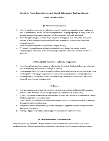 Regulamin Panelu Dyscyplinarnego przy Komisji do Zwalczania Dopingu w Sporcie z dnia 1 września 2016 r. §1 Postanowienia wstępne 1. Panel dyscyplinarny orzeka na podstawie polskich przepisów antydopingowych wydanych dnia 23 października 2014 r. lub światowego kodeksu antydopingowego w wersji 2015, lub przepisów antydopingowych właściwej międzynarodowej federacji sportowej. 2. Panel Dyscyplinarny jest samodzielnym organem działającym przy Komisji do Zwalczania Dopingu w Sporcie powołanym w celu orzekania w sprawach o naruszenie przepisów antydopingowych. 3. Panel dyscyplinarny orzeka w pierwszej i drugiej instancji. 4. W zakresie nieuregulowanym niniejszym regulaminem stosuje się polskie przepisy antydopingowe Komisji do Zwalczania Dopingu w Sporcie z dnia 23 października 2014 r. z późn. zm. §2 Niezależność. Tajemnica i szybkość postępowania 1. Panel Dyscyplinarny działa niezależne od organów Komisji do Zwalczania Dopingu w Sporcie oraz Biura Komisji do Zwalczania Dopingu w Sporcie. 2. Przez przyjęcie funkcji przewodniczący lub członek Panelu Dyscyplinarnego zobowiązuje się ją pełnić zgodnie z niniejszym regulaminem oraz właściwymi przepisami antydopingowymi. 3. Przewodniczący i członkowie Panelu Dyscyplinarnego powinni być bezstronni i niezależni przez cały czas trwania postępowania. §3 Strona 1. Stroną postępowania dyscyplinarnego jest obwiniony, przedstawiciel Zespołu Planowania Badań i Oceny Wyników Próbek Biologicznych lub przedstawiciel Biura Komisji. 2. W toku postępowania każda ze stron ma prawo do czynnego udziału w postępowaniu, w tym składać wyjaśnienia, żądania i wnioski. 3. Każda ze stron uprawniona jest do złożenia oświadczenia co do twierdzeń strony przeciwnej, dotyczących okoliczności sprawy. 4. Na żądanie Panelu Dyscyplinarnego strony obowiązane są przedstawiać dowody i udzielać pisemnych odpowiedzi. 5. Strona postępowania może w czasie jego trwania ustanowić pełnomocnika. §4 Zasada swobodnej oceny dowodów Panel dyscyplinarny pierwszej i drugiej instancji w toku rozpoznania sprawy kierują się zasadą swobodnej oceny dowodów zgodnie z obowiązującymi właściwymi przepisami antydopingowymi. §5 Postępowanie 1. Postępowanie toczące się przed Panelem Dyscyplinarnym odbywa się w trybie rozprawy, zgodnie z art. 8.1.2 polskich przepisów antydopingowych. 2. W przypadku zrzeczenia się przez obwinionego z przeprowadzenia rozprawy postępowanie przeprowadzane jest w trybie uproszczonym na podstawie zebranego materiału dowodowego. 3. Wszczęcie postępowania dyscyplinarnego następuje z inicjatywy Zespołu Planowania Badań oraz Oceny Wyników Próbek biologicznych lub przedstawiciela Biura Komisji. Postępowanie dyscyplinarne może być poprzedzone postępowaniem wyjaśniającym, w celu ustalenia, czy zachodzi uzasadnione podejrzenie przewinienia dyscyplinarnego oraz w celu ustalenia osób obwinionych. 4. W przypadku, jeżeli wniosek o wszczęcie postępowania dyscyplinarnego jest oczywiście bezzasadny lub po przeprowadzeniu postępowania wyjaśniającego ustalono, że nie zachodzi uzasadnione podejrzenie przewinienia dyscyplinarnego, organ dyscyplinarny odmawia wszczęcia postępowania dyscyplinarnego. 5. Panel Dyscyplinarny prowadzi postępowanie w sposób zapewniający równe traktowanie stron oraz prawo każdej ze stron do bycia wysłuchaną i przedstawienia swoich twierdzeń oraz dowodów na ich poparcie. 6. Strony postępowania powinny działać w dobrej wierze i przyczyniać się do szybkości i efektywności postępowania oraz unikania zbędnych kosztów. 7. Panel Dyscyplinarny dąży do zapewnienia szybkości i efektywności postępowania oraz unikania zbędnych kosztów. 8. Postępowania prowadzone przez Panel Dyscyplinarny są niejawne. 9. Członkowie zespołu orzekającego powoływani są przez przewodniczącego właściwej instancji. 10. W razie wyłączenia Przewodniczącego właściwej instancji jego funkcję przejmuje najstarszy stażem członek Panelu właściwej instancji. §6 Udział przedstawiciela Polskiego Związku Sportowego lub innej organizacji sportowej 1. Zapewnia się udział w postępowaniu toczącym się przed Panelem Dyscyplinarnym przedstawicielowi właściwego polskiego związku sportowego lub innej organizacji sportowej. 2. Przedstawiciel polskiego związku sportowego lub innej organizacji sportowej zobowiązany jest do wyrażenia opinii w sprawie o naruszenie przepisów antydopingowych, określając propozycję rozstrzygnięcia. §7 Narada i głosowanie 1. Jeżeli przewodniczący Panelu Dyscyplinarnego uznaje sprawę za wyjaśnioną, zarządza naradę i głosowanie nad orzeczeniem. 2. Orzeczenie zapada zwykłą większością głosów. Żaden z członków Panelu Dyscyplinarnego nie może odmówić udziału w głosowaniu, jak również wstrzymać się od głosu, chyba że wyłączył się od rozpoznania tej sprawy 3. W naradzie i głosowaniu nie bierze udziału przedstawiciel polskiego związku sportowego. 4. Jeżeli zarzut uchybienia postanowieniom niniejszego regulaminu lub innym uzgodnionym przez strony zasadom postępowania nie został podniesiony przez stronę niezwłocznie, uważa się, że strona zrzekła się podniesienia zarzutu takiego uchybienia. 5. Panel Dyscyplinarny może podjąć decyzję w trybie obiegowym, jeżeli sprawa wymaga szybkiego rozpatrzenia. Decyzja może zostać podjęta za pośrednictwem środków komunikacji elektronicznej lub poprzez przeprowadzenie telekonferencji. §8 Zasada należytej staranności oraz odpowiedzialność 1. Przewodniczący i członkowie Panelu Dyscyplinarnego wykonują czynności związane z postępowaniem z należytą starannością, w szczególności dążąc do tego, aby wydane orzeczenie było skuteczne i wykonalne. 2. Przewodniczący i członkowie Panelu Dyscyplinarnego nie ponoszą odpowiedzialności za szkodę powstałą w następstwie działań lub zaniechań związanych z prowadzeniem postępowania.