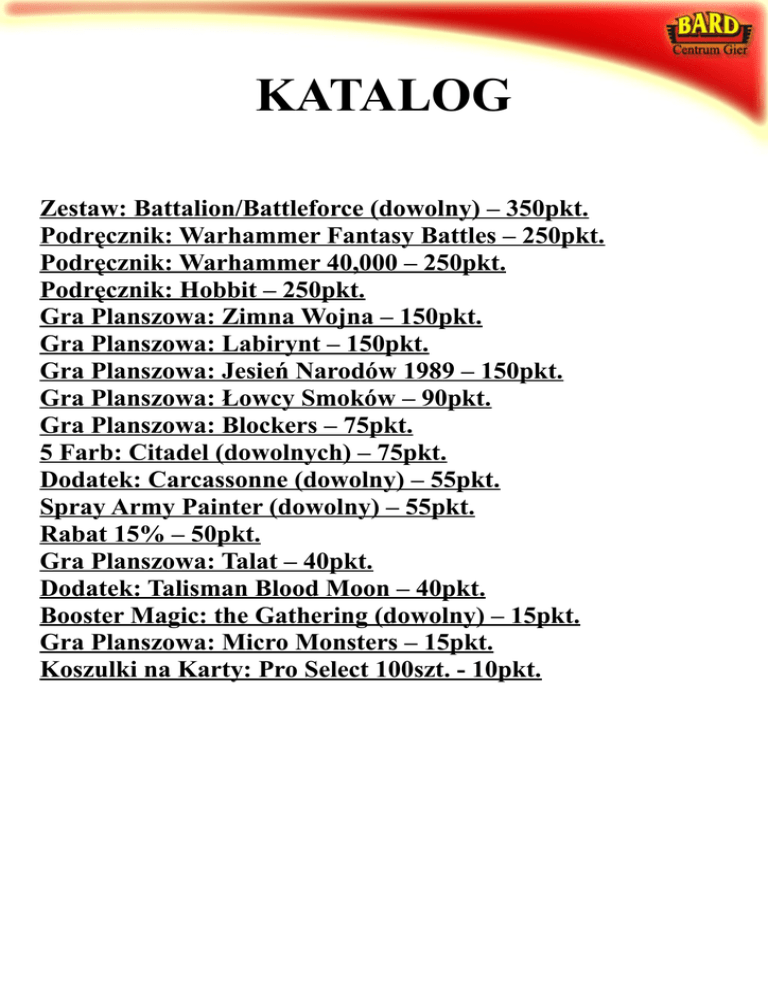 KATALOG Zestaw: Battalion/Battleforce (dowolny) – 350pkt. Podręcznik: Warhammer Fantasy Battles – 250pkt. Podręcznik: Warhammer 40,000 – 250pkt. Podręcznik: Hobbit – 250pkt. Gra Planszowa: Zimna Wojna – 150pkt. Gra Planszowa: Labirynt – 150pkt. Gra Planszowa: Jesień Narodów 1989 – 150pkt. Gra Planszowa: Łowcy Smoków – 90pkt. Gra Planszowa: Blockers – 75pkt. 5 Farb: Citadel (dowolnych) – 75pkt. Dodatek: Carcassonne (dowolny) – 55pkt. Spray Army Painter (dowolny) – 55pkt. Rabat 15% – 50pkt. Gra Planszowa: Talat – 40pkt. Dodatek: Talisman Blood Moon – 40pkt. Booster Magic: the Gathering (dowolny) – 15pkt. Gra Planszowa: Micro Monsters – 15pkt. Koszulki na Karty: Pro Select 100szt. - 10pkt. Zestaw: Battleforce Warhammer 40,000 Battleforce do dowolnej armii z Warhammer 40,000 350pkt. Zestaw: Battalion Warhammer Fantasy Battles Battalion do dowolnej armii z Warhammer Fantasy Battles 350pkt. Podręcznik Główny: Warhammer Fantasy Battles 250pkt. Podręcznik Główny: Warhammer 40,000 250pkt. Podręcznik Główny: Hobbit Strategy Battle Game 250pkt. Gra Planszowa: Zimna Wojna 150pkt. „Zimna wojna 1945-1989” jest grą dla dwóch graczy, odwzorowującą czterdziestopięcioletni taniec intryg, wpływów i konfliktów zbrojnych między ZSRR i USA. Cały świat jest szachownicą, na której tych dwóch tytanów przesuwa pionki. Gra rozpoczyna się pośród ruin Europy, kiedy dwa supermocarstwa ścierają się o powojenne zgliszcza, a kończy się w 1989, kiedy na scenie pozostały już tylko Stany Zjednoczone. Gra Planszowa: Labirynt Wojna z Terroryzmem 2001-? 150pkt. Gra oparta na mechanice bestsellerowej gry Zimna Wojna 1945-1989. Odwzorowuje zarówno walkę z terroryzmem jak i szerszy konflikt ideologiczny - wojnę partyzancką, zmiany reżimów, demokratyzację i wiele innych aspektów. Gra łączy mechanikę gry opartej na kartach ze złożoną symulacją strategiczną. Gra Planszowa: Jesień Narodów 1989 150pkt. Kolejna część bestsellerowej serii gier strategicznych, opartych na zasadach legendarnej Zimnej Wojny. Stanowi to niepodważalną gwarancję jakości. Nowe elementy, które wprowadza 1989 zadowolą zarówno starych, jak i nowych fanów Zimnej Wojny oraz Labiryntu. Gra posiada wyjątkowy klimat i fabułę: dotyka wydarzeń z przełomu lat 80 i 90 w Europie Wschodniej. Jak dotychczas jest to słabo wykorzystany okres historyczny na polu gier planszowych, nie licząc rynku polskiego, który jednak nie skupia się zazwyczaj na szerszym kontekście. 1989 zarysowuje wspomniany szerszy kontekst, a nasza edycja została specjalnie przygotowana w taki sposób, by idealnie łączyć spojrzenie na losy świata i Polski. Gra została objęta specjalnym patronatem IPN. Mechanika i fabuła gry skupiają się na walce między różnymi grupami społecznymi. Dzięki temu wojna toczy się na polu idei, a nie jest próbą sił zbrojnych. Powoduje to, że gra nabiera jedynego w swoim rodzaju charakteru. Grę cechuje przygotowane z pietyzmem wykonanie: plansza i żetony z grubej tektury oraz starannie przygotowane tłumaczenie, oddające najdrobniejsze szczegóły kontekstu fabularnego. Końcowy produkt zadowoli nawet najbardziej wymagających graczy i kolekcjonerów. Gra Planszowa: Łowcy Smoków Łowcy smoków to gra o przebiegłości i dyplomacji w świecie, gdzie za każdym rogiem spotykamy smoki. Każdy z graczy prowadzi drużynę łowców smoków - wojowniczkę, rycerza, złodzieja i czarodzieja. Jak wszyscy pogromcy smoków, mają oni tylko jeden cel. Zdobyć mnóstwo magicznych przedmiotów i łupów! Samo zabicie smoka to tylko początek. Najtrudniejsza część zadania zaczyna się kiedy opadnie pył, a smok leży pokonany. Właśnie wtedy trzeba uzgodnić podział łupów! Jeżeli gracze tego nie uczynią zanim upłynie wyznaczony czas, skarby przepadną. Kiedy zabite zostaną wszystkie smoki, a skarby zostaną podzielone lub przepadną, gra się kończy. Następnie gracze zliczają punkty za swoje zdobycze. Gra została wydana w ekskluzywnym metalowym opakowaniu! 90pkt. Gra Planszowa: Blockers 75pkt. Celem gry jest tworzenie połączonych grup własnych płytek na planszy, jednocześnie unikając schwytania zbyt wielu płytek tego samego koloru. Grupą określa się dowolny połączony zestaw płytek tego samego koloru, znajdujący się na planszy. Nie liczą się połączenia poprowadzone na skos. Pojedyncza płytka, nie połączona z żadnymi innymi płytkami tej samej barwy, również traktowana jest jak grupa. Na zakończenie gry uczestnik zlicza wszystkie grupy posiadane na stole oraz wszystkie płytki tego samego koloru, jakich schwytał najwięcej przez całą partię. Zwycięzcą zostaje ten, kto posiada najmniejszą liczbę elementów z obu tych zbiorów (najmniej własnych grup i schwytanych płytek). 5 Dowolnych Farb: Citadel 75pkt. Dodatek: Carcassonne Dowolny dodatek spośród: - KARCZMY I KATEDRY - KUPCY I BUDOWNICZOWIE - KSIĘŻNICZKA I SMOK - MOSTY ZAMKI I BAZARY - OPACTWO I BURMISTRZ - HRABIA, KRÓL I RZEKA - OWCE I WZGÓRZA 55pkt. Spray Podkładowy Army Painter: 55pkt. Doskonała formuła łącząca podkład i kolorowy spray w jednym, zaprojektowana z myślą o figurkach metalowych i plastikowych. Dodatkowy pigment pozwala na lepsze pokrycie malowanej powierzchni. Kolor pozostaje matowy, pozostając doskonałym podkładem. Produkty serii Prime są farbami akrylowymi,matowymi i szybkoschnącymi. Rabat 15% Na zakup nie przekraczający początkowej kwoty 200zł 50pkt. Gra Planszowa: Talat 40pkt! Talat to gra strategiczna zaprojektowana specjalnie z myślą o trzech graczach. Każda para dzieli ze sobą planszę, co powoduje, że uczestniczy się w dwóch grach na raz, ale obserwować należy wszystkie trzy! Cel rozgrywki jest bardzo prosty: zbić jak najwięcej figur przeciwnika lub dotrzeć na przeciwległą stronę planszy, nim wszystkim graczom zabraknie ruchów. Czy jesteś gotowy, by wygrać dwie partie jednocześnie? Świetn