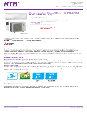 MTM Dariusz Seferyński ul. Młodnicka 52 C 04-239 Warszawa +48 22 353-11-11, 353-22-22, fax. 879-83-83 Klimatyzator ścienny Mitsubishi Electric MSZ-EF35VEW/MUZEF35VE (3,5/4,0 KW) - biały Producent: Mitsubishi Zastosowanie: Biuro,Dom,Firma,Hala produkcyjna,Lokale usługowe,Mieszkanie,Pomieszczenia inne,Pomieszczenia socjalne,Pracownia,Warsztat Wysyłka / termin 24h realizacji: Rodzaj urządzenia: Klimatyzator ścienny Cena brutto: 6 949,50 PLN Cena promocyjna Klimatyzator marki MITSUBISHI z serii M to udany mariaż wysokiej jakości urządzeń z atrakcyjnym wyglądem i bardzo dobrym stosunkiem ceny do funkcjonalności. ZESTAW: 1 x jednostka wewnętrzna + 1 x jednostka zewnętrzna + pilot Seria M Premium to produkty do domów rodzinnych i niewielkich powierzchni biurowych, przeznaczone dla szczególnie wymagających Klientów, wyposażone w zaawansowaną technologię sterowania, wysoko sprawne filtry powietrza i samodezynfekcję. Agregaty, które pracują w tej klasie rozwiązań, odznaczają się najwyższymi współczynnikami efektywności chłodniczej i grzewczej, co pozwala na dużą oszczędność energii. Kimatyzator serii MSZ-EF stworzony jako uzupełnienie dla nowoczesnych wystrojów wnętrz dostępny jest w trzech kolorach, gwarantujących naturalne dopasowanie, niezależnie od miejsca montażu. Charakterystyka serii MSZ-EF: Typoszereg stylowych modeli dopasowanych do każdego wystroju wnętrz. Jednostki wewnętrzne o opływowych kształtach charakteryzują wymowne srebrne, ukośne krawędzie, podkreślające wyszukany styl i jakość. W połączeniu z imponująco niskim zużyciem energii i cichą pracą oraz wysoką wydajnością, urządzenia te stanowią najlepsze uzupełnienie zróżnicowanej architektury wnętrz, gwarantując jednocześnie maksymalną oszczędność miejsca i energii. Energooszczędna praca Wszystkie modele serii osiągnęły „Klasę A” według klasyfikacji energooszczędności, przyczyniając się do obniżenia zużycia energii w domach, biurach i wielu innych obiektach. Typoszereg obejmuje modele z szerokiego zakresu wydajności i możliwości montażu, ogrom zastosowań gwarantuje idealne dopasowanie do potrzeb każdego użytkownika. Komfort ciszy przez cały dzień. Zaawansowana nastawa obrotów wentylatora „Tryb cichej pracy”, zapewnia super cichą pracę na poziomie 21dB dla modeli EF18/22/25/35. Ta wyjątkowa funkcja czyni serię Kirigamine ZEN, idealnym rozwiązaniem w każdej sytuacji. http://www.firmamtm.pl Program AptusShop6 MTM Dariusz Seferyński ul. Młodnicka 52 C 04-239 Warszawa +48 22 353-11-11, 353-22-22, fax. 879-83-83 Oszczędny tryb czuwania. Urządzenia klimatyzacyjne zużywają energię elektryczną nawet w czasie, gdy nie pracują (w tzw. trybie czuwania). Mitsubishi Electric oprócz obniżenia ilości zużywanej energii podczas pracy jednostki, nie zapomniało o obniżeniu energii zużywanej podczas trybu czuwania. Koncepcja najwyższej klasy wyglądu zewnętrznego i funkcjonalności. Jednostki wewnętrzne MSZ-EF zachowują smukły kształt nawet podczas pracy. Jedyna zauważalna zmiana to ruchomy wylot powietrza. Urządzenie zachowuje swój atrakcyjny wygląd przez cały czas. Klimatyzator MITSUBISHI Kirigamine Zen - YouTube Właściwości: • • • • • • • • • • • • • • DC Inwerter – płynna regulacja mocy Pompa ciepła Antyalergiczny, elektrostatyczny filtr enzymowy (opcja) Filtr Nano Platinum Automatyczna praca żaluzji Automatyczna zmiana trybu pracy Automatyczny restart Automatyczna prędkość wentylatora Programator czasu włączenia/wyłączenia Tryb oszczędny Funkcja samodiagnostyki urządzenia Sygnalizacja błędu Ekonomiczne chłodzenie Pilot bezprzewodowy http://www.firmamtm.pl Program AptusShop6 MTM Dariusz Seferyński ul. Młodnicka 52 C 04-239 Warszawa +48 22 353-11-11, 353-22-22, fax. 879-83-83 Gwarancja: do 5 lat NA TERENIE WARSZAWY PROMOCYJNE CENY NA MONTAŻ KLIMATYZACJI Montaż podstawowy tylko 800 zł. netto!!! ZADZWOŃ I UMÓW SIĘ NA OGLĘDZINY Z TECHNIKIEM. Kilka słów o marce: Mitsubishi to „dziecko” Yataro Iwasaki, który w 1870 roku założył firmę transportową, czarterując trzy statki parowe. Pierwotnie firma nazywała się Tsukumo Shokai, dwa lata później zmieniono nazwę na Mitsukawa Shokai, zaś w roku 1874 firma uzyskała ostateczną nazwę MITSUBISHI. Przez lata firma rozwijała się i różnicowała prowadzoną działalność. W roku 1921, w Tokio, powstała półautonomiczna część firmy, pod nazwą MITSUBISHI ELECTRIC, która miała się zajmować maszynami elektrycznymi i sprzętem gospodarstwa domowego. W szybkim czasie Mitsubishi Electric stała się liderem w tej branży na rodzimym rynku. W roku 1954 założono dział klimatyzacji i fabrykę opuścił pierwszy w Japonii ścienny klimatyzator typu SPLIT. Od tamtej chwili Mitsubishi niezmiennie dba o najwyższą jakość i niezawodność swoich produktów, a znak trzech diamentów, uosabiający dziś przeszło 140-letnią dobrą tradycję, zdobywa zaufanie ludzi na całym świecie. Klimatyzacja Mitsubishi Electric to nie tylko najnowsza technologia, to również unikalne rozwiązania oraz innowacyjne funkcje i nowoczesne, eleganckie wzornictwo. To także coraz większe możliwości, oszczędności oraz dbałość o ochronę środowiska. Klimatyzacja Mitsubishi Electric to kompleksowe rozwiązania dla domu oraz przemysłu. Firma oferuje urządzenia klimatyzacji komfortu, klimatyzacji naściennej, klimatyzacji przypodłogowej, klimatyzacji kanałowej oraz kasetonowej. Wszystkie te modele dostępne są w wersji Split, czyli do jednego pomieszczenia, oraz w wersji Multi Split, czyli do kilku pomieszczeń przy tylko jednej jednostce zewnętrznej. Klimatyzacja Mitsubishi Electric za swoje produkty otrzymuje cenione w świecie klimatyzacji i wentylacji nagrody Product Design Award 2011, tj. Technical Prize od Japońskiego Stowarzyszenia Chłodnictwa (Japanese Association of Refrigeration), Awarded Energ