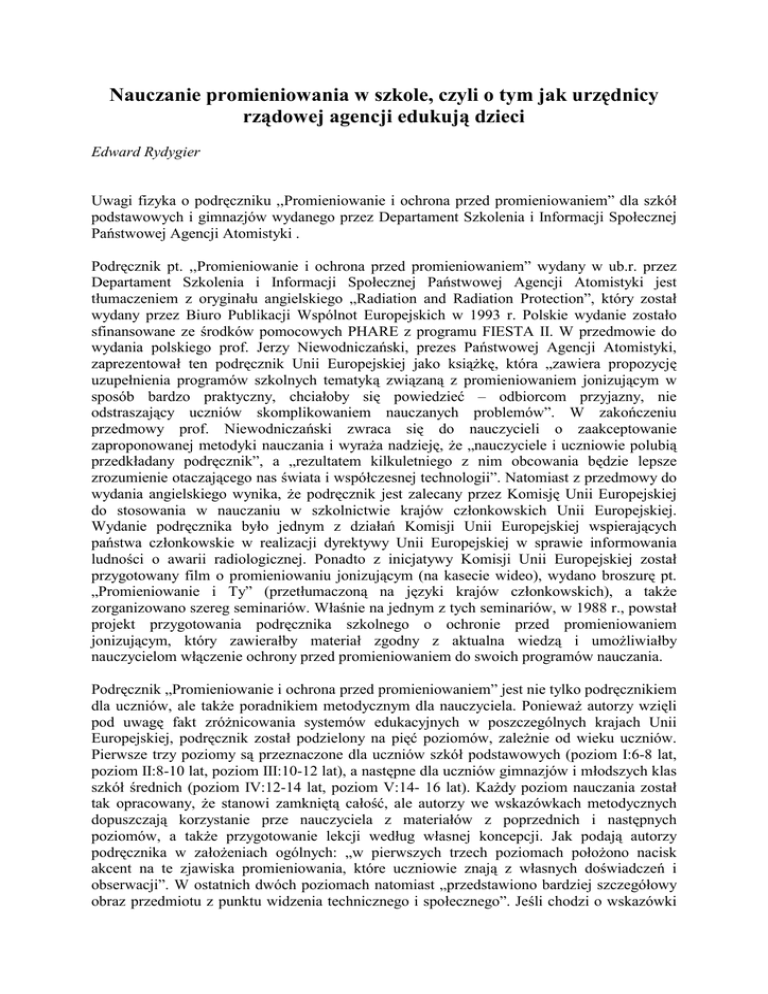 Nauczanie promieniowania w szkole, czyli o tym jak urzędnicy rządowej agencji edukują dzieci Edward Rydygier Uwagi fizyka o podręczniku ,,Promieniowanie i ochrona przed promieniowaniem” dla szkół podstawowych i gimnazjów wydanego przez Departament Szkolenia i Informacji Społecznej Państwowej Agencji Atomistyki . Podręcznik pt. ,,Promieniowanie i ochrona przed promieniowaniem” wydany w ub.r. przez Departament Szkolenia i Informacji Społecznej Państwowej Agencji Atomistyki jest tłumaczeniem z oryginału angielskiego „Radiation and Radiation Protection”, który został wydany przez Biuro Publikacji Wspólnot Europejskich w 1993 r. Polskie wydanie zostało sfinansowane ze środków pomocowych PHARE z programu FIESTA II. W przedmowie do wydania polskiego prof. Jerzy Niewodniczański, prezes Państwowej Agencji Atomistyki, zaprezentował ten podręcznik Unii Europejskiej jako książkę, która „zawiera propozycję uzupełnienia programów szkolnych tematyką związaną z promieniowaniem jonizującym w sposób bardzo praktyczny, chciałoby się powiedzieć – odbiorcom przyjazny, nie odstraszający uczniów skomplikowaniem nauczanych problemów”. W zakończeniu przedmowy prof. Niewodniczański zwraca się do nauczycieli o zaakceptowanie zaproponowanej metodyki nauczania i wyraża nadzieję, że „nauczyciele i uczniowie polubią przedkładany podręcznik”, a „rezultatem kilkuletniego z nim obcowania będzie lepsze zrozumienie otaczającego nas świata i współczesnej technologii”. Natomiast z przedmowy do wydania angielskiego wynika, że podręcznik jest zalecany przez Komisję Unii Europejskiej do stosowania w nauczaniu w szkolnictwie krajów członkowskich Unii Europejskiej. Wydanie podręcznika było jednym z działań Komisji Unii Europejskiej wspierających państwa członkowskie w realizacji dyrektywy Unii Europejskiej w sprawie informowania ludności o awarii radiologicznej. Ponadto z inicjatywy Komisji Unii Europejskiej został przygotowany film o promieniowaniu jonizującym (na kasecie wideo), wydano broszurę pt. „Promieniowanie i Ty” (przetłumaczoną na języki krajów członkowskich), a także zorganizowano szereg seminariów. Właśnie na jednym z tych seminariów, w 1988 r., powstał projekt przygotowania podręcznika szkolnego o ochronie przed promieniowaniem jonizującym, który zawierałby materiał zgodny z aktualna wiedzą i umożliwiałby nauczycielom włączenie ochrony przed promieniowaniem do swoich programów nauczania. Podręcznik „Promieniowanie i ochrona przed promieniowaniem” jest nie tylko podręcznikiem dla uczniów, ale także poradnikiem metodycznym dla nauczyciela. Ponieważ autorzy wzięli pod uwagę fakt zróżnicowania systemów edukacyjnych w poszczególnych krajach Unii Europejskiej, podręcznik został podzielony na pięć poziomów, zależnie od wieku uczniów. Pierwsze trzy poziomy są przeznaczone dla uczniów szkół podstawowych (poziom I:6-8 lat, poziom II:8-10 lat, poziom III:10-12 lat), a następne dla uczniów gimnazjów i młodszych klas szkół średnich (poziom IV:12-14 lat, poziom V:14- 16 lat). Każdy poziom nauczania został tak opracowany, że stanowi zamkniętą całość, ale autorzy we wskazówkach metodycznych dopuszczają korzystanie prze nauczyciela z materiałów z poprzednich i następnych poziomów, a także przygotowanie lekcji według własnej koncepcji. Jak podają autorzy podręcznika w założeniach ogólnych: „w pierwszych trzech poziomach położono nacisk akcent na te zjawiska promieniowania, które uczniowie znają z własnych doświadczeń i obserwacji”. W ostatnich dwóch poziomach natomiast „przedstawiono bardziej szczegółowy obraz przedmiotu z punktu widzenia technicznego i społecznego”. Jeśli chodzi o wskazówki metodyczne przeznaczone dla nauczyciela to znajdują się one na początku każdej lekcji i obejmują propozycje sposobów prowadzenia lekcji, podanie czasu na przyswojenie materiału, wyszczególnienie celów nauczania, odnośniki do odpowiednich rozdziałów w „Dodatku” oraz zestaw pytań i zadań z odpowiedziami. Partie materiału lekcji przeznaczone dla uczniów zawierają część opisową w formie czytanki (dla młodszych dzieci) lub artykułu popularyzatorskiego wraz z ilustracjami, tabelami i rysunkami (dla starszych dzieci), streszczenie materiału w punkcie: „Co warto zapamiętać” oraz na zakończenie pytania i zadania (bez odpowiedzi). Na końcu podręcznika znajduje się kompendium wiedzy o ochronie prze promieniowaniem zwane „Dodatkiem”. Znajdują się w nim podstawowe informacje o atomowej budowie materii, rodzajach promieniowania, własnościach promieniowania jonizującego, zastosowaniach techniki jądrowej i zasadach ochrony przed promieniowaniem jonizującym. Ponadto jest on uzupełniony o słownik terminów oraz bibliografię pozycji zagranicznych i w języku polskim, a także zamieszczone są adresy internetowe instytucji zagranicznych i polskich zajmujących się tematyka badań jądrowych, gdzie można zdobyć specjalistyczną wiedzę. Realizacja programu nauczania ma według autorów pozwolić osiągnąć dwa podstawowe cele: • • rozbudzenie zainteresowania uczniów zjawiskami, których występowania nie zawsze są świadomi; zaznajomienie uczniów z różnymi rodzajami promieniowania jonizującego i niejonizującego ze źródeł naturalnych i sztucznych. W odpowiedzi na apel Prezesa Państwowej Agencji Atomistyki skierowany do nauczycieli o zaakceptowanie zaproponowanej przez autorów podręcznika metodyki nauczania przedmiotu ochrona przed promieniowaniem, przedstawiam moje uwagi jako nauczyciela odnośnie zawartych w podręczniku treści i metod nauczania. Autorami podręcznika są dwaj konsultanci Komisji Unii Europejskiej: Jos Draijer, specjalista w kształceniu nauczycieli, i John Lakey, ekspert w dziedzinie ochrony przed promieniowaniem. Z informacji podanych w przedmowie przez Dyrektora XI Dyrektoriatu Komis