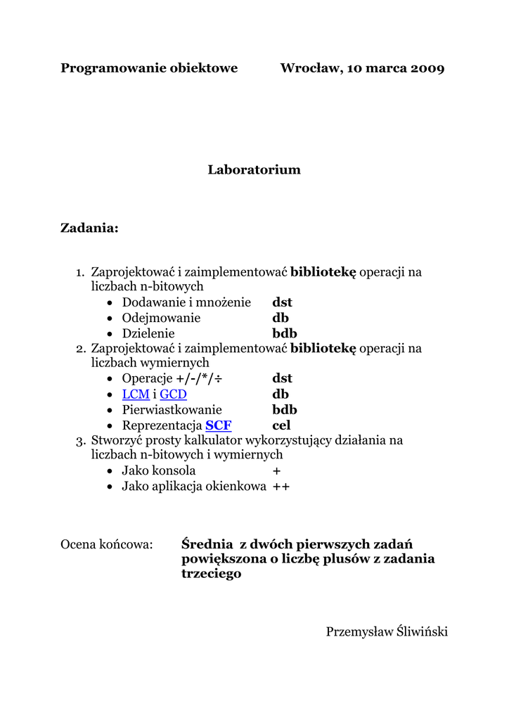 Programowanie obiektowe Wrocław, 10 marca 2009 Laboratorium Zadania: 1. Zaprojektować i zaimplementować bibliotekę operacji na liczbach n-bitowych • Dodawanie i mnożenie dst • Odejmowanie db • Dzielenie bdb 2. Zaprojektować i zaimplementować bibliotekę operacji na liczbach wymiernych • Operacje +/-/*/÷ dst • LCM i GCD db • Pierwiastkowanie bdb cel • Reprezentacja SCF 3. Stworzyć prosty kalkulator wykorzystujący działania na liczbach n-bitowych i wymiernych • Jako konsola + • Jako aplikacja okienkowa ++ Ocena końcowa: Średnia z dwóch pierwszych zadań powiększona o liczbę plusów z zadania trzeciego Przemysław Śliwiński