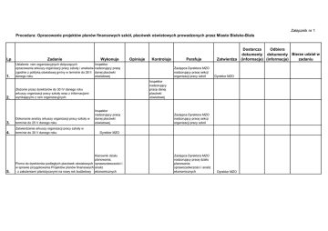 Załącznik nr 1 Procedura: Opracowanie projektów planów finansowych szkół, placówek oświatowych prowadzonych przez Miasto Bielsko-Biała Lp Zadanie 1. Ustalenie ram organizacyjnych dotyczących opracowania arkuszy organizacji pracy szkoły i aneksów zgodnie z polityką oświatową gminy w terminie do 28 II danego roku 2. Wykonuje Opiniuje Kontroluje Inspektor nadzorujący pracę danej placówki oświatowej Parafuje Zastępca Dyrektora MZO nadzorujący pracę sekcji organizacji pracy szkół Zatwierdza Dyrektor MZO Inspektor nadzorujący pracę danej placówki oświatowej Złożonie przez dyrektorów do 30 IV danego roku arkuszy organizacji pracy szkoły wraz z informacjami wynikającymi z ram organizacyjnych Inspektor nadzorujący pracę danej placówki oświatowej 3. Dokonanie analizy arkuszy organizacji pracy szkoły w terminie do 25 V danego roku 4. Zatwierdzenie arkuszy organizacji pracy szkoły w terminie do 30 V danego roku 5. Kierownik działu planowania, Pismo do dyrektorów podległych placówek oświatowych sprawozdawczości i w sprawie przygotowania Projektów planów finansowych analiz - z założeniami planistycznymi na nowy rok budżetowy ekonomicznych Zastępca Dyrektora MZO nadzorujący pracę sekcji organizacji pracy szkół Dyrektor MZO Zastępca Dyrektora MZO nadzorujący pracę działu planowania sprawozadwczości i analiz ekonomicznych Dyrektor MZO Dostarcza Odbiera dokumenty dokumenty Bierze udział w (informacje) (informacje) zadaniu 6. Inspektor nadzorujący pracę danej placówki oświatowej Złożenie przez dyrektorów podległych placówek do 20 VIII danego roku aneksów do zatwierdzonych arkuszy organizacji 8. Przeprowadzenie analizy aneksów oraz przygotowanie informacji dodatkowych wynikających z różnic w godzinach np.godzin nauczania indywidualnego w odniesieniu do analogicznego okresu roku ubiegłego na poszczególne typy szkół w terminie do 28 VIII danego roku * Zatwierdzenie aneksów przez dyrektora MZO w terminie do 1 IX danego roku 9. Specjalista w Dziale planowania, Przyjęcie do 15 IX danego roku od dyrektorów placówek sprawozdawczości i wydruków projektów planów wprowadzonych do analiz programu PABS ekonomicznych 10. Specjalista w Dziale planowania, Weryfikacja projektów planów finansowych podległych sprawozdawczości i placówek pod kątem poprawności danych, ilości etatów, analiz godzin (zgodność z arkuszem organizacyjnym) ekonomicznych Kierownik Działu planowania sprawozdawczo ści i analiz ekonomicznych 11. Przygotowanie zbiorczego zestawienia projektów planów finansowych do rozdziałów i paragrafów i przekazanie go do Wydziału Budżetu UM Specjalista w Dziale planowania, sprawozdawczości i analiz ekonomicznych Kierownik Działu planowania sprawozdawczo ści i analiz ekonomicznych Przyjęcie informacji z Wydziału Budżetu o przyznanej kwocie środków finansowych na następny rok budżetowy Kierownik Działu planowania sprawozdawczości i analiz ekonomicznych 7. 12. Inspektor nadzorujący pracę danej placówki oświatowej Specjalista działu planowania sprawozdawczości i analiz ekonomicznych Zastępca Dyrektora MZO nadzorujący pracę sekcji organizacji pracy szkół Dyrektor MZO Dyrektor placówki oświatowej Zastępca Dyrektora nadzorujący pracę działu planowania sprawozdawczości i analiz ekonomicznych Dyrektor MZO Skarbnik Miasta Skarbnik Miasta 13. Specjalista w Dziale planowania, Powtórna weryfikacja projektów planów w celu sprawozdawczości i dostosowania do wysokości przyznanych środków oraz analiz sporządzenie wstępnego BT i przekazanie do UM ekonomicznych Kierownik Działu planowania sprawozdawczo ści i analiz ekonomicznych Zastępca Dyrektora nadzorujący pracę działu planowania sprawozdawczości i analiz ekonomicznych Dyrektor MZO Naczelnik Wydziału Organizacji i Nadzoru 14. Pismo do Prezydenta Miasta zawierające zestawienie rzeczywistych potrzeb i przyznanych środków w celu wykazania niedoborów Specjalista w Dziale planowania, sprawozdawczości i analiz ekonomicznych Kierownik Działu planowania sprawozdawczo ści i analiz ekonomicznych Zastępca Dyrektora nadzorujący pracę działu planowania sprawozdawczości i analiz ekonomicznych Dyrektor MZO Skarbnik Miasta 15. Specjalista w Dziale planowania, sprawozdawczości i Sporządzenie w terminie do 22 XII danego roku BT 1 i analiz BT 2 do Uchwały Budżetowej i kalkulacji stanowiskowej ekonomicznych Kierownik Działu planowania sprawozdawczo ści i analiz ekonomicznych Zastępca Dyrektora nadzorujący pracę działu planowania sprawozdawczości i analiz ekonomicznych Dyrektor MZO Skarbnik Miasta 16. Specjalista w Dziale Wyłonienie w poszczególnych rozdziałach i paragrafach planowania, ** środków finansowych przeznaczonych na ewentualne sprawozdawczości i zwiększenia w planach placówek, wynikające z sytuacji, analiz ekonomicznych których nie można przewidzieć na etapie planowania Kierownik Działu planowania sprawozdawczo ści i analiz ekonomicznych Zastępca Dyrektora nadzorujący pracę działu planowania sprawozdawczości i analiz ekonomicznych Dyrektor MZO 17. Specjalista w Dziale planowania, sprawozdawczości i analiz ekonomicznych Kierownik Działu planowania sprawozdawczo ści i analiz ekonomicznych Zastępca Dyrektora nadzorujący pracę działu planowania sprawozdawczości i analiz ekonomicznych W terminie 21 dni od uchwalenia budżetu przekazanie placówkom ostatecznych kwot dochodów i wydatków Dyrektor MZO Dyrektor placówki oświatowej 18. Przyjęcie od dyrektorów placówek zarządzeń wprowadzających plany finansowe, sporządzonych na podstawie przekazanych z MZO informacji o ostatecznych kwotach Specjalista w Dziale planowania, sprawozdawczości i analiz ekonomicznych Dyrektor placówki oświatowej * Przy kolejnych aneksach - należy zachować tryb określony w punktach 7, 8 . Zatwierdzenie zmiany powinno nastąpić przed jej wprowadzeniem do realizacji. ** § 4010, 4110, 4120, 4170, 4270, 4140, 4260,