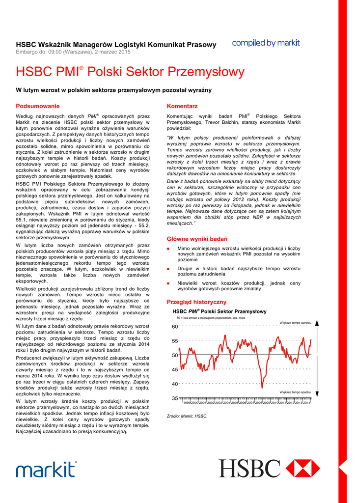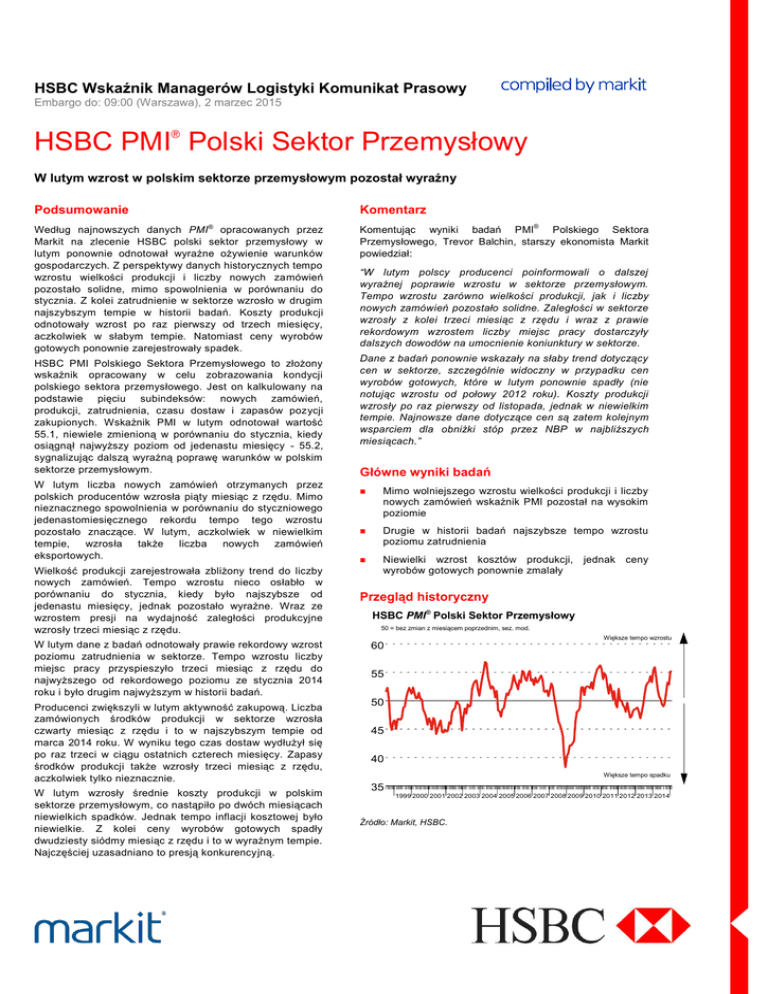 HSBC Wskaźnik Managerów Logistyki Komunikat Prasowy Embargo do: 09:00 (Warszawa), 2 marzec 2015 HSBC PMI Polski Sektor Przemysłowy W lutym wzrost w polskim sektorze przemysłowym pozostał wyraźny Podsumowanie Komentarz Według najnowszych danych PMI opracowanych przez Markit na zlecenie HSBC polski sektor przemysłowy w lutym ponownie odnotował wyraźne ożywienie warunków gospodarczych. Z perspektywy danych historycznych tempo wzrostu wielkości produkcji i liczby nowych zamówień pozostało solidne, mimo spowolnienia w porównaniu do stycznia. Z kolei zatrudnienie w sektorze wzrosło w drugim najszybszym tempie w historii badań. Koszty produkcji odnotowały wzrost po raz pierwszy od trzech miesięcy, aczkolwiek w słabym tempie. Natomiast ceny wyrobów gotowych ponownie zarejestrowały spadek. ® HSBC PMI Polskiego Sektora Przemysłowego to złożony wskaźnik opracowany w celu zobrazowania kondycji polskiego sektora przemysłowego. Jest on kalkulowany na podstawie pięciu subindeksów: nowych zamówień, produkcji, zatrudnienia, czasu dostaw i zapasów pozycji zakupionych. Wskaźnik PMI w lutym odnotował wartość 55.1, niewiele zmienioną w porównaniu do stycznia, kiedy osiągnął najwyższy poziom od jedenastu miesięcy - 55.2, sygnalizując dalszą wyraźną poprawę warunków w polskim sektorze przemysłowym. W lutym liczba nowych zamówień otrzymanych przez polskich producentów wzrosła piąty miesiąc z rzędu. Mimo nieznacznego spowolnienia w porównaniu do styczniowego jedenastomiesięcznego rekordu tempo tego wzrostu pozostało znaczące. W lutym, aczkolwiek w niewielkim tempie, wzrosła także liczba nowych zamówień eksportowych. Wielkość produkcji zarejestrowała zbliżony trend do liczby nowych zamówień. Tempo wzrostu nieco osłabło w porównaniu do stycznia, kiedy było najszybsze od jedenastu miesięcy, jednak pozostało wyraźne. Wraz ze wzrostem presji na wydajność zaległości produkcyjne wzrosły trzeci miesiąc z rzędu. Komentując wyniki badań PMI® Polskiego Sektora Przemysłowego, Trevor Balchin, starszy ekonomista Markit powiedział: “W lutym polscy producenci poinformowali o dalszej wyraźnej poprawie wzrostu w sektorze przemysłowym. Tempo wzrostu zarówno wielkości produkcji, jak i liczby nowych zamówień pozostało solidne. Zaległości w sektorze wzrosły z kolei trzeci miesiąc z rzędu i wraz z prawie rekordowym wzrostem liczby miejsc pracy dostarczyły dalszych dowodów na umocnienie koniunktury w sektorze. Dane z badań ponownie wskazały na słaby trend dotyczący cen w sektorze, szczególnie widoczny w przypadku cen wyrobów gotowych, które w lutym ponownie spadły (nie notując wzrostu od połowy 2012 roku). Koszty produkcji wzrosły po raz pierwszy od listopada, jednak w niewielkim tempie. Najnowsze dane dotyczące cen są zatem kolejnym wsparciem dla obniżki stóp przez NBP w najbliższych miesiącach.” Główne wyniki badań Mimo wolniejszego wzrostu wielkości produkcji i liczby nowych zamówień wskaźnik PMI pozostał na wysokim poziomie Drugie w historii badań najszybsze tempo wzrostu poziomu zatrudnienia Niewielki wzrost kosztów produkcji, wyrobów gotowych ponownie zmalały jednak ceny Przegląd historyczny HSBC PMI® Polski Sektor Przemysłowy 50 = bez zmian z miesiącem poprzednim, sez. mod. Większe tempo wzrostu W lutym dane z badań odnotowały prawie rekordowy wzrost poziomu zatrudnienia w sektorze. Tempo wzrostu liczby miejsc pracy przyspieszyło trzeci miesiąc z rzędu do najwyższego od rekordowego poziomu ze stycznia 2014 roku i było drugim najwyższym w historii badań. 60 Producenci zwiększyli w lutym aktywność zakupową. Liczba zamówionych środków produkcji w sektorze wzrosła czwarty miesiąc z rzędu i to w najszybszym tempie od marca 2014 roku. W wyniku tego czas dostaw wydłużył się po raz trzeci w ciągu ostatnich czterech miesięcy. Zapasy środków produkcji także wzrosły trzeci miesiąc z rzędu, aczkolwiek tylko nieznacznie. 50 W lutym wzrosły średnie koszty produkcji w polskim sektorze przemysłowym, co nastąpiło po dwóch miesiącach niewielkich spadków. Jednak tempo inflacji kosztowej było niewielkie. Z kolei ceny wyrobów gotowych spadły dwudziesty siódmy miesiąc z rzędu i to w wyraźnym tempie. Najczęściej uzasadniano to presją konkurencyjną. 35 55 45 40 Większe tempo spadku 1999 2000 2001 2002 2003 2004 2005 2006 2007 2008 2009 2010 2011 2012 2013 2014 Źródło: Markit, HSBC. Po dalsze informacje prosimy o kontakt: HSBC Agata Urbańska-Giner Economist Central & Eastern Europe Telefon +44-207-992-2774 Email: [email protected] Magdalena Ujda-Tarczynska Communication Manager HSBC Bank Polska SA Telefon: +48-22-354-0644 / +48 696 070 388 Email: [email protected] Markit Trevor Balchin, Senior Economist Telefon: +44-1491-461-065 Email: [email protected] Joanna Vickers, Corporate Communications Telefon +44-207-260-2234 Email: [email protected] Ewelina Nizioł, Poland Panel Manager Telefon: +44-1491-461-041 Email: [email protected] Uwagi na temat danych: Raport HSBC Polski Sektor Przemysłowy jest oparty na danych opracowanych na podstawie miesięcznych odpowiedzi na kwestionariusze przesyłane kadrze kierowniczej w ponad 200 firmach produkcyjnych. Grupa respondentów ustalana jest według położenia geograficznego i według międzynarodowej standardowej klasyfikacji branżowej – w oparciu o udział branży w PKB. Odpowiedzi uzyskane podczas badania odzwierciedlają ewentualne zmiany w bieżącym miesiącu w porównaniu z miesiącem poprzednim, opierając się na danych zebranych w połowie miesiąca. Dla każdego wskaźnika raport podaje procent respondentów udzielających każdą odpowiedź, różnicę netto pomiędzy ilością odpowiedzi wyższy/lepszy, a odpowiedzi niższy/gorszy oraz wskaźnik dyfuzji. Wskaźnik jest sumą pozytywnych odpowiedzi plus połową odpowiedzi, które są ‘takie same’. ® Wskaźnik Managerów Logistyki (PMI ) jest wska