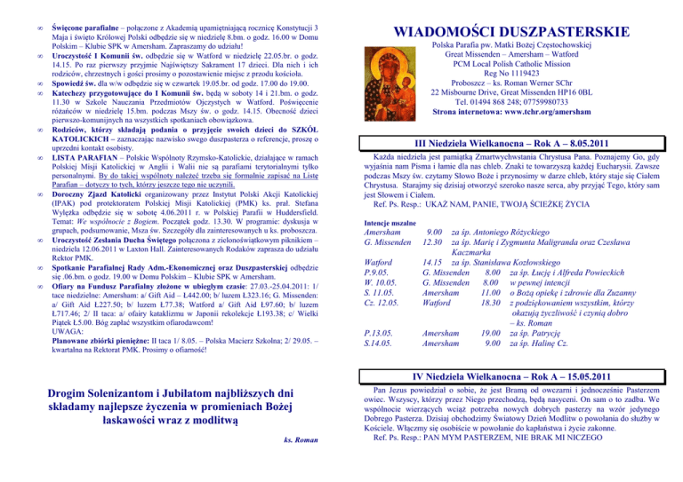 • • • • • • • • • • Święcone parafialne – połączone z Akademią upamiętniającą rocznicę Konstytucji 3 Maja i święto Królowej Polski odbędzie się w niedzielę 8.bm. o godz. 16.00 w Domu Polskim – Klubie SPK w Amersham. Zapraszamy do udziału! Uroczystość I Komunii św. odbędzie się w Watford w niedzielę 22.05.br. o godz. 14.15. Po raz pierwszy przyjmie Najświętszy Sakrament 17 dzieci. Dla nich i ich rodziców, chrzestnych i gości prosimy o pozostawienie miejsc z przodu kościoła. Spowiedź św. dla w/w odbędzie się w czwartek 19.05.br. od godz. 17.00 do 19.00. Katechezy przygotowujące do I Komunii św. będą w soboty 14 i 21.bm. o godz. 11.30 w Szkole Nauczania Przedmiotów Ojczystych w Watford. Poświęcenie różańców w niedzielę 15.bm. podczas Mszy św. o godz. 14.15. Obecność dzieci pierwszo-komunijnych na wszystkich spotkaniach obowiązkowa. Rodziców, którzy składają podania o przyjęcie swoich dzieci do SZKÓŁ KATOLICKICH – zaznaczając nazwisko swego duszpasterza o referencje, proszę o uprzedni kontakt osobisty. LISTA PARAFIAN – Polskie Wspólnoty Rzymsko-Katolickie, działające w ramach Polskiej Misji Katolickiej w Anglii i Walii nie są parafiami terytorialnymi tylko personalnymi. By do takiej wspólnoty należeć trzeba się formalnie zapisać na Listę Parafian – dotyczy to tych, którzy jeszcze tego nie uczynili. Doroczny Zjazd Katolicki organizowany przez Instytut Polski Akcji Katolickiej (IPAK) pod protektoratem Polskiej Misji Katolickiej (PMK) ks. prał. Stefana Wylężka odbędzie się w sobotę 4.06.2011 r. w Polskiej Parafii w Huddersfield. Temat: We wspólnocie z Bogiem. Początek godz. 13.30. W programie: dyskusja w grupach, podsumowanie, Msza św. Szczegóły dla zainteresowanych u ks. proboszcza. Uroczystość Zesłania Ducha Świętego połączona z zielonoświątkowym piknikiem – niedziela 12.06.2011 w Laxton Hall. Zainteresowanych Rodaków zaprasza do udziału Rektor PMK. Spotkanie Parafialnej Rady Adm.-Ekonomicznej oraz Duszpasterskiej odbędzie się .06.bm. o godz. 19.00 w Domu Polskim – Klubie SPK w Amersham. Ofiary na Fundusz Parafialny złożone w ubiegłym czasie: 27.03.-25.04.2011: 1/ tace niedzielne: Amersham: a/ Gift Aid – Ł442.00; b/ luzem Ł323.16; G. Missenden: a/ Gift Aid Ł227.50; b/ luzem Ł77.38; Watford a/ Gift Aid Ł97.60; b/ luzem Ł717.46; 2/ II taca: a/ ofairy kataklizmu w Japonii rekolekcje Ł193.38; c/ Wielki Piątek Ł5.00. Bóg zapłać wszystkim ofiarodawcom! UWAGA: Planowane zbiórki pieniężne: II taca 1/ 8.05. – Polska Macierz Szkolna; 2/ 29.05. – kwartalna na Rektorat PMK. Prosimy o ofiarność! WIADOMOŚCI DUSZPASTERSKIE Polska Parafia pw. Matki Bożej Częstochowskiej Great Missenden – Amersham – Watford PCM Local Polish Catholic Mission Reg No 1119423 Proboszcz – ks. Roman Werner SChr 22 Misbourne Drive, Great Missenden HP16 0BL Tel. 01494 868 248; 07759980733 Strona internetowa: www.tchr.org/amersham III Niedziela Wielkanocna – Rok A – 8.05.2011 Każda niedziela jest pamiątką Zmartwychwstania Chrystusa Pana. Poznajemy Go, gdy wyjaśnia nam Pisma i łamie dla nas chleb. Znaki te towarzyszą każdej Eucharysii. Zawsze podczas Mszy św. czytamy Słowo Boże i przynosimy w darze chleb, który staje się Ciałem Chrystusa. Starajmy się dzisiaj otworzyć szeroko nasze serca, aby przyjąć Tego, który sam jest Słowem i Ciałem. Ref. Ps. Resp.: UKAŻ NAM, PANIE, TWOJĄ ŚCIEŻKĘ ŻYCIA Intencje mszalne Amersham G. Missenden Watford P.9.05. W. 10.05. S. 11.05. Cz. 12.05. P.13.05. S.14.05. za śp. Antoniego Różyckiego za śp. Marię i Zygmunta Maligranda oraz Czesława Kaczmarka 14.15 za śp. Stanisława Kozłowskiego G. Missenden 8.00 za śp. Łucję i Alfreda Powieckich G. Missenden 8.00 w pewnej intencji Amersham 11.00 o Bożą opiekę i zdrowie dla Zuzanny Watford 18.30 z podziękowaniem wszystkim, którzy okazują życzliwość i czynią dobro – ks. Roman Amersham 19.00 za śp. Patrycję Amersham 9.00 za śp. Halinę Cz. 9.00 12.30 IV Niedziela Wielkanocna – Rok A – 15.05.2011 Drogim Solenizantom i Jubilatom najbliższych dni składamy najlepsze życzenia w promieniach Bożej łaskawości wraz z modlitwą ks. Roman Pan Jezus powiedział o sobie, że jest Bramą od owczarni i jednocześnie Pasterzem owiec. Wszyscy, którzy przez Niego przechodzą, będą nasyceni. On sam o to zadba. We wspólnocie wierzących wciąż potrzeba nowych dobrych pasterzy na wzór jedynego Dobrego Pasterza. Dzisiaj obchodzimy Światowy Dzień Modlitw o powołania do służby w Kościele. Włączmy się osobiście w powołanie do kapłaństwa i życie zakonne. Ref. Ps. Resp.: PAN MYM PASTERZEM, NIE BRAK MI NICZEGO Intencje mszalne Amersham 9.00 z podziękowaniem za otrzymane łaski z prośbą o błogosławieństwo Boże dla całej rodziny 12.30 za śp. Chris Day’s 14.15 za śp. Ignacego Wesołowskiego – od żony i dzieci G. Missenden 8.00 dziękczynna za dar kapłaństwa G. Missenden 8.00 Amersham 11.00 dziękczynna za dar kapłaństwa Watford 19.00 w pewnej intencji Amersham 19.00 za św. Jana Pawła Chyła (6 rocz.) Amersham 9.00 w pewnej intencji G. Missenden Watford P.16.05. W. 17.05. S. 18.05. Cz. 19.05. P. 20.05. S.21.05. V Niedziela Wielkanocna – Rok A – 22.05.2011 W czasie wielkanocnym gromadzimy się na Eucharystii, aby dziękować Jezusowi za łaskę zbawienia. Przez zmartwychwstanie Chrystusa zostało na nowo otwarte Niebo i każdy otrzymuje zaproszenie do zajęcia tam miejsca, które Bóg przygotował specjalnie dla nas. Prawdziwą drogą do Nieba jest sam Zbawiciel ukazujący nam Ojca. Przyjmijmy pouczenie Pana skierowane do nas dzisiaj. Ref. Ps. Resp.: MAMY NADZIEJĘ W MIŁOSIERDZIE PANA Intencje mszalne 9.00 za śp. Władysława Lentowicza (32 rocz.) – od żony i córki 12.30 14.15 w intencji dzieci I komunijnych oraz ich rodziców G. Missenden 8.00 G. Missenden 8.00 Amersham 11.00 w pewnej intencji Watford 19.00 Amersham 19.00 w pew