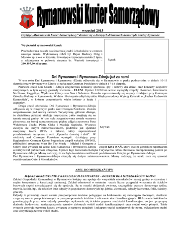 wrzesień 2013 Czytając „Rymanowski Kurier Samorządowy” dowiesz się o bieżących działaniach Samorządu Gminy Rymanów Wypiękniał rymanowski Rynek Przebudowana została nawierzchnia jezdni i chodników w centrum naszego miasta. Wykonawcą robót był Rejon Budowy Dróg i Mostów sp. z o.o w Krośnie. Inwestycja rozpoczęta została 2 lipca, a zakończona w połowie sierpnia br. Wartość inwestycji – 299 397,99 zł brutto. Rynek Dni Rymanowa i Rymanowa-Zdroju już za nami W tym roku Dni Rymanowa i Rymanowa -Zdroju odbywały się w Rymanowie w parku podworskim w dniach 10-11 sierpnia oraz w Rymanowie-Zdroju w parku nad Czarnym Potokiem w dniach 17-18 sierpnia. Pierwsza część Dni Miasta i Zdroju obejmowała konkursy sportowe, gry i zabawy dla dzieci oraz koncerty zespołów muzycznych, w tym występ gwiazdy wieczoru – ELENI. Oprócz ELENI na scenie wystąpiły zespoły: Rosarian, Karczmarze Na Nowo, Raggafaya, Wędrowne Gitary oraz Sara i Salvatore. Ponadto zaprezentowały się zespoły działające przy Gminnym Ośrodku Kultury w Rymanowie. W dniu 10 sierpnia odbył się także Międzynarodowy Wyścig Kolarski o „Puchar Uzdrowisk Karpackich”, w którym uczestniczyło wielu kolarzy z kraju i zagranicy. Druga część obchodów Dni Rymanowa i Rymanowa-Zdroju odbywała się w zdrojowym parku nad Czarnym Potokiem. Została zorganizowana pod nazwą Jarmark Turystyczny, głównie dlatego, że chcieliśmy pokazać atrakcje turystyczne, jakie znajdują się na terenie naszej gminy. W tym celu zorganizowana została wystawa plenerowa, na której zaprezentowano piękne zdjęcia autorstwa Pana Waldemara Czado, Piotra Ciska i Macieja Szpiecha. Wystawa cieszyła się dużym zainteresowaniem, podobnie jak spektakl Krywań muzyczny teatru IWIA z Gliwic, który zaprezentował przedstawienie muzyczne z serii „Operetka dawniej i dziś”. W niedzielę nad Czarnym Potokiem wystąpili: działający przy Regionalnym Centrum Kultur Pogranicza zespół wokalny SWING, półfinaliści programu Must Be The Music – Michał i Grzegorz z Soliny oraz gwiazda tej części Dni Rymanowa i Rymanowa-Zdroju – zespół KRYWAŃ, który swoim góralskim repertuarem zelektryzował publiczność zdrojową. Oprócz tego kursowała Kolejka Turystyczna, która oferowała niezapomnianą podróż po Rymanowie-Zdroju. Mamy nadzieję, że nie była to ostatnia możliwość podróżowania Kolejką po Rymanowie-Zdroju. Dni Rymanowa i Rymanowa-Zdroju cieszyły się dużym zainteresowaniem. Mamy nadzieję, że udało nam się sprostać oczekiwaniom Gości i Mieszkańców. APEL DO MIESZKAŃCÓW MĄDRE KORZYSTANIE Z KANALIZACJI SANITARNEJ – DOBREM DLA MIESZKAŃCÓW GMINY Zakład Gospodarki Komunalnej w Rymanowie kolejny raz apeluje do wszystkich mieszkańców naszej gminy o rozważne i mądre korzystanie z kanalizacji sanitarnej. Zakład odnotował w ostatnim czasie liczne przypadki wrzucania do ścieków bytowych części nienadających się do spożycia. Są to resztki ubijanych zwierząt, szczególnie ptactwa domowego (pióra, trzewia, kości), itp., ale również inne odpady z gospodarstw domowych np. jabłka, ziemniaki, odpady kuchenne, folie, tkaniny, gruz itp. Odpady te powodują częste awarie przepompowni ścieków polegające na blokowaniu się rurociągów tłocznych, skutkiem czego są awarie pomp ściekowych w przepompowniach ścieków i zalewanie sieci kanalizacyjnych. Blokowanie kolektorów grawitacyjnych przez w/w odpady powoduje wylewanie się ścieków poprzez studzienki kanalizacyjne, co jest przyczyną skażenia środowiska, zanieczyszczenia terenów zielonych wokół studni kanalizacyjnych oraz studni wody pitnych. Takie sytuacje generują ogromne koszty związane z naprawą urządzeń i zakupem części zamiennych do pomp, odkażaniem studni oraz dezynfekcją terenu wokół studni. NIEROZSĄDNE UŻYTKOWANIE KANALIZACJI SANITARNEJ POWODUJE WIĘKSZE KOSZTY OCZYSZCZANIA ŚCIEKÓW BYTOWYCH, CO ZWIĘKSZA CENĘ NIECZYSTOŚCI, ZA KTÓRE WSZYSCY PŁACIMY Mając na względzie prawidłowe i nieawaryjne działanie dobra wspólnego, jakim jest kanalizacja sanitarna w Gminie Rymanów – apeluję o korzystanie z niej zgodnie z zasadami wynikającymi z jej przeznaczenia i nie traktowanie kanalizacji jako wysypiska wszelkich odpadów. W przypadku niedostosowania się do apelu ujawnieni sprawcy zostaną ukarani zgodnie z przepisami Ustawy z dnia 7 czerwca 2001 r. o zbiorowym zaopatrzeniu w wodę i zbiorowym odprowadzeniu ścieków. Dyrektor ZGK Rymanów Damian Rygiel ZMIANA MIEJSCA ODBIORU ODPADÓW PROBLEMOWYCH Zakład Gospodarki Komunalnej w Rymanowie będzie kontynuował zbiórkę zużytego sprzętu elektrycznego i elektronicznego AGD i RTV, odpadów wielkogabarytowych oraz opon na terenie gminy Rymanów zgodnie z obowiązującym harmonogramem. Innowacja wprowadzona od września br. będzie polegała na tym, że do tej pory mieszkańcy poszczególnych miejscowości dostarczali odpady problemowe na teren Domów Ludowych. Od września mieszkańcy całej gminy będą mogli wystawiać odpady problemowe (elektroodpady, odpady wielkogabarytowe i opony) w stałe miejsca dostarczania pozostałych odpadów komunalnych (zgodnie z obowiązującym harmonogramem). Zmiana spowodowana jest głównie tym, iż na terenie Domów Ludowych i wyznaczonych punktów do zbiórki tych odpadów powstawały dzikie niekontrolowane wysypiska śmieci. Niektórzy mieszkańcy nie stosowali się co do terminów wywozu odpadów i nieterminowo zwozili wszelakiego rodzaju odpady. Takim działaniem chcemy także wspomóc mieszkańców, którzy mieli kłopoty z dostarczeniem odpadów na teren Domów Ludowych. Uczulamy mieszkańców, że jeśli chodzi o odbiór sprzętu elektronicznego i elektrycznego, będziemy odbierać tylko i wyłącznie kompletne urządzenia (telewizory, lodówki, zamrażarki, odkurzacze, żelazka, komputery, sprzęt audio, telefony itp.) Samodzielne demontowanie urządzeń jest zabronione i karane zgodnie z Ustawą z dn