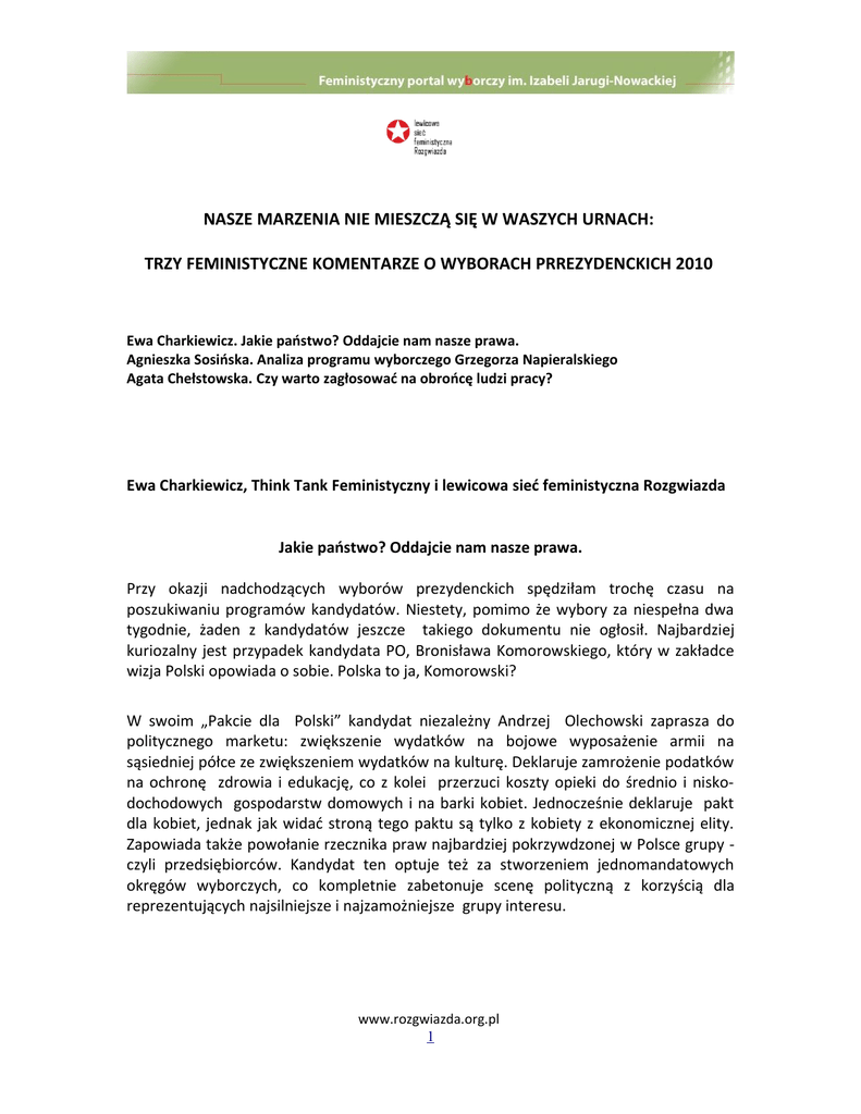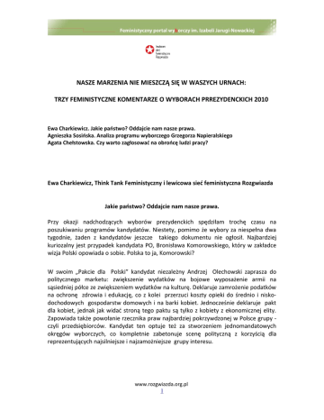 NASZE MARZENIA NIE MIESZCZĄ SIĘ W WASZYCH URNACH: TRZY FEMINISTYCZNE KOMENTARZE O WYBORACH PRREZYDENCKICH 2010 Ewa Charkiewicz. Jakie państwo? Oddajcie nam nasze prawa. Agnieszka Sosińska. Analiza programu wyborczego Grzegorza Napieralskiego Agata Chełstowska. Czy warto zagłosować na obrońcę ludzi pracy? Ewa Charkiewicz, Think Tank Feministyczny i lewicowa sieć feministyczna Rozgwiazda Jakie państwo? Oddajcie nam nasze prawa. Przy okazji nadchodzących wyborów prezydenckich spędziłam trochę czasu na poszukiwaniu programów kandydatów. Niestety, pomimo że wybory za niespełna dwa tygodnie, żaden z kandydatów jeszcze takiego dokumentu nie ogłosił. Najbardziej kuriozalny jest przypadek kandydata PO, Bronisława Komorowskiego, który w zakładce wizja Polski opowiada o sobie. Polska to ja, Komorowski? W swoim „Pakcie dla Polski” kandydat niezależny Andrzej Olechowski zaprasza do politycznego marketu: zwiększenie wydatków na bojowe wyposażenie armii na sąsiedniej półce ze zwiększeniem wydatków na kulturę. Deklaruje zamrożenie podatków na ochronę zdrowia i edukację, co z kolei przerzuci koszty opieki do średnio i niskodochodowych gospodarstw domowych i na barki kobiet. Jednocześnie deklaruje pakt dla kobiet, jednak jak widać stroną tego paktu są tylko z kobiety z ekonomicznej elity. Zapowiada także powołanie rzecznika praw najbardziej pokrzywdzonej w Polsce grupy czyli przedsiębiorców. Kandydat ten optuje też za stworzeniem jednomandatowych okręgów wyborczych, co kompletnie zabetonuje scenę polityczną z korzyścią dla reprezentujących najsilniejsze i najzamożniejsze grupy interesu. www.rozgwiazda.org.pl 1 Wypowiedzi programowe są fragmentaryczne i niespójne, a kandydaci zajmują się przede wszystkim polityką wizerunku. Zaczęłam się więc przyglądać kilku dokumentom programowym partii politycznych, bo właśnie w nich wizje Polski są zawarte. Wśród dokumentów Prawa i Sprawiedliwości znajduję ogłoszony w styczniu tego roku projekt Konstytucji. Jest to kolejna odsłona, bo PiS projekt radykalnej zmiany Konstytucji przedstawił już w 2005 roku. (Jego przygotowaniem kierował Kazimierz Ujazdowski, wówczas w PiS, obecnie w PO, a niezmiennie wczoraj, jak i dziś związany z Opus Dei.) W zasadzie można mówić o renowacji czy liftingu poprzedniego projektu Konstytucji, gdyby nie to, że w nowej wersji jest kilka bulwersujących zmian, w tym zniknięcie zapisu o prawach kobiet. Jak widać, feministyczna twarz PiSu, Joanna Kluzik Rostkowska służy dekoracji. W tegorocznym projekcie Konstytucji według PiS kobieta pojawia się tylko w kontekście definicji małżeństwa jako związku kobiety i mężczyzny, oraz w roli ciężarnej matki – pojemnika na dziecko. Likwidacja zapisów o prawach kobiet nie jest przypadkiem - jest konsekwencją odejścia od prawo-człowieczej ramy Konstytucji z 1997 roku. O Konstytucji z 1997 roku nostalgicznie Czytana w obecnych czasach zaawansowanego POPiSizmu (czyli wybuchowej mieszanki konserwatyzmu obyczajowego z neoliberalizmem ekonomicznym) Konstytucja uchwalona w 1997 roku sprawia egzotyczne wrażenie. Pracownikom daje prawo do strajku, do bezpiecznych i higienicznych warunków pracy, do płacy minimalnej i do maksymalnych norm czasu pracy. Władze publiczne zobowiązane są do prowadzenia polityki pełnego zatrudnienia. Każdy ma prawo do zabezpieczenia społecznego i niezależnie od sytuacji materialnej - do ochrony zdrowia, finansowanej ze środków publicznych, jak i do bezpłatnej edukacji. Wśród praw człowieka i obywatela Konstytucja z 1997 roku wymienia ochronę praw lokatorów oraz zobowiązuje państwo do prowadzenia polityki sprzyjającej zaspokojeniu potrzeb mieszkaniowych i wspierania budownictwa socjalnego. Dzieci same mają prawa, a rodzice mają prawo do pomocy w ich wychowaniu. Konstytucja z 1997 roku ma również wyraźne mankamenty (brak praw reprodukcyjnych i seksualnych), niemniej odwołuje się do retoryki praw człowieka, gwarantując kobietom i mężczyznom równe prawa w życiu rodzinnym, politycznym, społecznym i gospodarczym: do kształcenia, zatrudnienia, awansów, jednakowego wynagrodzenia za pracę jednakowej wartości, do zabezpieczenia społecznego oraz do piastowania stanowisk i pełnienia funkcji i godności publicznych. www.rozgwiazda.org.pl 2 Warto też zwrócić uwagę, iż w Konstytucji z 1997 roku znalazł się zapis o społecznej gospodarce rynkowej. Autorzy Konstytucji oparli się na wzorze powojennych Niemiec Adenauera, gdzie nowe państwo nie mogąc odwołać się do nazistowskiej historii znalazło wyjście z tej sytuacji, uprawomocniając się przez wzrost gospodarczy i bogactwo. Autorzy koncepcji społecznej gospodarki rynkowej zakładali rozdział między rynkiem a społeczeństwem oraz wdrażali politykę społeczną, która wspierała rynek poprzez zabezpieczenie rodziny i utrzymanie sfery społecznej, aby ludzie mogli pracować i kupować. Polityka gospodarcza i społeczna prowadzona w Polsce, szczególnie od czasu tzw. reform Buzka, odwołuje się do radykalnego amerykańskiego neoliberalizmu, opierającego się na negacji podziału na rynek i społeczeństwo. „Chłopcy z Chicago” jak ich nazwano, wprowadzają logikę rynku (efektywność, konkurencyjność) i zasady zarządzania przedsiębiorstwami do sfery społecznej. Ochrona zdrowia, edukacja, ubezpieczenia społeczne, kultura zostają włączone w obszar rynku, a szpital, szkoła, muzeum czy państwo funkcjonują jak firmy. Uprzywilejowanymi podmiotami państwaprzedsiębiorstwa stają się inwestorzy, obywatele przeobrażeni zostają w klientów, a ich wartość wiązana jest z siłą nabywczą. Kobiety mają dodatkową wartość reprodukcyjną, z tym, że koszty reprodukcji społecznej przerzucane są na ich barki. W tej sytuacji , niepodzielne i uniwersalne prawa człowiek, a w szczególności prawa socjalne są marginalizowane. Neoliberalny model polityki gospodarczej i społeczn