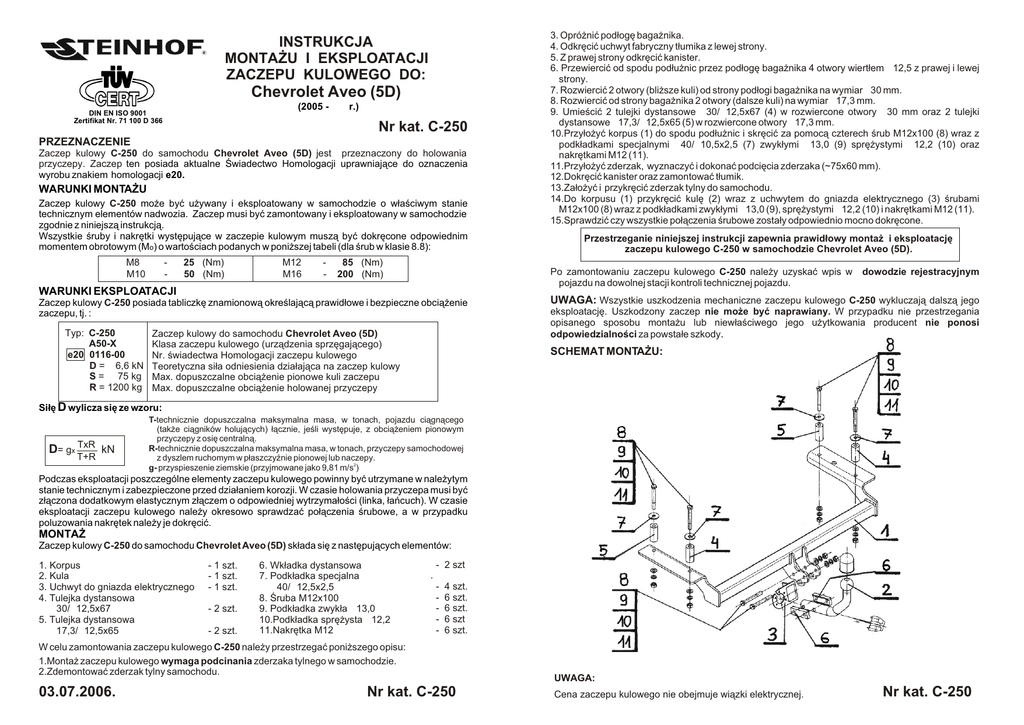 INSTRUKCJA MONTA¯U I EKSPLOATACJI ZACZEPU KULOWEGO DO: Chevrolet Aveo (5D) (2005 - ® r.) DIN EN ISO 9001 Zertifikat Nr. 71 100 D 366 Nr kat. C-250 PRZEZNACZENIE Zaczep kulowy C-250 do samochodu Chevrolet Aveo (5D) jest przeznaczony do holowania przyczepy. Zaczep ten posiada aktualne Œwiadectwo Homologacji uprawniaj¹ce do oznaczenia wyrobu znakiem homologacji e20. WARUNKI MONTA¯U Zaczep kulowy C-250 mo¿e byæ u¿ywany i eksploatowany w samochodzie o w³aœciwym stanie technicznym elementów nadwozia. Zaczep musi byæ zamontowany i eksploatowany w samochodzie zgodnie z niniejsz¹ instrukcj¹. Wszystkie œruby i nakrêtki wystêpuj¹ce w zaczepie kulowym musz¹ byæ dokrêcone odpowiednim momentem obrotowym (Mo) o wartoœciach podanych w poni¿szej tabeli (dla œrub w klasie 8.8): M8 M10 - 25 (Nm) 50 (Nm) M12 M16 - 85 (Nm) 200 (Nm) Przestrzeganie niniejszej instrukcji zapewnia prawid³owy monta¿ i eksploatacjê zaczepu kulowego C-250 w samochodzie Chevrolet Aveo (5D). Po zamontowaniu zaczepu kulowego C-250 nale¿y uzyskaæ wpis w dowodzie rejestracyjnym pojazdu na dowolnej stacji kontroli technicznej pojazdu. WARUNKI EKSPLOATACJI Zaczep kulowy C-250 posiada tabliczkê znamionow¹ okreœlaj¹c¹ prawid³owe i bezpieczne obci¹¿enie zaczepu, tj. : Typ: C-250 A50-X e20 0116-00 D = 6,6 kN S = 75 kg R = 1200 kg 3. Opró¿niæ pod³ogê baga¿nika. 4. Odkrêciæ uchwyt fabryczny t³umika z lewej strony. 5. Z prawej strony odkrêciæ kanister. 6. Przewierciæ od spodu pod³u¿nic przez pod³ogê baga¿nika 4 otwory wiert³em Ø12,5 z prawej i lewej strony. 7. Rozwierciæ 2 otwory (bli¿sze kuli) od strony pod³ogi baga¿nika na wymiar Ø30 mm. 8. Rozwierciæ od strony baga¿nika 2 otwory (dalsze kuli) na wymiar Ø17,3 mm. 9. Umieœciæ 2 tulejki dystansowe Ø30/Ø12,5x67 (4) w rozwiercone otwory Ø30 mm oraz 2 tulejki dystansowe Ø17,3/Ø12,5x65 (5) w rozwiercone otwory Ø17,3 mm. 10.Przy³o¿yæ korpus (1) do spodu pod³u¿nic i skrêciæ za pomoc¹ czterech œrub M12x100 (8) wraz z podk³adkami specjalnymi Ø40/Ø10,5x2,5 (7) zwyk³ymi Ø13,0 (9) sprê¿ystymi Ø12,2 (10) oraz nakrêtkami M12 (11). 11.Przy³o¿yæ zderzak, wyznaczyæ i dokonaæ podciêcia zderzaka (~75x60 mm). 12.Dokrêciæ kanister oraz zamontowaæ t³umik. 13.Za³o¿yæ i przykrêciæ zderzak tylny do samochodu. 14.Do korpusu (1) przykrêciæ kulê (2) wraz z uchwytem do gniazda elektrycznego (3) œrubami M12x100 (8) wraz z podk³adkami zwyk³ymi Ø13,0 (9), sprê¿ystymi Ø12,2 (10) i nakrêtkami M12 (11). 15.Sprawdziæ czy wszystkie po³¹czenia œrubowe zosta³y odpowiednio mocno dokrêcone. Zaczep kulowy do samochodu Chevrolet Aveo (5D) Klasa zaczepu kulowego (urz¹dzenia sprzêgaj¹cego) Nr. œwiadectwa Homologacji zaczepu kulowego Teoretyczna si³a odniesienia dzia³aj¹ca na zaczep kulowy Max. dopuszczalne obci¹¿enie pionowe kuli zaczepu Max. dopuszczalne obci¹¿enie holowanej przyczepy UWAGA: Wszystkie uszkodzenia mechaniczne zaczepu kulowego C-250 wykluczaj¹ dalsz¹ jego eksploatacjê. Uszkodzony zaczep nie mo¿e byæ naprawiany. W przypadku nie przestrzegania opisanego sposobu monta¿u lub niew³aœciwego jego u¿ytkowania producent nie ponosi odpowiedzialnoœci za powsta³e szkody. SCHEMAT MONTA¯U: Si³ê D wylicza siê ze wzoru: D= gx TxR kN T+R T-technicznie dopuszczalna maksymalna masa, w tonach, pojazdu ci¹gn¹cego (tak¿e ci¹gników holuj¹cych) ³¹cznie, jeœli wystêpuje, z obci¹¿eniem pionowym przyczepy z osiê centraln¹. R-technicznie dopuszczalna maksymalna masa, w tonach, przyczepy samochodowej z dyszlem ruchomym w p³aszczyŸnie pionowej lub naczepy. g- przyspieszenie ziemskie (przyjmowane jako 9,81 m/s2) Podczas eksploatacji poszczególne elementy zaczepu kulowego powinny byæ utrzymane w nale¿ytym stanie technicznym i zabezpieczone przed dzia³aniem korozji. W czasie holowania przyczepa musi byæ z³¹czona dodatkowym elastycznym z³¹czem o odpowiedniej wytrzyma³oœci (linka, ³añcuch). W czasie eksploatacji zaczepu kulowego nale¿y okresowo sprawdzaæ po³¹czenia œrubowe, a w przypadku poluzowania nakrêtek nale¿y je dokrêciæ. MONTA¯ Zaczep kulowy C-250 do samochodu Chevrolet Aveo (5D) sk³ada siê z nastêpuj¹cych elementów: 1. Korpus 2. Kula 3. Uchwyt do gniazda elektrycznego 4. Tulejka dystansowa Ø30/Ø12,5x67 5. Tulejka dystansowa Ø17,3/Ø12,5x65 - 1 szt. - 1 szt. - 1 szt. - 2 szt. - 2 szt. 6. Wk³adka dystansowa 7. Podk³adka specjalna Ø40/Ø12,5x2,5 8. Œruba M12x100 9. Podk³adka zwyk³a Ø13,0 10.Podk³adka sprê¿ysta Ø12,2 11.Nakrêtka M12 - 2 szt . - 4 szt. 6 szt. 6 szt. 6 szt 6 szt. W celu zamontowania zaczepu kulowego C-250 nale¿y przestrzegaæ poni¿szego opisu: 1.Monta¿ zaczepu kulowego wymaga podcinania zderzaka tylnego w samochodzie. 2.Zdemontowaæ zderzak tylny samochodu. 03.07.2006. Nr kat. C-250 UWAGA: Cena zaczepu kulowego nie obejmuje wi¹zki elektrycznej. Nr kat. C-250