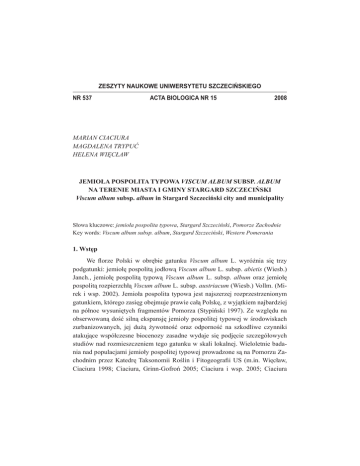 ZESZYTY NAUKOWE UNIWERSYTETU SZCZECIŃSKIEGO NR 537 ACTA BIOLOGICA NR 15 2008 MARIAN CIACIURA MAGDALENA TRYPUĆ HELENA WIĘCŁAW JEMIOŁA POSPOLITA TYPOWA VISCUM ALBUM SUBSP. ALBUM NA TERENIE MIASTA I GMINY STARGARD SZCZECIŃSKI Viscum album subsp. album in Stargard Szczeciński city and municipality Słowa kluczowe: jemioła pospolita typowa, Stargard Szczeciński, Pomorze Zachodnie Key words: Viscum album subsp. album, Stargard Szczeciński, Western Pomerania 1. Wstęp We florze Polski w obrębie gatunku Viscum album L. wyróżnia się trzy podgatunki: jemiołę pospolitą jodłową Viscum album L. subsp. abietis (Wiesb.) Janch., jemiołę pospolitą typową Viscum album L. subsp. album oraz jemiołę pospolitą rozpierzchłą Viscum album L. subsp. austriacum (Wiesb.) Vollm. (Mirek i wsp. 2002). Jemioła pospolita typowa jest najszerzej rozprzestrzenionym gatunkiem, którego zasięg obejmuje prawie całą Polskę, z wyjątkiem najbardziej na północ wysuniętych fragmentów Pomorza (Stypiński 1997). Ze względu na obserwowaną dość silną ekspansję jemioły pospolitej typowej w środowiskach zurbanizowanych, jej dużą żywotność oraz odporność na szkodliwe czynniki atakujące współczesne biocenozy zasadne wydaje się podjęcie szczegółowych studiów nad rozmieszczeniem tego gatunku w skali lokalnej. Wieloletnie badania nad populacjami jemioły pospolitej typowej prowadzone są na Pomorzu Zachodnim przez Katedrę Taksonomii Roślin i Fitogeografii US (m.in. Więcław, Ciaciura 1998; Ciaciura, Grinn-Gofroń 2005; Ciaciura i wsp. 2005; Ciaciura 70 Marian Ciaciura, Magdalena Trypuć, Helena Więcław i wsp. 2006). Teren miasta i gminy Stargard Szczeciński jest kolejnym obszarem, na którym podjęto badania nad tą ciekawą rośliną. Celem przeprowadzonych badań była inwentaryzacja lokalnych populacji jemioły pospolitej typowej na terenie miasta i gminy Stargard Szczeciński oraz oszacowanie stopnia zainfekowania poszczególnych gatunków drzew będących jej żywicielami. Ponadto celem pracy było ustalenie, jakie na badanym terenie gatunki drzew są najczęściej przez jemiołę atakowane i w jakich partiach korony jest ona najczęściej ulokowana. 2. Teren badań Gmina Stargard Szczeciński, o powierzchni 31 847 ha, jest położona w południowo-zachodniej części województwa zachodniopomorskiego. Na obszarze gminy znajduje się 38 miejscowości, należących do 30 sołectw, w których zamieszkuje 11,3 tys. osób (Olszewski, Skwara 2005). Gmina Stargard Szczeciński obejmuje swym zasięgiem część Równiny Pyrzycko-Stargardzkiej oraz część Równiny Nowogardzkiej w makroregionie Pobrzeże Szczecińskie (Kondracki 2000). Obecna rzeźba terenu gminy została ukształtowana w wyniku bezpośredniej i pośredniej działalności lądolodu zlodowacenia bałtyckiego. Równina Pyrzycko-Stargardzka przedstawia płaską lub lekko falistą morenę denną (Mikołajski 1966). Równina Nowogardzka w obrębie badanego terenu obejmuje przede wszystkim obszary wysoczyzn morenowych. Obszar wysoczyzny jest tutaj w dużej mierze zajęty przez pole drumlinów, rynny glacjalne oraz ozy. W okolicach Grzędzic i Stargardu stwierdzono występowanie największego w Polsce i Europie skupiska pagórków, tzw. stargardzkich pól drumlinowych, wymodelowanych przez topniejący lodowiec (Olszewski, Skwara 2005). Tereny na wschód od Stargardu Szczecińskiego objęto ochroną rezerwatową i powołano rezerwat krajobrazowy o powierzchni 4,7 ha o nazwie „Ozy Kiczarowskie” (Kondracki 2000). Obszar gminy odwadnia sieć rzek, wśród których główną rolę odgrywa rzeka Ina wraz ze swymi dopływami – Małą Iną, Krąpielą i Pęzinką. Zachodnia część badanego terenu należy do dorzecza rzeki Płoni. Ina i Płonia odprowadzają swe wody do Odry. Największym jeziorem jest położone w zachodniej części gminy jezioro Miedwie o powierzchni 36,8 km2 i maksymalnej głębokości 42 m (Olszewski, Skwara 2005). Jemioła pospolita typowa... 71 Gmina Stargard Szczeciński należy do IV krainy klimatycznej, tzw. Pyrzycko-Goleniowskiej (Prawdzic 1961). Najwyższą średnią temperaturę mają równinne poziomy zastoiskowe wraz z przyległymi do nich dolinami Iny i Małej Iny oraz rynna jeziora Miedwie. Średnia roczna temperatura jest zbliżona do +8 °C. Na ogół na obszarze gminy dominują umiarkowanie wilgotne lata, z wyjątkiem jej południowo-wschodnich kresów (okolice Kluczewa), gdzie liczba opadów jest niewielka (Dopierała 1969). 3. Metody badań Badania terenowe przeprowadzono w okresie zimowym i wczesnowiosennym (kiedy drzewa były w stanie bezlistnym) na przełomie 2006 i 2007 roku na obszarze miasta i gminy Stargard Szczeciński. Określono liczbę zainfekowanych drzew oraz podano stopień ich opanowania przez półpasożyta. Stopień zainfekowania drzew oszacowano na podstawie liczby krzewów Viscum album subsp. album. W tym celu wykorzystano następującą ośmiostopniową skalę: 1 – od 1 do 10 krzewów jemioły, 2 – od 11 do 20 krzewów jemioły, 3 – od 21 do 30 krzewów jemioły, 4 – od 31 do 40 krzewów jemioły, 5 – od 41 do 50 krzewów jemioły, 6 – od 51 do 60 krzewów jemioły, 7 – od 61 do 70 krzewów jemioły, 8 – od 71 do 80 krzewów jemioły Obliczono również procentowy udział krzewów Viscum album subsp. album na pniach oraz w różnych strefach korony zaatakowanych drzew (górna, środkowa, dolna i brzeżna strefa korony). Pozycję systematyczną jemioły pospolitej oraz nomenklaturę gatunków drzew przyjęto za Mirkiem i wsp. (2002). 4. Wyniki badań Na terenie miasta i gminy Stargard Szczeciński zlokalizowano 635 stanowisk Viscum album subsp. album. Jemioła pospolita typowa występowała na 17 gatunkach drzew należących do 10 rodzajów (tabela 1). 72 Marian Ciaciura, Magdalena Trypuć, Helena Więcław Do najczęściej spotykanych na badanym terenie żywicieli jemioły należą: Populus nigra, Betula pendula, Salix alba, Robinia pseudoacacia