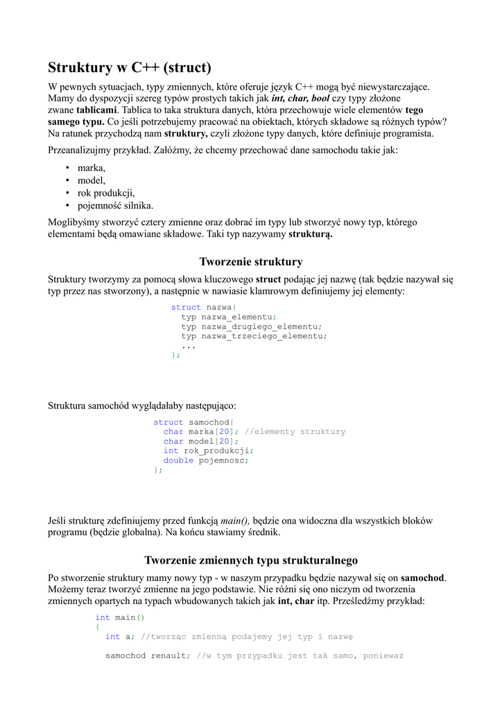 dodatkowe właściwości. Możemy je przypisywać do siebie, tworzyć tablice struktur, wskaźniki itp.