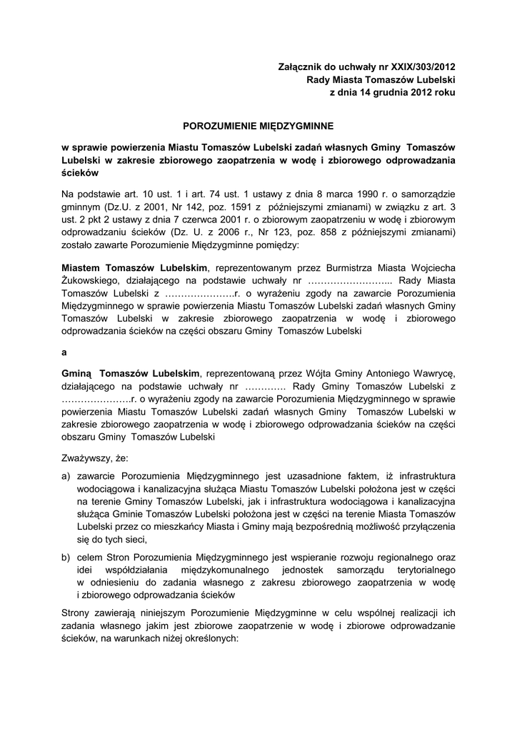 Załącznik do uchwały nr XXIX/303/2012 Rady Miasta Tomaszów Lubelski z dnia 14 grudnia 2012 roku POROZUMIENIE MIĘDZYGMINNE w sprawie powierzenia Miastu Tomaszów Lubelski zadań własnych Gminy Tomaszów Lubelski w zakresie zbiorowego zaopatrzenia w wodę i zbiorowego odprowadzania ścieków Na podstawie art. 10 ust. 1 i art. 74 ust. 1 ustawy z dnia 8 marca 1990 r. o samorządzie gminnym (Dz.U. z 2001, Nr 142, poz. 1591 z późniejszymi zmianami) w związku z art. 3 ust. 2 pkt 2 ustawy z dnia 7 czerwca 2001 r. o zbiorowym zaopatrzeniu w wodę i zbiorowym odprowadzaniu ścieków (Dz. U. z 2006 r., Nr 123, poz. 858 z późniejszymi zmianami) zostało zawarte Porozumienie Międzygminne pomiędzy: Miastem Tomaszów Lubelskim, reprezentowanym przez Burmistrza Miasta Wojciecha Żukowskiego, działającego na podstawie uchwały nr ……………………... Rady Miasta Tomaszów Lubelski z ………………….r. o wyrażeniu zgody na zawarcie Porozumienia Międzygminnego w sprawie powierzenia Miastu Tomaszów Lubelski zadań własnych Gminy Tomaszów Lubelski w zakresie zbiorowego zaopatrzenia w wodę i zbiorowego odprowadzania ścieków na części obszaru Gminy Tomaszów Lubelski a Gminą Tomaszów Lubelskim, reprezentowaną przez Wójta Gminy Antoniego Wawrycę, działającego na podstawie uchwały nr …………. Rady Gminy Tomaszów Lubelski z ………………….r. o wyrażeniu zgody na zawarcie Porozumienia Międzygminnego w sprawie powierzenia Miastu Tomaszów Lubelski zadań własnych Gminy Tomaszów Lubelski w zakresie zbiorowego zaopatrzenia w wodę i zbiorowego odprowadzania ścieków na części obszaru Gminy Tomaszów Lubelski Zważywszy, że: a) zawarcie Porozumienia Międzygminnego jest uzasadnione faktem, iż infrastruktura wodociągowa i kanalizacyjna służąca Miastu Tomaszów Lubelski położona jest w części na terenie Gminy Tomaszów Lubelski, jak i infrastruktura wodociągowa i kanalizacyjna służąca Gminie Tomaszów Lubelski położona jest w części na terenie Miasta Tomaszów Lubelski przez co mieszkańcy Miasta i Gminy mają bezpośrednią możliwość przyłączenia się do tych sieci, b) celem Stron Porozumienia Międzygminnego jest wspieranie rozwoju regionalnego oraz idei współdziałania międzykomunalnego jednostek samorządu terytorialnego w odniesieniu do zadania własnego z zakresu zbiorowego zaopatrzenia w wodę i zbiorowego odprowadzania ścieków Strony zawierają niniejszym Porozumienie Międzygminne w celu wspólnej realizacji ich zadania własnego jakim jest zbiorowe zaopatrzenie w wodę i zbiorowe odprowadzanie ścieków, na warunkach niżej określonych: §1 Gmina Tomaszów Lubelski powierza Miastu Tomaszów Lubelski wykonanie zadania publicznego polegającego na zbiorowym zaopatrzeniu w wodę oraz zbiorowym odprowadzaniu ścieków mieszkańców Gminy Tomaszów Lubelski zamieszkałych w obrębie ulic: Józefowskiej, Leśnej, Ogrodowej, Chrobrego, Wojska Polskiego, Tomaszowskiej, Ściegiennego i Łaszczowieckiej. §2 1. W ramach realizacji powierzonego zadania Miastu Tomaszów Lubelski, obowiązki przedsiębiorstwa wodociągowo-kanalizacyjnego przewidziane przepisami prawa, w szczególności art. 5, 6, 7 i 8 ustawy z dnia 7 czerwca 2001 r. o zbiorowym zaopatrzeniu w wodę i zbiorowym odprowadzaniu ścieków (tekst jednolity: Dz. U. z 2006 r., Nr 123, poz. 858 z późniejszymi zmianami) wykonywało będzie Przedsiębiorstwo Gospodarki Komunalnej i Mieszkaniowej Spółka z o.o. w Tomaszowie Lubelskim, 22-600 Tomaszów Lubelski, ul. Lwowska 37a, zarejestrowane w Sądzie Rejonowym XI Wydział Gospodarczy KRS Nr 0000127373, NIP 921-00-10-133, Regon 950177059, którego jedynym Wspólnikiem jest Miasto Tomaszów Lubelski. 2. Do obowiązków Przedsiębiorstwa Gospodarki Komunalnej i Mieszkaniowej Spółka z o.o. w Tomaszowie Lubelskim w szczególności należy: 1) zapewnienie dostaw wody i odprowadzania ścieków w sposób ciągły i niezawodny oraz w wymaganej ilości i ciśnieniu, o parametrach pozwalających na normalne korzystanie z tych usług przez mieszkańców, 2) zapewnienie należytej jakości dostarczanej wody oraz należytych warunków odprowadzania ścieków 3) zawieraniu umów o zaopatrzenie w wodę lub odprowadzanie ścieków, dokonywaniu odczytów wskazań wodomierzy oraz dokonywaniu rozliczeń z odbiorcami, 4) ograniczaniu lub wstrzymaniu dostaw wody i odprowadzania ścieków po spełnieniu przesłanek przewidzianych w ustawie z dnia 7 czerwca 2001 r. o zbiorowym zaopatrzeniu w wodę i zbiorowym odprowadzaniu ścieków (tekst jednolity: Dz.U. z 2001, Nr 142, poz. 1591 z późniejszymi zmianami) §3 Niniejsze Porozumienie nie obejmuje realizacji zadań inwestycyjnych z zakresu budowy lub rozbudowy urządzeń wodociągowych i kanalizacyjnych. Zadania te realizować będzie Gmina Tomaszów Lubelski we własnym zakresie. §4 1. Za zgodą Stron Porozumienie Międzygminne może zostać rozwiązane w każdym czasie. 2. Wystąpienie Strony z Porozumienia Międzygminnego następuje na podstawie uchwały właściwej Rady Gminy. 3. Oświadczenie organu wykonawczego Strony o wystąpieniu z Porozumienia Międzygminnego powinno zostać złożone po podjęciu uchwały, o której mowa w ust. 2. Oświadczenie takie powinno zostać złożone najpóźniej na 6 miesięcy przed końcem roku kalendarzowego. Złożenie oświadczenia o wystąpieniu w terminie opisanym w zdaniu poprzedzającym skutkuje w stosunku do Strony składającej takie oświadczenie wystąpieniem jej z Porozumienia Międzygminnego z końcem roku kalendarzowego. §5 Wszelkie zmiany i uzupełnienia Porozumienia Międzygminnego wymagają formy pisemnej pod rygorem nieważności oraz zgodnych uchwał rad gmin Stron Porozumienia Międzygminnego. §6 Porozumienie Międzygminne zawiera się na czas nieokreślony. §7 Wszelkie spory pomiędzy Stronami mogące powstać w związku z wykonywaniem Porozumienia Międzygminnego będą rozstrzygane przez sądy powszechne. §8 Porozumienie pod