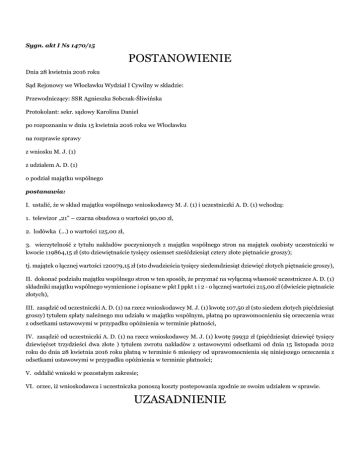 Sygn. akt I Ns 1470/15 POSTANOWIENIE Dnia 28 kwietnia 2016 roku Sąd Rejonowy we Włocławku Wydział I Cywilny w składzie: Przewodniczący: SSR Agnieszka Sobczak-Śliwińska Protokolant: sekr. sądowy Karolina Daniel po rozpoznaniu w dniu 15 kwietnia 2016 roku we Włocławku na rozprawie sprawy z wniosku M. J. (1) z udziałem A. D. (1) o podział majątku wspólnego postanawia: I. ustalić, że w skład majątku wspólnego wnioskodawcy M. J. (1) i uczestniczki A. D. (1) wchodzą: 1. telewizor „21” – czarna obudowa o wartości 90,00 zł, 2. lodówka (...) o wartości 125,00 zł, 3. wierzytelność z tytułu nakładów poczynionych z majątku wspólnego stron na majątek osobisty uczestniczki w kwocie 119864,15 zł (sto dziewiętnaście tysięcy osiemset sześćdziesiąt cztery złote piętnaście groszy); tj. majątek o łącznej wartości 120079,15 zł (sto dwadzieścia tysięcy siedemdziesiąt dziewięć złotych piętnaście groszy), II. dokonać podziału majątku wspólnego stron w ten sposób, że przyznać na wyłączną własność uczestniczce A. D. (1) składniki majątku wspólnego wymienione i opisane w pkt I ppkt 1 i 2 - o łącznej wartości 215,00 zł (dwieście piętnaście złotych), III. zasądzić od uczestniczki A. D. (1) na rzecz wnioskodawcy M. J. (1) kwotę 107,50 zł (sto siedem złotych pięćdziesiąt groszy) tytułem spłaty należnego mu udziału w majątku wspólnym, płatną po uprawomocnieniu się orzeczenia wraz z odsetkami ustawowymi w przypadku opóźnienia w terminie płatności, IV. zasądzić od uczestniczki A. D. (1) na rzecz wnioskodawcy M. J. (1) kwotę 59932 zł (pięćdziesiąt dziewięć tysięcy dziewięćset trzydzieści dwa złote ) tytułem zwrotu nakładów z ustawowymi odsetkami od dnia 15 listopada 2012 roku do dnia 28 kwietnia 2016 roku płatną w terminie 6 miesięcy od uprawomocnienia się niniejszego orzeczenia z odsetkami ustawowymi w przypadku opóźnienia w terminie płatności; V. oddalić wnioski w pozostałym zakresie; VI. orzec, iż wnioskodawca i uczestniczka ponoszą koszty postepowania zgodnie ze swoim udziałem w sprawie. UZASADNIENIE Wnioskodawca M. J. (1) w dniu 04.09.2012 r., wniósł do Sądu wniosek o podział majątku wspólnego powstałego w trakcie jego związku małżeńskiego z A. D. (1) oraz rozliczenie nakładów z majątku wspólnego stron na majątek osobisty A. D. (1). W toku postępowania wnioskodawca jako składniki majątku wspólnego wskazał ruchomości w postaci telewizora „21” w czarnej obudowie, wieży (...), magnetowidu J., odkurzacza (...), lodówki (...), kanapy i dwóch foteli, ławy i pufy, meblościanki, zastawy stołowej porcelanowej na 24 osoby oraz samochodu marki A. (...). Jako sposób podziału majątku wspólnego wniósł o przyznanie uczestniczce ruchomości stanowiących wyposażenie mieszkania a jemu samochodu A. (...), zgodnie z aktualnym stanem posiadania. Żądając rozliczenia nakładów wniósł o zasądzenia na jego rzecz kwoty 230.000 zł tytułem połowy nakładów z majątku wspólnego stron na budowę domu na nieruchomości stanowiącej majątek osobisty byłej żony. Uzasadniając powyższe wskazał, że małżeństwo stron trwało od 20.09.1997 r. do 30.05.2001 r. W trakcie trwania małżeństwa 6.10.1999 r. rozpoczęli budowę domu na działce należącej do majątku osobistego A. D. (1). (...) budowlane kupili za pieniądze otrzymane z okazji zawarcia związku małżeńskiego. Rodzice wnioskodawcy płacili pracownikom oraz pokrywali koszty ich wyżywienia. Nadto wnioskodawca włożył w budowę domu osobiste starania i pracę fizyczną przy budowie. Uczestniczka A. D. (1) początkowo wniosła o ustalenie, że brak jest składników majątku wspólnego podlegających podziałowi. Ostatecznie jednak przyznała, że w trakcie trwania związku małżeńskiego strony nabyły kanapę z dwoma fotelami, a także telewizor i lodówkę oraz samochód A. (...). Odnosząc się do żądania zwrotu nakładów i wydatków poczynionych z majątku wspólnego stron na jej majątek osobisty wniosła o oddalenie tego żądania podnoszą zarzut przedawnienia. Sąd ustalił, co następuje: M. J. (1) i A. D. (1) z domu G. zawarli związek małżeński w dniu 20.09.1997 r. Wyrokiem z dnia 30.05.2001 r. Sąd Okręgowy we Włocławku orzekł rozwiązanie małżeństwa bez orzekania o winie. Orzeczenie uprawomocniło się w dniu 21.06.2001 r. Dowód: wyrok Sądu Okręgowego we Włocławku k. 5. Za pieniądze uzyskane z prezentów ślubnych strony nabyły telewizor „21” cali , lodówkę (...) oraz kanapę i dwa fotele. Kanapa z fotelami na skutek zużycia uległy zniszczeniu i w chwili obecnej już nie istnieją. W trakcie trwania małżeństwa został nabyty także samochód A. (...) rok prod. 1993 r. Po rozwodzie ruchomości stanowiące wyposażenie mieszkania zostały u A. D. (1) a samochód A. (...) został zabrany przez M. J. (1). Dowód: częsciowo zeznania wnioskodawcy M. J. (1) k. 254, częściowo zeznania uczestniczki A. D. (1) k. 255. Aktualna wartość tych ruchomości wynosi odpowiednio telewizor „21” cali – 90 zł, lodówka (...) - 125 zł, samochód A. (...) -3000 zł. (bezsporne) W październiku 1999 r. małżonkowie rozpoczęły budowę domu na działce stanowiącej majątek osobisty A. D. (1). Za pieniądze z prezentów ślubnych została zakupiona część materiałów budowlanych. Dom był budowany systemem gospodarczym przy udziale członków rodziny w tym ojca uczestniczki, który jest murarzem. Część materiałów budowlanych została zakupiona w czasie budowy domu z dochodów stron, część materiałów zakupił ojciec A. D., pewne kwoty na materiały budowlane przekazali także rodzice M. J.. Przy budowie domu pracował M. J. (1) oraz pomagali członkowie jego rodziny i koledzy. W dniu 08.01.2001 r. A. D. (1) sprzedała swoim rodzicom działkę, na której był budowany dom. W chwili sprzedaży dom był w stanie surowym otwartym, były wyciągnięte mur