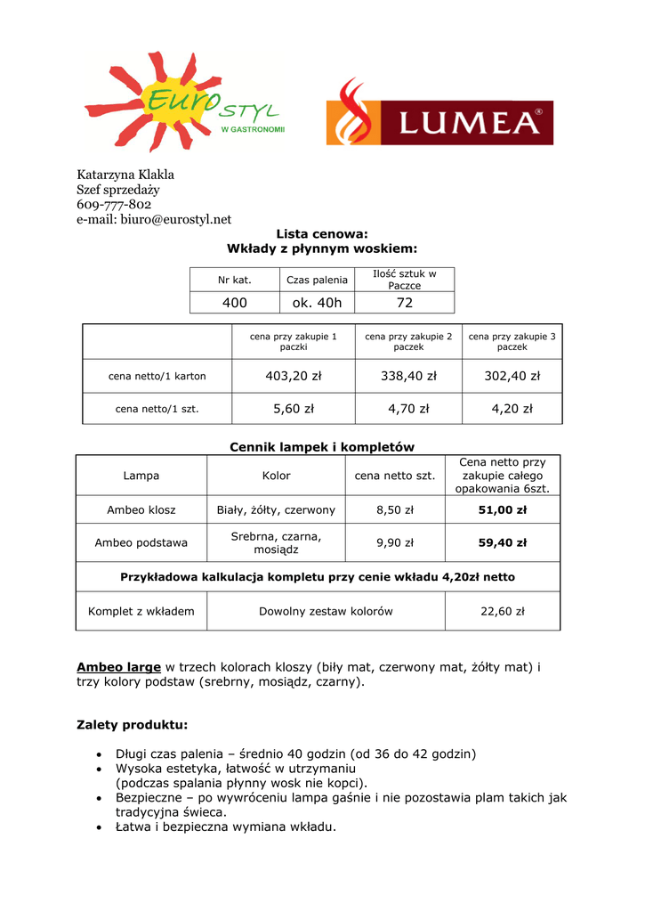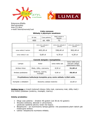 Katarzyna Klakla Szef sprzedaży 609-777-802 e-mail: [email protected] Lista cenowa: Wkłady z płynnym woskiem: Nr kat. Czas palenia Ilość sztuk w Paczce 400 ok. 40h 72 cena przy zakupie 1 paczki cena przy zakupie 2 paczek cena przy zakupie 3 paczek cena netto/1 karton 403,20 zł 338,40 zł 302,40 zł cena netto/1 szt. 5,60 zł 4,70 zł 4,20 zł Cennik lampek i kompletów Lampa Kolor cena netto szt. Cena netto przy zakupie całego opakowania 6szt. Ambeo klosz Biały, żółty, czerwony 8,50 zł 51,00 zł Ambeo podstawa Srebrna, czarna, mosiądz 9,90 zł 59,40 zł Przykładowa kalkulacja kompletu przy cenie wkładu 4,20zł netto Komplet z wkładem Dowolny zestaw kolorów 22,60 zł Ambeo large w trzech kolorach kloszy (biły mat, czerwony mat, żółty mat) i trzy kolory podstaw (srebrny, mosiądz, czarny). Zalety produktu: Długi czas palenia – średnio 40 godzin (od 36 do 42 godzin) Wysoka estetyka, łatwość w utrzymaniu (podczas spalania płynny wosk nie kopci). Bezpieczne – po wywróceniu lampa gaśnie i nie pozostawia plam takich jak tradycyjna świeca. Łatwa i bezpieczna wymiana wkładu. Warunki handlowe: 1. Zamówienia na podstawy i klosze mogą być mniejsze niż karton (karton zawiera 6szt.) 2. Klient może zamawiać również same klosze. 3. Termin realizacji zamówienia Lampki – 3 tygodnie, wkłady na bieżąco do 7 dni. Lampka Ambeo + duży wkład (nr kat 400) Istnieje możliwość sprowadzania innych wzorów lub kolorów lampek, można je wybrać na stronie: http://www.lumea.com/lumeacandlelamps.html , a my przygotujemy ofertę i po akceptacji sprowadzimy, jedynym warunkiem jest zamówienie pełnych opakowań (zazwyczaj jest to 6 szt. w paczce).