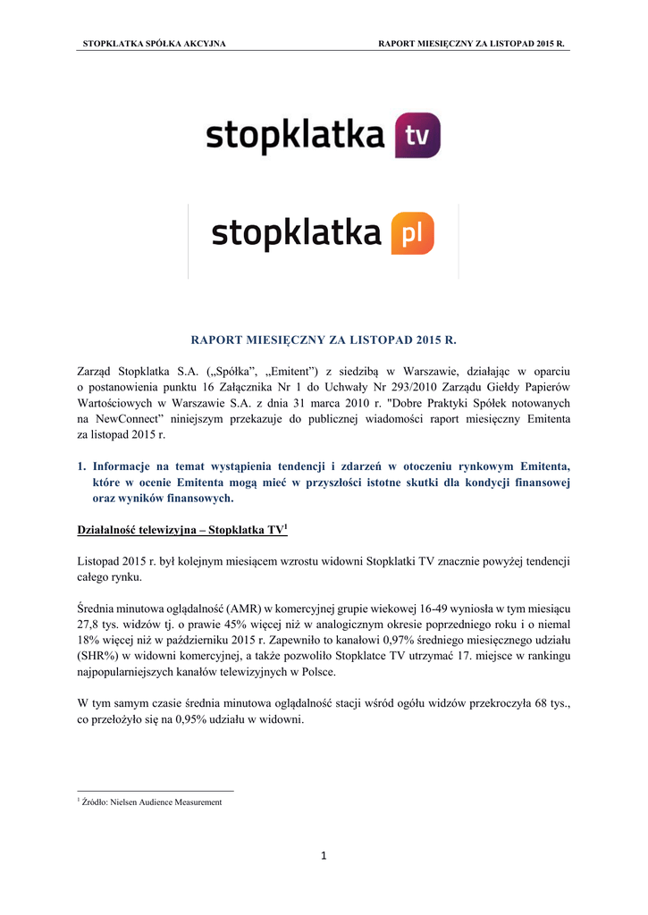 STOPKLATKA SPÓŁKA AKCYJNA RAPORT MIESIĘCZNY ZA LISTOPAD 2015 R. RAPORT MIESIĘCZNY ZA LISTOPAD 2015 R. Zarząd Stopklatka S.A. („Spółka”, „Emitent”) z siedzibą w Warszawie, działając w oparciu o postanowienia punktu 16 Załącznika Nr 1 do Uchwały Nr 293/2010 Zarządu Giełdy Papierów Wartościowych w Warszawie S.A. z dnia 31 marca 2010 r. "Dobre Praktyki Spółek notowanych na NewConnect” niniejszym przekazuje do publicznej wiadomości raport miesięczny Emitenta za listopad 2015 r. 1. Informacje na temat wystąpienia tendencji i zdarzeń w otoczeniu rynkowym Emitenta, które w ocenie Emitenta mogą mieć w przyszłości istotne skutki dla kondycji finansowej oraz wyników finansowych. Działalność telewizyjna – Stopklatka TV1 Listopad 2015 r. był kolejnym miesiącem wzrostu widowni Stopklatki TV znacznie powyżej tendencji całego rynku. Średnia minutowa oglądalność (AMR) w komercyjnej grupie wiekowej 16-49 wyniosła w tym miesiącu 27,8 tys. widzów tj. o prawie 45% więcej niż w analogicznym okresie poprzedniego roku i o niemal 18% więcej niż w październiku 2015 r. Zapewniło to kanałowi 0,97% średniego miesięcznego udziału (SHR%) w widowni komercyjnej, a także pozwoliło Stopklatce TV utrzymać 17. miejsce w rankingu najpopularniejszych kanałów telewizyjnych w Polsce. W tym samym czasie średnia minutowa oglądalność stacji wśród ogółu widzów przekroczyła 68 tys., co przełożyło się na 0,95% udziału w widowni. 1 Źródło: Nielsen Audience Measurement 1 STOPKLATKA SPÓŁKA AKCYJNA RAPORT MIESIĘCZNY ZA LISTOPAD 2015 R. 2. Zestawienie informacji opublikowanych przez Emitenta w okresie objętym raportem. RAPORTY EBI: Data Rodzaj Numer Temat raportu 05.11.2015 r. Okresowy 23/2015 Raport kwartalny Stopklatka S.A. za trzeci kwartał 2015 r. 09.11.2015 r. Bieżący 24/2015 Zwołanie Nadzwyczajnego Walnego Zgromadzenia Stopklatka S.A. 11.11.2015 r. Bieżący 25/2015 Raport miesięczny Stopklatka S.A. za październik 2015 r. RAPORTY ESPI: Data 09.11.2015 r. Rodzaj Bieżący Numer Temat raportu Zwołanie Nadzwyczajnego Walnego Zgromadzenia Stopklatka S.A. 6/2015 3. Informacje na temat realizacji celów emisji, jeżeli taka realizacja choćby w części miała miejsce w okresie objętym raportem oraz informacje na temat działalności Emitenta w listopadzie 2015 r. Informacje odnośnie najważniejszych wydarzeń, mających miejsce w listopadzie 2015 r. zostały przedstawione w pkt. 1 niniejszego raportu. 4. Kalendarz inwestora, obejmujący wydarzenia mające mieć miejsce w nadchodzącym miesiącu, które dotyczą Emitenta i są istotne z punktu widzenia interesów inwestorów, w szczególności daty publikacji raportów okresowych, planowanych walnych zgromadzeń, otwarcia subskrypcji, spotkań z inwestorami lub analitykami oraz oczekiwany termin publikacji raportu analitycznego. W związku z punktem 16 Załącznika Nr 1 do Uchwały Nr 293/2010 Zarządu Giełdy Papierów Wartościowych w Warszawie S.A. z dnia 31 marca 2010 r. "Dobre Praktyki Spółek notowanych na NewConnect” do dnia 14 stycznia 2016 r. Emitent przekaże raport miesięczny za grudzień 2015 r. Podstawa prawna: Punkt 16 Załącznika Nr 1 do Uchwały Nr 293/2010 Zarządu Giełdy Papierów Wartościowych w Warszawie S.A. z dnia 31 marca 2010 r. "Dobre Praktyki Spółek notowanych na NewConnect”. Osoby reprezentujące Spółkę: Bogusław Kisielewski – Prezes Zarządu Agnieszka Sadowska – Członek Zarządu 2