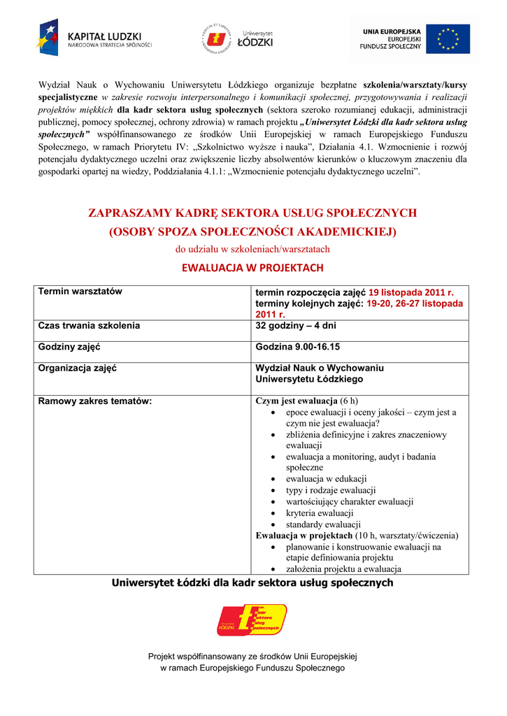 Wydział Nauk o Wychowaniu Uniwersytetu Łódzkiego organizuje bezpłatne szkolenia/warsztaty/kursy specjalistyczne w zakresie rozwoju interpersonalnego i komunikacji społecznej, przygotowywania i realizacji projektów miękkich dla kadr sektora usług społecznych (sektora szeroko rozumianej edukacji, administracji publicznej, pomocy społecznej, ochrony zdrowia) w ramach projektu „Uniwersytet Łódzki dla kadr sektora usług społecznych” współfinansowanego ze środków Unii Europejskiej w ramach Europejskiego Funduszu Społecznego, w ramach Priorytetu IV: „Szkolnictwo wyższe i nauka”, Działania 4.1. Wzmocnienie i rozwój potencjału dydaktycznego uczelni oraz zwiększenie liczby absolwentów kierunków o kluczowym znaczeniu dla gospodarki opartej na wiedzy, Poddziałania 4.1.1: „Wzmocnienie potencjału dydaktycznego uczelni”. ZAPRASZAMY KADRĘ SEKTORA USŁUG SPOŁECZNYCH (OSOBY SPOZA SPOŁECZNOŚCI AKADEMICKIEJ) do udziału w szkoleniach/warsztatach EWALUACJA W PROJEKTACH Termin warsztatów Czas trwania szkolenia termin rozpoczęcia zajęć 19 listopada 2011 r. terminy kolejnych zajęć: 19-20, 26-27 listopada 2011 r. 32 godziny – 4 dni Godziny zajęć Godzina 9.00-16.15 Organizacja zajęć Wydział Nauk o Wychowaniu Uniwersytetu Łódzkiego Ramowy zakres tematów: Czym jest ewaluacja (6 h) epoce ewaluacji i oceny jakości – czym jest a czym nie jest ewaluacja? zbliżenia definicyjne i zakres znaczeniowy ewaluacji ewaluacja a monitoring, audyt i badania społeczne ewaluacja w edukacji typy i rodzaje ewaluacji wartościujący charakter ewaluacji kryteria ewaluacji standardy ewaluacji Ewaluacja w projektach (10 h, warsztaty/ćwiczenia) planowanie i konstruowanie ewaluacji na etapie definiowania projektu założenia projektu a ewaluacja Uniwersytet Łódzki dla kadr sektora usług społecznych Projekt współfinansowany ze środków Unii Europejskiej w ramach Europejskiego Funduszu Społecznego zakres ewaluacji: co badamy i dlaczego ewaluacja w projektach unijnych ewaluacja w trakcie realizacji projektu – strategie, podejścia, zastosowanie harmonogram ewaluacji Metodologiczne aspekty ewaluacji (10 h, warsztaty/ćwiczenia) strategie pozyskiwania danych podstawowe metody i techniki badawcze dobór próby w badaniach ewaluacyjnych konceptualizacja i operacjonalizacja w badaniach ewaluacyjnych Wyniki ewaluacji – prezentacja, opis, raport (4 h) struktura raportu ewaluacyjnego prezentacja danych i wyników badań formułowanie rekomendacji Dyskusja podsumowująca (2 h) Metodyka prowadzenia zajęć Warsztaty OSOBY ZAINTERESOWANE UDZIAŁEM W WARSZTATACH PROSIMY O PRZEKAZANIE WYPEŁNIONEGO I PODPISANEGO formularza rekrutacyjnego wraz z załącznikami: 1. Deklarację uczestnictwa w projekcie 2. Oświadczenie uczestnika projektu o wyrażeniu zgody na przetwarzanie danych osobowych. 3. Kserokopia dowodu osobistego. Uniwersytet Łódzki dla kadr sektora usług społecznych Projekt współfinansowany ze środków Unii Europejskiej w ramach Europejskiego Funduszu Społecznego NIE PÓŹNIEJ NIŻ DO 28 PAŹDZIERNIKA 2011 ROKU do pokoju 110, Wydział Nauk o Wychowaniu UŁ LUB FAXEM NA NR (042) 665-50-70 NA ADRES: [email protected] (wymagany jest scan podpisu) O UCZESTNICTWIE W SZKOLENIU DECYDUJE MIĘDZY INNYMI KOLEJNOŚĆ ZGŁOSZEŃ Z osobami przyjętymi skontaktujemy się drogą mailową lub telefoniczną i poprosimy o uregulowanie niezbędnych formalności (podpisanie regulaminu). Uniwersytet Łódzki dla kadr sektora usług społecznych Projekt współfinansowany ze środków Unii Europejskiej w ramach Europejskiego Funduszu Społecznego