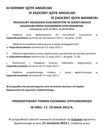 III DZIENNY JĘZYK ANGIELSKI III ZAOCZNY JĘZYK ANGIELSKI III ZAOCZNY JĘZYK NIEMIECKI PROCEDURY SKŁADANIA DOKUMENTÓW W SEKRETARIACIE KOLEGIUM PRZED EGZAMINEM DYPLOMOWYM: (obowiązuje od 01.10.2011r. do 30.09.2012) Oddanie prac dyplomowych do konsultacji recenzenta nieprzekraczalnym terminie do 28 kwietnia 2012 r. do godz. 14.00. 1. w Oddanie konspektów dotyczących praktyk pedagogicznych w nieprzekraczalnym terminie do 11 maja 2012 r. 2. 3. Oddanie egzemplarza pracy dyplomowej oprawionej (w twardej oprawie) w nieprzekraczalnym terminie do 11 maja 2012 r. do godz. 11.00. Rozliczenie z Kolegium (czesne, biblioteka, nieprzekraczalnym terminie do 11 maja 2012 r. 4. Oddanie uzupełnionego indeksu z nieprzekraczalnym terminie do 11 maja 2012 r. 5. kartą legitymacja) w egzaminacyjną w W przypadku nie przestrzegania w/w terminów słuchacz nie będzie dopuszczony do egzaminu dyplomowego. PRZEWIDYWANY TERMIN EGZAMINU DYPLOMOWEGO W DNIU 17, 18 MAJA 2012 R. W przypadkach zdarzeń losowych przewiduje się II termin egzaminu dyplomowego w dniu 21 września 2012 r. (oddanie pracy w nieprzekraczalnym terminie do 27 sierpnia 2012 r. do godz. 12.00). DOPUSZCZA SIĘ ZMIANĘ WYŻEJ PODANYCH TERMINÓW.