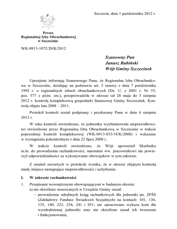 Szczecin, dnia 1 października 2012 r. Prezes Regionalnej Izby Obrachunkowej w Szczecinie WK-0913-1072/20/K/2012 Szanowny Pan Janusz Babiński Wójt Gminy Szczecinek Uprzejmie informuję Szanownego Pana, że Regionalna Izba Obrachunkowa w Szczecinie, działając na podstawie art. 5 ustawy z dnia 7 października 1992 r. o regionalnych izbach obrachunkowych (Dz. U. z 2001 r. Nr 55, poz. 577 z późn. zm.), przeprowadziła w okresie od 28 maja do 3 sierpnia 2012 r. kontrolę kompleksową gospodarki finansowej Gminy Szczecinek. Kontrolą objęto lata 2008 – 2011. Protokół kontroli został podpisany i przekazany Panu w dniu 6 sierpnia 2012 r. W toku kontroli stwierdzono, że jednostka wyeliminowała nieprawidłowości stwierdzone przez Regionalną Izbę Obrachunkową w Szczecinie w trakcie poprzedniej kontroli kompleksowej (WK-0913-853/18/K/2008) i wskazane w wystąpieniu pokontrolnym z dnia 22 lipca 2008 r. W trakcie kontroli stwierdzono, że Wójt upoważnił Skarbnika m.in. do prowadzenia rachunkowości, natomiast ww. pracownikowi nie powierzył odpowiedzialności za wykonywanie obowiązków w tym zakresie. Z ustaleń zawartych w protokole wynika, że w okresie objętym kontrolą miały miejsce następujące nieprawidłowości i uchybienia: I. W zakresie rachunkowości 1. Przepisami wewnętrznymi obowiązującymi w badanym okresie: a) nie określono stosowanych w Urzędzie Gminy zasad: − prowadzenia odrębnych ksiąg rachunkowych dla jednostki pn. ZFŚS (Zakładowy Fundusz Świadczeń Socjalnych) na kontach: 101, 130, 135, 140, 225, 234, 241 i 851; nie opracowano wykazu kont dla wyodrębnionej jednostki oraz nie określono zasad ich tworzenia i funkcjonowania, 2 − sporządzania raportów kasowych odrębnie dla przychodowych i rozchodowych operacji obrotu gotówkowego (tj. w podziale na dochody i wydatki), czym naruszono art. 10 ust. 1 pkt 3b ustawy z dnia 29 września 1994 r. o rachunkowości (Dz. U. z 2002 r. Nr 76, poz. 694 z późn. zm.) w związku z § 2 pkt 1 rozporządzeń Ministra Finansów odpowiednio: z dnia 28 lipca 2006 r. w sprawie szczególnych zasad rachunkowości oraz planów kont dla budżetu państwa, budżetów jednostek samorządu terytorialnego oraz niektórych jednostek sektora finansów publicznych (Dz. U. Nr 142, poz. 1020 z późn. zm.) – do dnia 31 lipca 2010 r., a następnie z dnia 5 lipca 2010 r. w sprawie szczególnych zasad rachunkowości oraz planów kont dla budżetu państwa, budżetów jednostek samorządu terytorialnego, jednostek budżetowych, samorządowych zakładów budżetowych, państwowych funduszy celowych oraz państwowych jednostek budżetowych mających siedzibę poza granicami Rzeczypospolitej Polskiej (Dz. U. Nr 128, poz. 861 z późn. zm.); b) nie ustalono: − urządzeń księgowych dla celów ewidencjonowania udzielonych poręczeń, co było niezgodne z art. 10 ust. 1 pkt 3a ustawy z dnia 29 września 1994 r. o rachunkowości w związku z § 2 pkt 1 rozporządzeń Ministra Finansów odpowiednio: z dnia 28 lipca 2006 r. w sprawie szczególnych zasad rachunkowości oraz planów kont dla budżetu państwa, budżetów jednostek samorządu terytorialnego oraz niektórych jednostek sektora finansów publicznych – do dnia 31 lipca 2010 r., a następnie z dnia 5 lipca 2010 r. w sprawie szczególnych zasad rachunkowości oraz planów kont dla budżetu państwa, budżetów jednostek samorządu terytorialnego, jednostek budżetowych, samorządowych zakładów budżetowych, państwowych funduszy celowych oraz państwowych jednostek budżetowych mających siedzibę poza granicami Rzeczypospolitej Polskiej; − stawki amortyzacyjnej dla gminnych wartości niematerialnych i prawnych, czym naruszono postanowienia § 5 ust. 2 rozporządzenia Ministra Finansów z dnia 28 lipca 2006 r. w sprawie szczególnych zasad rachunkowości oraz planów kont dla budżetu państwa, budżetów jednostek samorządu terytorialnego oraz niektórych jednostek sektora finansów publicznych – do 31 lipca 2010 r., a następnie – § 6 ust. 2 rozporządzenia Ministra Finansów z dnia 5 lipca 2010 r. w sprawie szczególnych zasad rachunkowości oraz planów kont dla budżetu państwa, budżetów jednostek 3 samorządu terytorialnego, jednostek budżetowych, samorządowych zakładów budżetowych, państwowych funduszy celowych oraz państwowych jednostek budżetowych mających siedzibę poza granicami Rzeczypospolitej Polskiej. Za wskazane nieprawidłowości odpowiedzialność ponosi Wójt – str. 14, 16, 18 i 111 protokołu. 2. W latach 2010 – 2011 ewidencję rozliczeń dotacji przedmiotowych oraz celowych przekazanych z budżetu Gminy prowadzono na koncie 130-Rachunek bieżący jednostki budżetowej (Ma) w korespondencji z kontami pozostałych kosztów rodzajowych (409 i 407), zamiast na koncie 224-Rozliczenie dotacji budżetowych oraz płatności z budżetu środków europejskich (Wn). Ponadto dotacji uznanych za wykorzystane i rozliczone nie objęto ewidencją na koncie 810-Dotacje budżetowe, płatności z budżetu środków europejskich oraz środki z budżetu na inwestycje (Wn) w korespondencji z kontem 224 (Ma), co było niezgodne z zasadami funkcjonowania ww. kont, ustalonymi obowiązującymi w jednostce Politykami rachunkowości, wprowadzonymi do stosowania przez Wójta zarządzeniem Nr 24/2008 z dnia 24 czerwca 2008 r., a następnie Nr 72/2010 z dnia 31 grudnia 2010 r. Za wskazane nieprawidłowości odpowiedzialność ponosi Wójt – str. 99, 102 i 103 protokołu. 3. W dniu 26 października 2010 r. na rachunek bankowy Urzędu Gminy wpłynęła wpłata w kwocie 6.656,00 zł wniesiona przez osobę fizyczną jako opłata adiacencka, a należność Gminy z tego tytułu została ustalona przez Wójta decyzją wydaną 2,5 miesiąca później, tj. w dniu 14 stycznia 2011 r. Wniesioną wpłatę przyjęto jako nieprzypisany dochód Gminy, zamiast wpływy do wyjaśnienia i ujęto na koncie 221-Należności z tytułu dochodów budżetowych, zamiast na koncie 240
