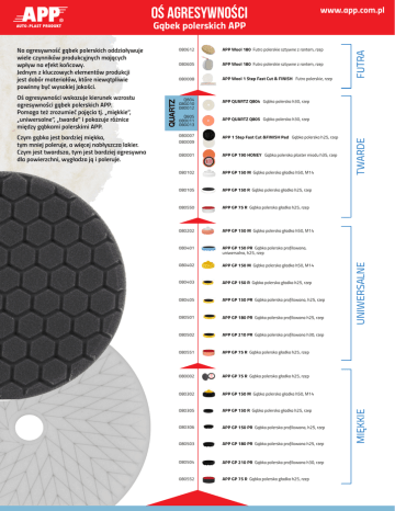 OŚ AGRESYWNOŚCI www.app.com.pl 080605 APP Wool 180 Futro polerskie sztywne z rantem, rzep 080008 APP Wool 1 Step Fast Cut & FINISH Futro polerskie, rzep Q804 080010 080012 APP QUARTZ Q804 Gąbka polerska h30, rzep Q805 080011 080013 APP QUARTZ Q805 Gąbka polerska h30, rzep 080007 080009 APP 1 Step Fast Cut &FINISH Pad Gąbka polerska h25, rzep 080001 APP GP 190 HONEY Gąbka polerska plaster miodu h35, rzep 080102 APP GP 150 M Gąbka polerska gładka h50, M14 080105 APP GP 150 R Gąbka polerska gładka h25, rzep 080550 APP GP 75 R Gąbka polerska gładka h25, rzep 080202 APP GP 150 M Gąbka polerska gładka h50, M14 080401 APP GP 150 PR Gąbka polerska profilowana, uniwersalna, h25, rzep 080402 APP GP 150 M Gąbka polerska gładka h50, M14 080403 APP GP 150 R Gąbka polerska gładka h25, rzep 080405 APP GP 150 PR Gąbka polerska profilowana, h25, rzep 080501 APP GP 180 PR Gąbka polerska profilowana h25, rzep 080502 APP GP 210 PR Gąbka polerska profilowana h30, rzep 080551 APP GP 75 R Gąbka polerska gładka h25, rzep 080002 APP GP 75 R Gąbka polerska gładka h25, rzep 080302 APP GP 150 M Gąbka polerska gładka h50, M14 080305 APP GP 150 R Gąbka polerska gładka h25, rzep 080306 APP GP 150 PR Gąbka polerska profilowana, h25, rzep 080503 APP GP 180 PR Gąbka polerska profilowana h25, rzep 080504 APP GP 210 PR Gąbka polerska profilowana h30, rzep 080552 APP GP 75 R Gąbka polerska gładka h25, rzep TWARDE Czym gąbka jest bardziej miękka, tym mniej poleruje, a więcej nabłyszcza lakier. Czym jest twardsza, tym jest bardziej agresywna dla powierzchni, wygładza ją i poleruje. APP Wool 180 Futro polerskie sztywne z rantem, rzep UNIWERSALNE Oś agresywności wskazuje kierunek wzrostu agresywności gąbek polerskich APP. Pomaga też zrozumieć pojęcia tj. „miękkie”, „uniwersalne”, „twarde” i pokazuje różnice między gąbkami polerskimi APP. 080612 MIĘKKIE Na agresywność gąbek polerskich oddziaływuje wiele czynników produkcyjnych mających wpływ na efekt końcowy. Jednym z kluczowych elementów produkcji jest dobór materiałów, które niewątpliwie powinny być wysokiej jakości. FUTRA Gąbek polerskich APP