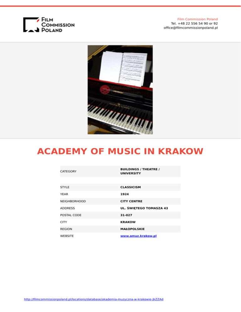 Film Commission Poland Tel. +48 22 556 54 90 or 92 office@filmcommissionpoland.pl ACADEMY OF MUSIC IN KRAKOW CATEGORY BUILDINGS / THEATRE / UNIVERSITY STYLE CLASSICISM YEAR 1924 NEIGHBORHOOD CITY CENTRE ADDRESS UL. ŚWIĘTEGO TOMASZA 43 POSTAL CODE 31-027 CITY KRAKOW REGION MAŁOPOLSKIE WEBSITE www.amuz.krakow.pl http://filmcommissionpoland.pl/locations/database/akademia-muzyczna-w-krakowie-JkZZAd Film Commission Poland Tel. +48 22 556 54 90 or 92 office@filmcommissionpoland.pl ABOUT LOCATION Cracow Music Academy - a national music academy with the seat in Kraków, educating musicians at the undergraduate (bachelor’s degree), graduate (master of arts degree) and post-graduate (doctoral degree) levels. It was founded as a conservatory by the Music Society in Kraków. The Academy has changed its seat many times, e.g. from 1906 to 1914 the Conservatory was located in the Art Nouveau building of Teatr Stary, during the First World War it moved to a tenement house at Krasińskiego St. Only in 1921 it returned to its seat near Szczepański Sq. The academic year 1946/47 was inaugurated at 8 and 9 Basztowa St. Currently, the main seat is the old building of KW PZPR (Voivodeship Committee of the Polish United Workers‘ Party) at 43 St Tomas St., designed by Ludwik Wojtyczko for the Commodities and Monetary Exchange and completed in 1924. The bank operation hall and KW PZPR session hall were adapted into the Prof. Krystyna MoszumańskaNazar Concert Hall (150-200 seats) and the Prof. Marek Stachowski Chamber Hall (120 seats); on the mezzanine a recording studio was opened (Electro-Acoustic Music Studio). The most important events of the Academy are held in the building of the former Towarzystwo Wzajemnych Ubezpieczeń ‘Florianka’ (the Society of Mutual Insurance) at 6-8 Basztowa St.,whose fine part was created in 1956. There are, among others, arcaded galleries, elongated vestibule, the former meeting hall (currently the Bronisław Rutkowski Concert Hall), and the so-called Senate Hall.The view from the terrace on the sixth floor of the Academy building, where a restaurant is located, with a panorama of the centre of Kraków, was used in Juliusz Machulski’s film Vinci. http://filmcommissionpoland.pl/locations/database/akademia-muzyczna-w-krakowie-JkZZAd