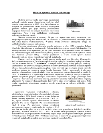 Historia uprawy buraka cukrowego Historia uprawy buraka cukrowego na ziemiach polskich posiada ponad dwustuletnią tradycję, gdyż została zapoczątkowana w 1802 roku. Już wówczas, ze względu na powszechnie znane wysokie wymagania glebowe buraka, pod jego uprawę przeznaczano najlepsze stanowiska, na których stosowano nawożenie Cukrownia organiczne. Pole, w celu dokładnego wyrównania zalecano trzykrotnie zaorać. Nasiona wysiewano w kwadraty. W tym celu wyznaczano siatkę kwadratów, a w miejscu przecięcia się linii umieszczano, w zależności od jakości materiału siewnego, jedno lub kilka nasion wielokiełkowych. W czasie zbioru zwracano szczególną uwagę na dokładność zbioru i jakość ogłowienia. Pierwsza odnotowana plantacja została założona w roku 1820 w majątku Polaka Józefa hr. Mycielskiego w miejscowości Gałowo koło Szamotuł, na terenie Wielkopolski. Po niedługim czasie burak uprawiano już nie tylko na terenie Wielkopolski i Śląska, ale również na terenach będących pod zaborami: rosyjskim (Guzów 1830), austriackim (Częstocice 1826) i na Pomorzu (.wiecie 1863) . Należy podkreślić, iż w tym czasie uprawa buraka koncentrowała się przede wszystkim w dużych majątkach. Znaczny wpływ na dalszy rozwój uprawy buraka miał gen. Dezydery Chłapowski, który w swoim majątku w Turwi wprowadził w miejsce pługów drewnianych pługi metalowe. Jest on autorem traktatu "O rolnictwie", w którym opisał zasady dobrej praktyki rolniczej. Jednocześnie do uprawy i pielęgnacji buraka zaczęto wprowadzać pierwsze narzędzia ręczne i konne (grace, tasaki, brony, opielacze, pługi, wozy polowe), a po niedługim czasie siewniki rzędowe, służące do wysiewu nasion buraka i rzepaku. Należy wspomnieć, iż pierwsze odmiany plonowały na poziomie około 10 t z ha, a zawartość cukru w korzeniach wynosiła 810%. W Zakładach H. Cegielskiego w Poznaniu rozpoczęto produkcję maszyn rolniczych, przede wszystkim pługów parowych i traktorów. Pojawienie się pługa parowego oraz " ciągówki" (tak wówczas nazywano traktor), umożliwiło staranne wykonanie orki na większą głębokość. Na wzrost wydajności buraka duży wpływ miało wprowadzenie pod koniec XIX wieku nawożenia mineralnego opartego przede wszystkim na saletrze chilijskiej i soli potasowej. Uprawiano wyłącznie wielokiełkowe odmiany diploidalne o zawartości cukru w korzeniu już wówczas przekraczającej 20%. Przed pierwszą wojną światową burak cukrowy uprawiano na powierzchni 176,5 tys. ha, a plon korzeni wynosił odpowiednio: w zaborze pruskim 27,3 t z ha, rosyjskim 19,3 t z ha i austriackim 12,3 t z ha. Po pierwszej wojnie światowej Historia cukrownictwa. powierzchnia uprawy zmniejszyła się o połowę (81,6 tys. ha), za. średni plon, ze względu na duże zniszczenia gospodarcze i niedobór środków produkcji, wynosił zaledwie 12,8 t z ha. W okresie międzywojennym uprawa buraka koncentrowała się w południowo-wschodniej części kraju oraz w pasie centralnym, głównie w Wielkopolsce. W latach 1937-1938 burak uprawiano w około 40 tys. gospodarstw (głównie w dużych majątkach), a średnia powierzchnia plantacji wynosiła 3,7 ha. Rozwój uprawy po II wojnie światowej Dynamiczny rozwój uprawy buraka rozpoczął się po II wojnie światowej. W roku 1946 liczba plantatorów wynosiła około 376 tysięcy, a w roku 1952 przekroczyła 1035 tysięcy. Ze względu na bardzo duże rozdrobnienie gospodarstw, średnia powierzchnia plantacji wynosiła 0,33 ha, a średni plon nieznacznie przekraczał 17 t z ha. Dominującym systemem produkcji buraka była w tym czasie uprawa tradycyjna. Stosowano wówczas gęsty siew, zaś większość prac w gospodarstwach indywidualnych wykonywana była przy dużym nakładzie pracy ludzkiej. Nieliczne traktory, pługi, siewniki i wyorywacze spotykano jedynie w gospodarstwach uspołecznionych. Nawożono przede wszystkim nawozem naturalnym obornikiem. Na przełomie lat 60 i 70 wprowadzono nową technologię uprawy buraka cukrowego. Zastosowanie siewu punktowego, nasion jednokiełkowych i herbicydów, jak również pełne zmechanizowanie zbioru, miało duży wpływ na obniżenie nakładów pracy ludzkiej. Wdrażanie nowych technologii wpływało na systematyczne podnoszenie plonów (po raz pierwszy uzyskano wydatek cukru przekraczający 4 t cukru z 1 ha), co skutkowało systematycznym zmniejszaniem się powierzchni uprawy. Dominujące jeszcze w latach sześćdziesiątych odmiany wielokiełkowe zostały stopniowo zastąpione przez odmiany jednokiełkowe. Wykorzystanie w hodowli efektu heterozji znacząco wpłynęło na podniesienie plonu i ograniczenie podatności buraka na chwościka. Celem uprawy buraka cukrowego, jaki stawiają sobie obecnie plantatorzy, jest uzyskanie wysokiego plonu korzeni o bardzo dużej zawartości cukru i dobrej jakości przetwórczej, wynikającej z niskiej zawartości związków melasotwórczych: N-ľ-aminowego, potasu i sodu, zapewniających powyżej 10 t cukru z ha. Nowoczesne odmiany buraka cukrowego charakteryzują się bardzo dobrym plonowaniem oraz doskonałą jakością technologiczną, a ponadto tolerancją na patogeny i zdolnością przystosowywania się do zmiennych warunków klimatycznoglebowych. Źródło: Uprawa Buraka Cukrowego w Gospodarstwach Ekologicznych Materiały dla rolników Praca zbiorowa pod redakcją dr J. Tyburskiego Radom 2004