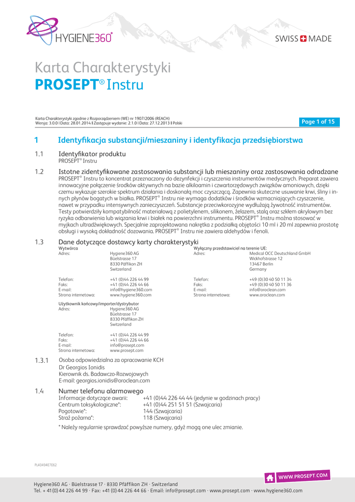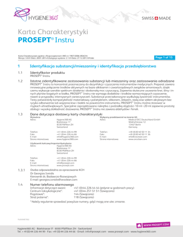 Karta Charakterystyki PROSEPT® Instru Karta Charakterystyki zgodnie z Rozporządzeniem (WE) nr 1907/2006 (REACH) Wersja: 3.0.0 | Data: 28.01.2014 || Zastępuje wydanie: 2.1.0 | Data: 27.12.2013 || Polski Page 1 of 15 1 Identyfikacja substancji/mieszaniny i identyfikacja przedsiębiorstwa 1.1 Identyfikator produktu PROSEPT® Instru 1.2 Istotne zidentyfikowane zastosowania substancji lub mieszaniny oraz zastosowania odradzane PROSEPT® Instru to koncentrat przeznaczony do dezynfekcji i czyszczenia instrumentów medycznych. Preparat zawiera innowacyjne połączenie środków aktywnych na bazie alkiloamin i czwartorzędowych związków amoniowych, dzięki czemu wykazuje szerokie spektrum działania i doskonałą moc czyszczącą. Zapewnia skuteczne usuwanie krwi, śliny i in nych płynów bogatych w białka. PROSEPT® Instru nie wymaga dodatków i środków wzmacniających czyszczenie, nawet w przypadku intensywnych zanieczyszczeń. Substancje przeciwkorozyjne wydłużają żywotność instrumentów. Testy potwierdziły kompatybilność materiałową z polietylenem, silikonem, żelazem, stalą oraz szkłem akrylowym bez ryzyka odbarwienia lub wiązania krwi i białek na powierzchni instrumentu. PROSEPT® Instru można stosować w myjkach ultradźwiękowych. Specjalnie zaprojektowana nakrętka z podziałką objętości 10 ml i 20 ml zapewnia prostotę obsługi i wysoką dokładność dozowania. PROSEPT® Instru nie zawiera aldehydów i fenoli. 1.3 Dane dotyczące dostawcy karty charakterystyki Wytwórca Adres: Telefon: Faks: Email: Strona internetowa: Hygiene360 AG Büelstrasse 17 8330 Päffikon ZH Switzerland Wyłączny przedstawiciel na terenie UE: Adres: Medical OCC Deutschland GmbH Wickhofstrasse 12 13467 Berlin Germany +41 (0)44 226 44 99 +41 (0)44 226 44 66 info@hygiene360.com www.hygiene360.com Telefon: Faks: Email: Strona internetowa: +49 (0)30 40 50 11 34 +49 (0)30 40 50 11 36 info@oroclean.com www.oroclean.com Użytkownik końcowy/importer/dystrybutor Adres: Hygiene360 AG Büelstrasse 17 8330 Pfäffikon ZH Switzerland Telefon: Faks: Email: Strona internetowa: +41 (0)44 226 44 99 +41 (0)44 226 44 66 info@prosept.com www.prosept.com 1.3.1 Osoba odpowiedzialna za opracowanie KCH Dr Georgios Ionidis Kierownik ds. BadawczoRozwojowych Email: georgios.ionidis@oroclean.com 1.4 Numer telefonu alarmowego Informacje dotyczące awarii: Centrum toksykologiczne*: Pogotowie*: Straż pożarna*: +41 (0)44 226 44 44 (jedynie w godzinach pracy) +41 (0)44 251 51 51 (Szwajcaria) 144 (Szwajcaria) 118 (Szwajcaria) * Należy regularnie sprawdzać powyższe numery, gdyż mogą one ulec zmianie. PL40494E7E62 Server Error in '/' Application. Hygiene360 AG · Büelstrasse 17 · 8330 Pfäffikon ZH · Switzerland Tel. + 41 (0) 44 226 44 99 · Fax: +41 (0) 44 226 44 66 · Email: [email protected] · www.prosept.com · www.hygiene360.com Karta Charakterystyki PROSEPT® Instru Karta Charakterystyki zgodnie z Rozporządzeniem (WE) nr 1907/2006 (REACH) Wersja: 3.0.0 | Data: 28.01.2014 || Zastępuje wydanie: 2.1.0 | Data: 27.12.2013 || Polski 2 Identyfikacja zagrożeń 2.1 Klasyfikacja substancji lub mieszaniny 2.1.1 Klasyfikacja zgodnie z Dyrektywą 1999/45/WE Page 2 of 15 C: Substancja żrąca N: Działanie szkodliwe dla środowiska R34 Powoduje oparzenia. R50 Działa bardzo toksycznie na organizmy wodne. 2.2 Elementy oznakowania 2.2.1 Oznakowanie zgodnie z Dyrektywą 1999/45/WE Symbol: C: Substancja żrąca N: Działanie szkodliwe dla środowiska Zwroty R: R34 Powoduje oparzenia. R50 Działa bardzo toksycznie na organizmy wodne. Zwroty S: S2 Chronić przed dziećmi. S26 Zanieczyszczone oczy przemyć natychmiast dużą ilością wody i zasięgnąć porady lekarza. S28 Zanieczyszczoną skórę natychmiast przemyć dużą ilością wody. S37/39 Nosić odpowiednie rękawice ochronne i okulary lub ochronę twarzy. S46 W razie połknięcia niezwłocznie zasięgnij porady lekarza – pokaż opakowanie lub etykietę. 2.3 Inne zagrożenia Niniejsza mieszanina nie należy do kategorii PBT lub vPvB zgodnie z REACH, aneks XIII. 3 Skład / Informacja o składnikach 3.1 Substancje Niniejszy produkt jest mieszaniną (patrz część 3.2). 3.2 Mieszaniny PL40494E7E62 Server Error in '/' Application. Hygiene360 AG · Büelstrasse 17 · 8330 Pfäffikon ZH · Switzerland Tel. + 41 (0) 44 226 44 99 · Fax: +41 (0) 44 226 44 66 · Email: [email protected] · www.prosept.com · www.hygiene360.com Karta Charakterystyki PROSEPT® Instru Karta Charakterystyki zgodnie z Rozporządzeniem (WE) nr 1907/2006 (REACH) Wersja: 3.0.0 | Data: 28.01.2014 || Zastępuje wydanie: 2.1.0 | Data: 27.12.2013 || Polski 3.2.1 Page 3 of 15 Niebezpieczne składniki Klasyfikacja zgodnie z Dyrektywą 67/548/EWG Nazwa Numer CAS Numer EINECS Numer in deksu Numer REACH Symbole zagrożeń: Zwroty R: Stężenie N(3aminopropylo)Ndode 2372829 cylopropano1,3–diamina 2191458 n.a. 05211587494331 0000 C, N R22, R34, R50 5% < 15% chlorek didecylodimetyloa monu 7173515 2305252 612131006 05211577276532 0000 C, N R22, R34, R50 2.5% < 5% Isotridecanol, ethoxylated 69011365 5002416 n.a. 05211595665925 0000 Xi R22, R41 2.5% < 5% Numer REACH Kategorie zagrożeń Zwroty wskazujące rodzaj zagrożeni Stężenie Klasyfikacja zgodnie z Rozporządzeniem (WE) nr 1272/2008 Nazwa 3.2.2 Numer CAS Numer EINECS Numer in deksu N(3aminopropylo)Ndode 2372829 cylopropano1,3–diamina 2191458 n.a. 05211587494331 0000 Acute Tox. 3, Skin Corr. H301, H314, 1B, STOT RE 2, Aquatic H373, H400, Acute 1, Aquatic H410 Chronic 1 5% < 15% chlorek didecylodimetyloa monu 7173515 2305252 61213100 05211577276532 6 0000 Acute Tox. 4, Skin Corr. H302, H314, 1B, Aquatic Acute 1 H400 2.5% < 5% Isotridecanol, ethoxylated 69011365 5002416 n.a. 05211595665925 0000 Acute Tox. 4, Eye Dam H302, H318, age 1 2.5% < 5% Informacje dodatkowe Pełen tekst wymienionych zwrotów R i H podano w części 16 . 4 Środki pierwszej pomocy 4.1 Opis środków pierwszej pomocy 4.1.1 Zalecenia ogólne Zapewnić środki ochrony. Stosowa