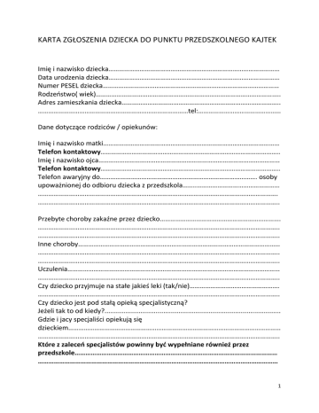karta zgłoszenia dziecka do punktu przedszkolnego kajtek