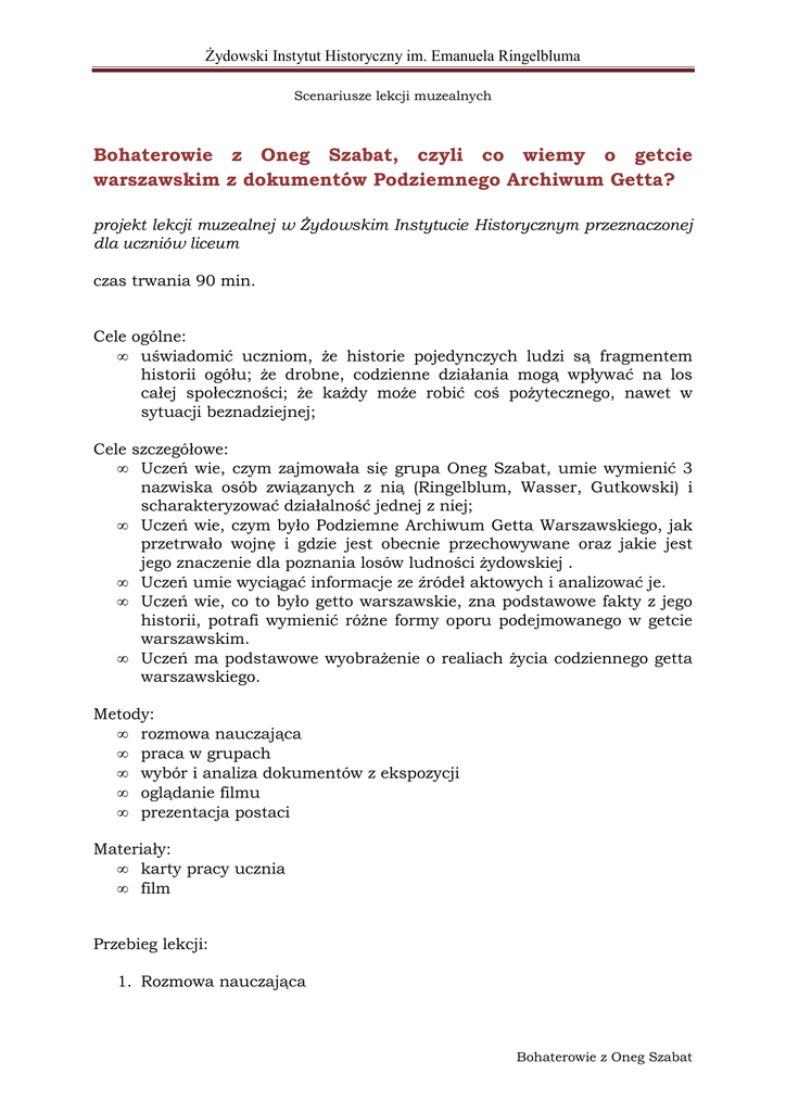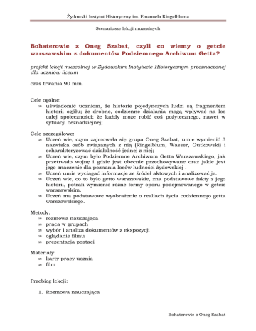 Żydowski Instytut Historyczny im. Emanuela Ringelbluma Scenariusze lekcji muzealnych Bohaterowie z Oneg Szabat, czyli co wiemy o getcie warszawskim z dokumentów Podziemnego Archiwum Getta? projekt lekcji muzealnej w Żydowskim Instytucie Historycznym przeznaczonej dla uczniów liceum czas trwania 90 min. Cele ogólne: • uświadomić uczniom, że historie pojedynczych ludzi są fragmentem historii ogółu; że drobne, codzienne działania mogą wpływać na los całej społeczności; że każdy może robić coś pożytecznego, nawet w sytuacji beznadziejnej; Cele szczegółowe: • Uczeń wie, czym zajmowała się grupa Oneg Szabat, umie wymienić 3 nazwiska osób związanych z nią (Ringelblum, Wasser, Gutkowski) i scharakteryzować działalność jednej z niej; • Uczeń wie, czym było Podziemne Archiwum Getta Warszawskiego, jak przetrwało wojnę i gdzie jest obecnie przechowywane oraz jakie jest jego znaczenie dla poznania losów ludności żydowskiej . • Uczeń umie wyciągać informacje ze źródeł aktowych i analizować je. • Uczeń wie, co to było getto warszawskie, zna podstawowe fakty z jego historii, potrafi wymienić różne formy oporu podejmowanego w getcie warszawskim. • Uczeń ma podstawowe wyobrażenie o realiach życia codziennego getta warszawskiego. Metody: • rozmowa nauczająca • praca w grupach • wybór i analiza dokumentów z ekspozycji • oglądanie filmu • prezentacja postaci Materiały: • karty pracy ucznia • film Przebieg lekcji: 1. Rozmowa nauczająca Bohaterowie z Oneg Szabat Żydowski Instytut Historyczny im. Emanuela Ringelbluma Scenariusze lekcji muzealnych P: Co to jest getto? U: Dzielnica zamknięta. W czasie II wojny światowej Niemcy tworzyli zamknięte dzielnice dla Żydów. P: Kogo tam zamykano? Kto to jest Żyd? U: Wyznawca judaizmu; osoba narodowości żydowskiej; P: Naziści stosowali kryterium rasy, według nich Żydem była osoba, której 4 lub 3 dziadkowie należeli do gminy żydowskiej; stworzyli też kategorie półŻydów i ćwierć-Żydów. W getcie warszawskim znalazły się poza Żydami religijnymi i narodowymi Polacy, którzy nie czuli żadnego związku z religią, kulturą, narodowością żydowską. Gdzie w Warszawie było getto? [pokazujemy mapę i spis ulic przy wejściu na ekspozycję – prosimy ucznia o opisanie granic getta] P: Jak wielu ludzi było w getcie? (W Polsce mieszkało przed wojną 32 mln ludzi, w tym 3,5 mln Żydów) uczniowie wymieniają różne liczby; P: Przed wojną w Warszawie mieszkało ponad 300 tys. Żydów, ale przesiedlono do niej Żydów z terenów wcielonych do Rzeszy – Śląska, Poznańskiego, częściowo z Łodzi; z małych miasteczek blisko Warszawy; w końcu z Niemiec i krajów zachodnich. Wiosną 1941 r. w getcie warszawskim przebywało 460 tys. ludzi. Gęstość zaludnienia wynosiła 9 osób na izbę. Getto w Warszawie zostało zamknięte 15 listopada 1940 r. Można wyróżnić 4 etapy jego istnienia. Do 22 lipca 1942 istniało wielkie getto gęsto zaludnione; ludzie w nim głodowali, chorowali, umierali masowo; ci, którzy mogli, próbowali żyć normalnie, pracować, uczyć się. Drugi etap to czas wielkiej akcji od 22 lipca do 21 września 1943 r. W tym czasie ok. 280 tys. mieszkańców getta Niemcy wywieźli do obozu zagłady w Treblince i tam zamordowali w komorach gazowych. W getcie jest to czas blokad domów przez policję i transportów na Umschlagplatz i do obozu zagłady w Treblince. Następny okres to czas getta szczątkowego. Po wielkiej akcji Żydzi w getcie pracowali w fabrykach niemieckich zamienionych w rodzaj obozów pracy. Ostatni okres to powstanie w getcie 19 kwietnia – 16 maja 1943 r., kiedy grupy uzbrojonej młodzieży podjęły walkę z Niemcami. Niemcy spalili wtedy getto dom po domu. Ostatnim aktem pacyfikacji getta było wysadzenie w powietrze wielkiej synagogi na Tłomackiem. Stała ona tam, gdzie Błękitny Wieżowiec. Wybuch znacznie uszkodził budynek, w którym teraz jesteśmy, ale nie zniszczył go. A teraz mam pytanie do was: jak myślicie, skąd ja to wszystko wiem? U: Z książek, dokumentów, gazet, fotografii, relacji ludzi, filmów, z pozostałości po budynkach, przedmiotów. P: Historię piszą historycy w oparciu o różne źródła informacji. Dlatego w sytuacji, gdy chcemy, żeby coś zostało zapamiętane, musimy przekazać informację – w różny sposób. Chcę wam dzisiaj pokazać, jak ludzie, którzy byli w getcie, starali się przekazać prawdę o potwornych rzeczach tam się dziejących światu i potomnym. Bohaterowie z Oneg Szabat Żydowski Instytut Historyczny im. Emanuela Ringelbluma Scenariusze lekcji muzealnych 2. Poszukiwania na ekspozycji Dzielimy klasę na 3 grupy. Każda grupa otrzymuje kartę pracy dotyczącą jednej z następujących osób: 1) Emanuel Ringelblum, 2) Hersz Wasser oraz 3) Eliasz Gutkowski. W każdej jest 6 wersów na wymienienie 6 eksponatów. Karta wygląda następująco: HERSZ WASSER (lub RINGELBLUM lub GUTKOWSKI) dokument/eksponat czego dowiadujemy się o Jakie informacje o getcie Herszu Wasserze? przekazuje nam ten dokument? biogram Prosimy uczniów, by bardzo uważnie obejrzeli ekspozycję i wynotowali w pierwszej kolumnie wszystkie dokumenty, eksponaty, wzmianki, fotografie, w których pojawia się nazwisko osoby przypisanej do ich grupy. Niech znajdą też biogram. Wzmianek ma być minimum sześć. Najlepiej niech się podzielą, aby nie musiał każdy oglądać całej ekspozycji, tylko fragmenty. Są 4 dokumenty, biogram oraz liczne cytaty z kroniki dot. Emanuela Rigelbluma; Jest 14 wzmianek o Wasserze, 8 o Gutkowskim1. 3. Analiza dokumentów Prosimy uczniów o wypełnienie drugiej kolumny. Pracują w tych samych grupach. 4. Film Po wypełnieniu drugiej kolumny zbieramy wszystkich w sali kinowej i puszczamy film o getcie. Zapowiadamy przedtem, że obejrzenie filmu ma ułatwić wypełnienie trzeciej kolumny. Prosimy, by byli uważni na to i wypełniali nawet w czasie trwania filmu. 5. Pre