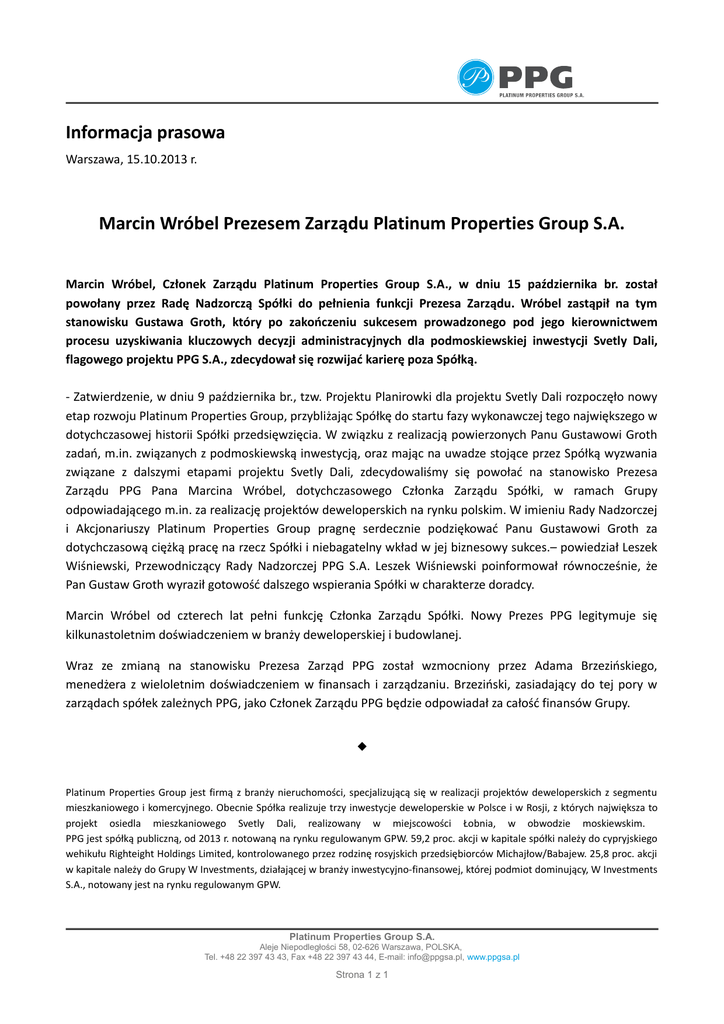 Informacja prasowa Warszawa, 15.10.2013 r. Marcin Wróbel Prezesem Zarządu Platinum Properties Group S.A. Marcin Wróbel, Członek Zarządu Platinum Properties Group S.A., w dniu 15 października br. został powołany przez Radę Nadzorczą Spółki do pełnienia funkcji Prezesa Zarządu. Wróbel zastąpił na tym stanowisku Gustawa Groth, który po zakończeniu sukcesem prowadzonego pod jego kierownictwem procesu uzyskiwania kluczowych decyzji administracyjnych dla podmoskiewskiej inwestycji Svetly Dali, flagowego projektu PPG S.A., zdecydował się rozwijać karierę poza Spółką. - Zatwierdzenie, w dniu 9 października br., tzw. Projektu Planirowki dla projektu Svetly Dali rozpoczęło nowy etap rozwoju Platinum Properties Group, przybliżając Spółkę do startu fazy wykonawczej tego największego w dotychczasowej historii Spółki przedsięwzięcia. W związku z realizacją powierzonych Panu Gustawowi Groth zadań, m.in. związanych z podmoskiewską inwestycją, oraz mając na uwadze stojące przez Spółką wyzwania związane z dalszymi etapami projektu Svetly Dali, zdecydowaliśmy się powołać na stanowisko Prezesa Zarządu PPG Pana Marcina Wróbel, dotychczasowego Członka Zarządu Spółki, w ramach Grupy odpowiadającego m.in. za realizację projektów deweloperskich na rynku polskim. W imieniu Rady Nadzorczej i Akcjonariuszy Platinum Properties Group pragnę serdecznie podziękować Panu Gustawowi Groth za dotychczasową ciężką pracę na rzecz Spółki i niebagatelny wkład w jej biznesowy sukces.– powiedział Leszek Wiśniewski, Przewodniczący Rady Nadzorczej PPG S.A. Leszek Wiśniewski poinformował równocześnie, że Pan Gustaw Groth wyraził gotowość dalszego wspierania Spółki w charakterze doradcy. Marcin Wróbel od czterech lat pełni funkcję Członka Zarządu Spółki. Nowy Prezes PPG legitymuje się kilkunastoletnim doświadczeniem w branży deweloperskiej i budowlanej. Wraz ze zmianą na stanowisku Prezesa Zarząd PPG został wzmocniony przez Adama Brzezińskiego, menedżera z wieloletnim doświadczeniem w finansach i zarządzaniu. Brzeziński, zasiadający do tej pory w zarządach spółek zależnych PPG, jako Członek Zarządu PPG będzie odpowiadał za całość finansów Grupy. Platinum Properties Group jest firmą z branży nieruchomości, specjalizującą się w realizacji projektów deweloperskich z segmentu mieszkaniowego i komercyjnego. Obecnie Spółka realizuje trzy inwestycje deweloperskie w Polsce i w Rosji, z których największa to projekt osiedla mieszkaniowego Svetly Dali, realizowany w miejscowości Łobnia, w obwodzie moskiewskim. PPG jest spółką publiczną, od 2013 r. notowaną na rynku regulowanym GPW. 59,2 proc. akcji w kapitale spółki należy do cypryjskiego wehikułu Righteight Holdings Limited, kontrolowanego przez rodzinę rosyjskich przedsiębiorców Michajłow/Babajew. 25,8 proc. akcji w kapitale należy do Grupy W Investments, działającej w branży inwestycyjno-finansowej, której podmiot dominujący, W Investments S.A., notowany jest na rynku regulowanym GPW. Platinum Properties Group S.A. Aleje Niepodległości 58, 02-626 Warszawa, POLSKA, Tel. +48 22 397 43 43, Fax +48 22 397 43 44, E-mail: [email protected], www.ppgsa.pl Strona 1 z 1