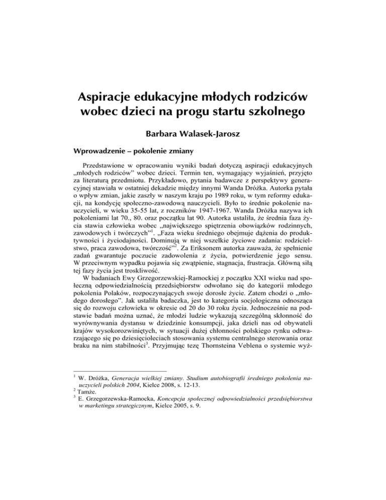 Aspiracje edukacyjne młodych rodziców wobec dzieci na progu startu szkolnego Barbara Walasek-Jarosz Wprowadzenie – pokolenie zmiany Przedstawione w opracowaniu wyniki badań dotyczą aspiracji edukacyjnych „młodych rodziców” wobec dzieci. Termin ten, wymagający wyjaśnień, przyjęto za literaturą przedmiotu. Przykładowo, pytania badawcze z perspektywy generacyjnej stawiała w ostatniej dekadzie między innymi Wanda Dróżka. Autorka pytała o wpływ zmian, jakie zaszły w naszym kraju po 1989 roku, w tym reformy edukacji, na kondycję społeczno-zawodową nauczycieli. Było to średnie pokolenie nauczycieli, w wieku 35-55 lat, z roczników 1947-1967. Wanda Dróżka nazywa ich pokoleniami lat 70., 80. oraz początku lat 90. Autorka ustaliła, że średnia faza życia stawia człowieka wobec „największego spiętrzenia obowiązków rodzinnych, zawodowych i twórczych”1. „Faza wieku średniego obejmuje dążenia do produktywności i życiodajności. Dominują w niej wszelkie życiowe zadania: rodzicielstwo, praca zawodowa, twórczość”2. Za Eriksonem autorka zauważa, że spełnienie zadań gwarantuje poczucie zadowolenia z życia, potwierdzenie jego sensu. W przeciwnym wypadku pojawia się zwątpienie, stagnacja, frustracja. Główną siłą tej fazy życia jest troskliwość. W badaniach Ewy Grzegorzewskiej-Ramockiej z początku XXI wieku nad społeczną odpowiedzialnością przedsiębiorstw odwołano się do kategorii młodego pokolenia Polaków, rozpoczynających swoje dorosłe życie. Zatem chodzi o „młodego dorosłego”. Jak ustaliła badaczka, jest to kategoria socjologiczna odnosząca się do rozwoju człowieka w okresie od 20 do 30 roku życia. Jednocześnie na podstawie badań można uznać, że młodzi ludzie wykazują szczególną skłonność do wyrównywania dystansu w dziedzinie konsumpcji, jaka dzieli nas od obywateli krajów wysokorozwiniętych, w sytuacji dużej chłonności polskiego rynku odtwarzającego się po dziesięcioleciach stosowania systemu centralnego sterowania oraz braku na nim stabilności3. Przyjmując tezę Thornsteina Veblena o systemie wyż- 1 W. Dróżka, Generacja wielkiej zmiany. Studium autobiografii średniego pokolenia nauczycieli polskich 2004, Kielce 2008, s. 12-13. 2 Tamże. 3 E. Grzegorzewska-Ramocka, Koncepcja społecznej odpowiedzialności przedsiębiorstwa w marketingu strategicznym, Kielce 2005, s. 9. 130 Barbara Walasek-Jarosz szego kształcenia jako wyrazie kultury pieniężnej4, ustalenie to nie jest obojętne dla prezentowanych tu treści. Stąd w świetle powyższych ustaleń i faktu, że chodzi tu również o spełnianie ról rodzicielskich wobec sześcioletnich dzieci, zarezerwowana dla analiz kategoria „młody rodzic” wydaje się właściwa, choć modalnie – co dowodzą przedstawione dalej dane – mamy do czynienia raczej już ze swoistym przejściem większości badanych rodziców z młodości do wieku średniego. W roku badań – 2006, respondenci kończyli młodość i „wchodzili” w wiek średni. 1. Hipoteza o socjalizacyjnych uwarunkowaniach orientacji aksjologicznych młodych osób Istotnym wyróżnikiem rozważań jest rok 1989. To w nim symbolicznie dokonała się zmiana systemowa w Polsce. Krystyna Szafraniec zauważa, że wielu badaczy rzeczywistości polskiej okresu wczesnej transformacji ustrojowej zwraca uwagę na zaniedbywane obszary ludzkiej aktywności lub wręcz zanik wielkich dyskusji. Chodzi tu o kryzys wielkich idei, erozję naczelnych norm, wartości regulujących funkcjonowanie dawnego monocentrycznego ładu, w tle zaś pojawia się niezdecydowanie, entropia, nieprzewidywalność. Poszczególni obywatele, zresztą podobnie jak demokratyczne młode państwo, nie radzą sobie z wieloma problemami. Powraca tęsknota za ładem PRL, z którym nie tak dawno walczono. „Demokratyczne reguły gry, które były przedmiotem aspiracji politycznych większości Polaków, obracają się przeciwko samym sobie”5. W tym sensie pytania o mechanizmy stawania się nowego aksjonormatywnego ładu nabierają zasadniczego znaczenia dla przewidywania zmian społecznych. Jakie grupy społeczne biorą w tym udział, z jakimi procedurami socjalizacyjnymi mamy tu do czynienia? Powyższe pytania mają swoje ugruntowanie w tezie, że o kształcie społeczeństwa mogą decydować pokolenia, które stają się przy tym siłami społecznie formującymi, bowiem wyznacza to wspólnota postaw, motywacji, systemów wartości, wymuszających przekaz kulturowy i wymianę generacyjną. Takie podejście wiąże się z określeniem pokolenia jako wyniku determinacji przez strukturę społeczną. Granice czasowe, w których pojawia się pokolenie są dość płynne i ustalane niejednokrotnie w sposób arbitralny6. W większości definicji zwraca się uwagę na potrzebę określenia znaczących wydarzeń historycznych, by wyodrębnić pokolenie. Wiele przemawia za tym, że młodzież polską lat 90. można uznać za pokolenie. 4 T. Veblen, Teoria klasy próżniaczej, tłum. J. Frenzel-Zagórska, Warszawa 2008, s. 305-336. K. Szafraniec, Stawanie się nowego aksjonormatywnego ładu. Perspektywa ujęcia międzygeneracyjnego, „Socjologia Wychowania”, XIV, zeszyt 339, Acta Universitatis Nicolai Copernici, Toruń 2000, s. 4. 6 Tamże, s. 8. 5 Aspiracje edukacyjne młodych rodziców wobec dzieci na progu startu szkolnego 131 Krystyna Szafraniec stwierdza, że dla tej generacji stosuje się różne terminy: „pokolenie bez wzorca, młodzież z importu, dzieci wolnego rynku, młodzi niegniewni, pokolenie X, generacja Y, znudzona generacja, medialni niewolnicy, pokolenie sukcesu”. Ukształtowały ją pograniczność epok ustrojowych (z ofertą z przeszłości i z „duchem” czasu) oraz stan społecznego zamętu i anomii, także zamętu aksjonormatywnego. Przekaz socjalizacyjny może więc być zakłócony. Ale jednocześnie przy braku odniesień, wzorców, poszerzaniu tendencji do prywatyzacji i indywidualizacji 