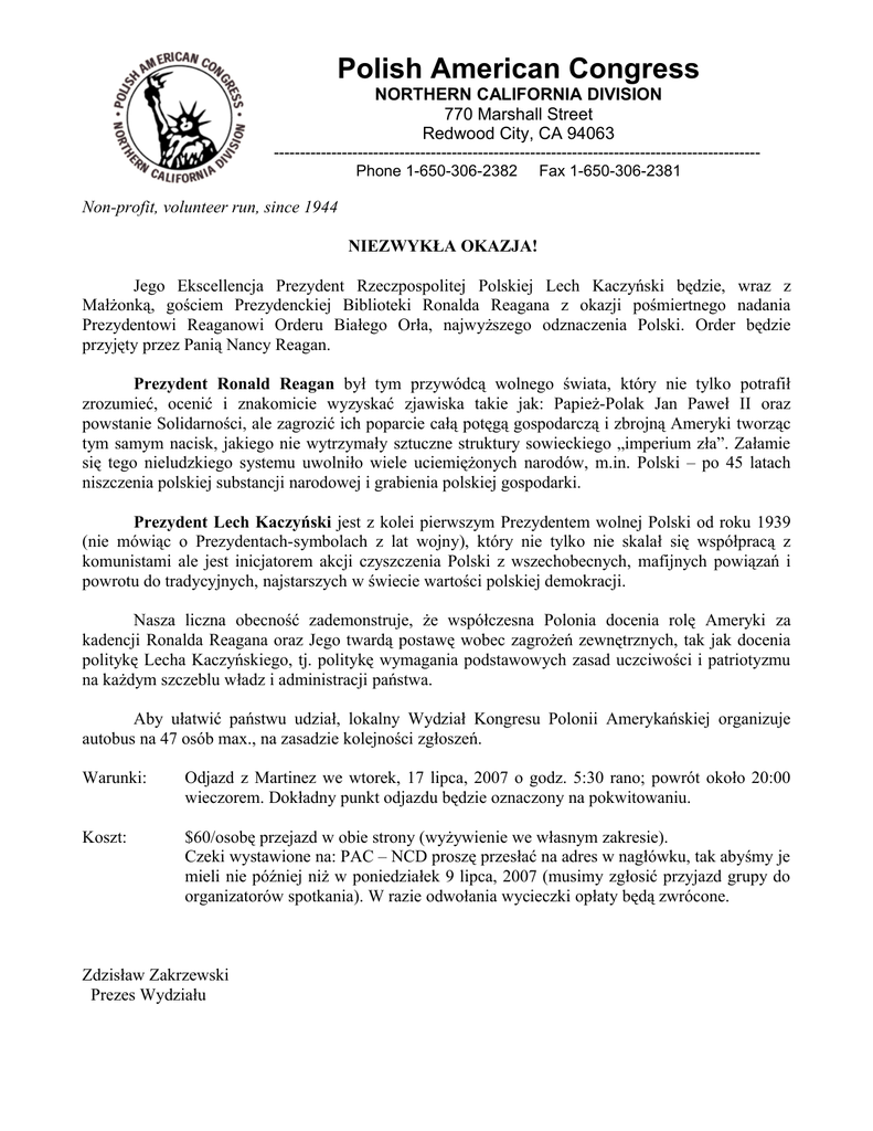 Polish American Congress NORTHERN CALIFORNIA DIVISION 770 Marshall Street Redwood City, CA 94063 --------------------------------------------------------------------------------------------Phone 1-650-306-2382 Fax 1-650-306-2381 Non-profit, volunteer run, since 1944 NIEZWYKŁA OKAZJA! Jego Ekscellencja Prezydent Rzeczpospolitej Polskiej Lech Kaczyński będzie, wraz z Małżonką, gościem Prezydenckiej Biblioteki Ronalda Reagana z okazji pośmiertnego nadania Prezydentowi Reaganowi Orderu Białego Orła, najwyższego odznaczenia Polski. Order będzie przyjęty przez Panią Nancy Reagan. Prezydent Ronald Reagan był tym przywódcą wolnego świata, który nie tylko potrafił zrozumieć, ocenić i znakomicie wyzyskać zjawiska takie jak: Papież-Polak Jan Paweł II oraz powstanie Solidarności, ale zagrozić ich poparcie całą potęgą gospodarczą i zbrojną Ameryki tworząc tym samym nacisk, jakiego nie wytrzymały sztuczne struktury sowieckiego „imperium zła”. Załamie się tego nieludzkiego systemu uwolniło wiele uciemiężonych narodów, m.in. Polski – po 45 latach niszczenia polskiej substancji narodowej i grabienia polskiej gospodarki. Prezydent Lech Kaczyński jest z kolei pierwszym Prezydentem wolnej Polski od roku 1939 (nie mówiąc o Prezydentach-symbolach z lat wojny), który nie tylko nie skalał się współpracą z komunistami ale jest inicjatorem akcji czyszczenia Polski z wszechobecnych, mafijnych powiązań i powrotu do tradycyjnych, najstarszych w świecie wartości polskiej demokracji. Nasza liczna obecność zademonstruje, że współczesna Polonia docenia rolę Ameryki za kadencji Ronalda Reagana oraz Jego twardą postawę wobec zagrożeń zewnętrznych, tak jak docenia politykę Lecha Kaczyńskiego, tj. politykę wymagania podstawowych zasad uczciwości i patriotyzmu na każdym szczeblu władz i administracji państwa. Aby ułatwić państwu udział, lokalny Wydział Kongresu Polonii Amerykańskiej organizuje autobus na 47 osób max., na zasadzie kolejności zgłoszeń. Warunki: Odjazd z Martinez we wtorek, 17 lipca, 2007 o godz. 5:30 rano; powrót około 20:00 wieczorem. Dokładny punkt odjazdu będzie oznaczony na pokwitowaniu. Koszt: $60/osobę przejazd w obie strony (wyżywienie we własnym zakresie). Czeki wystawione na: PAC – NCD proszę przesłać na adres w nagłówku, tak abyśmy je mieli nie później niż w poniedziałek 9 lipca, 2007 (musimy zgłosić przyjazd grupy do organizatorów spotkania). W razie odwołania wycieczki opłaty będą zwrócone. Zdzisław Zakrzewski Prezes Wydziału