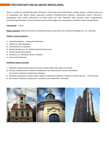 PROTESTANTYZM NA MAPIE WROCŁAWIA Wyrusz w podróż po protestanckiej historii Wrocławia ! Fascynujący świat protestantyzmu, bogato wpisany w historię miasta, jest na wyciągnięcie ręki. Spacer wiedzie oryginalnym szlakiem architektonicznych zabytków, ciekawostek znanych nielicznym i intrygujących losów postaci zasłużonych dla historii grodu nad Odrą. Oferujemy także poznanie smaku współczesnego, protestanckiego Wrocławia ! Poznaj prawdziwe zróżnicowanie religijne oraz wielowiekowe dziedzictwo stolicy Dolnego Śląska. Czas trwania : 2 godz. Miejsce spotkania: skwer przy pomniku Kryształowej Planety/ skrzyżowanie ulic Kazimierza Wielkiego oraz św. Antoniego Obiekty na trasie zwiedzania: 1. Kościół Ewangelicko - Augsburski Opatrzności 2. Katedra św. Marii Magdaleny 3. Dom Heinricha von Rybischa 4. Bazylika Mniejsza pw. Św. Elżbiety (Kościół Garnizonowy) 5. Pomnik Dietricha Bonhoeffera 6. Kościół p w. śś. Stanisława, Doroty i Wacława 7. Uniwersytet Wrocławski Dodatkowe usługi na życzenie: 1. Możliwość zorganizowania przerwy kawowej w kawiarni Bike Cafe ( grupa do 25 osób). 2. Dla grup zorganizowanych możliwość udostępnienia sali wyposażonej w sprzęt multimedialny. Na życzenie możliwość przygotowania cateringu.* 3. Możliwość rezerwacji lub zakupu biletów wstępu na wydarzenia kulturalne w Dzielnicy Czterech Wyznań – 20 PLN/ grupa* 4. Na życzenie możliwość przygotowania upominków oraz wydawnictw o Wrocławiu. PROTESTANTYZM NA MAPIE WROCŁAWIA Zamówienia prosimy składać przez formularz kontaktowy znajdujący się na stronie: www.dzielnica4wyznan.info.pl lub na adres e-mail: [email protected] Centrum Informacji Turystycznej i Rowerowej ul. Św. Antoniego 8 50-073 Wrocław + 48 71 346 15 34