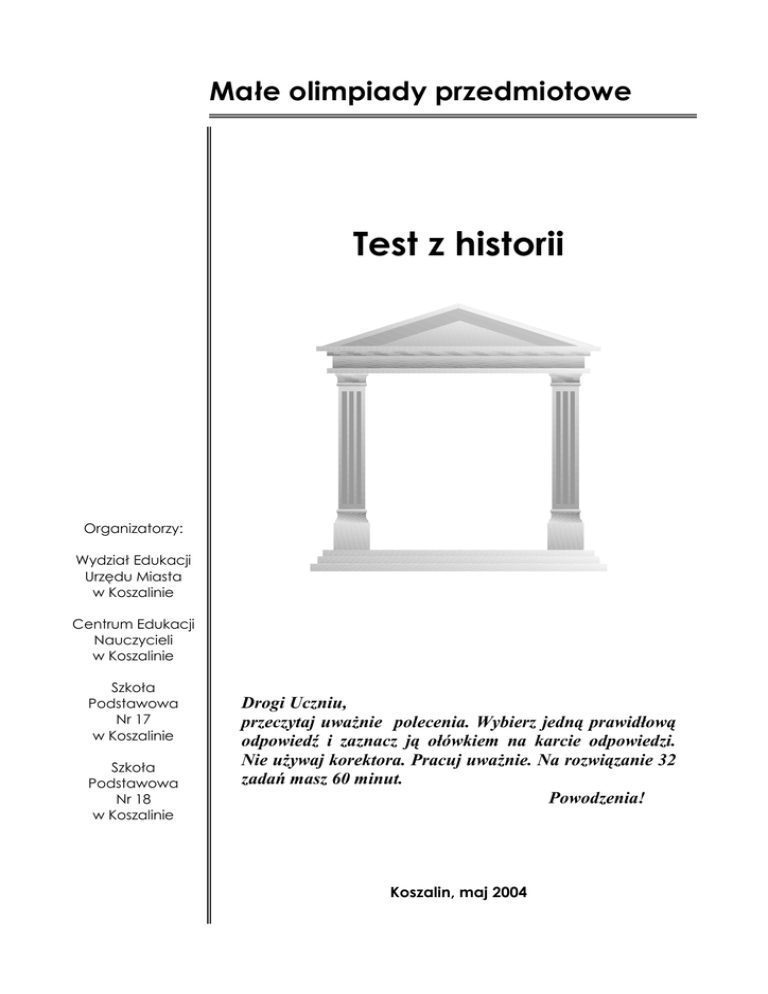 Małe olimpiady przedmiotowe Test z historii Organizatorzy: Wydział Edukacji Urzędu Miasta w Koszalinie Centrum Edukacji Nauczycieli w Koszalinie Szkoła Podstawowa Nr 17 w Koszalinie Szkoła Podstawowa Nr 18 w Koszalinie Drogi Uczniu, przeczytaj uwaŜnie polecenia. Wybierz jedną prawidłową odpowiedź i zaznacz ją ołówkiem na karcie odpowiedzi. Nie uŜywaj korektora. Pracuj uwaŜnie. Na rozwiązanie 32 zadań masz 60 minut. Powodzenia! Koszalin, maj 2004 1. Która z linii władców jest prawdziwa ? A. Władysław Jagiełło, Kazimierz Jagiellończyk, Jan Olbracht, Zygmunt I Stary, Zygmunt II August, Władysław Warneńczyk, Aleksander B. Kazimierz Jagiellończyk, Zygmunt I Stary, Władysław Warneńczyk, Aleksander, Władysław Jagiełło, Jan Olbracht, Zygmunt II August C. Władysław Jagiełło, Władysław Warneńczyk, Kazimierz Jagiellończyk, Jan Olbracht, Aleksander, Zygmunt I Stary, Zygmunt II August D. Władysław Warneńczyk, Kazimierz Jagiellończyk, Władysław Jagiełło, Jan Olbracht, Aleksander, Zygmunt I Stary, Zygmunt II August 2. Który z władców pochodził z dynastii Wazów? A. Jan Olbracht B. Jan III Sobieski C. Jan Kazimierz D. Kazimierz Odnowiciel 3. WskaŜ szereg, w którym wydarzenia ułoŜono w kolejności chronologicznej. A. chrzest Polski, bitwa pod Grunwaldem, zjazd w Gnieźnie B. bitwa pod Grunwaldem, chrzest Polski, konstytucja 3 maja, bitwa pod Grunwaldem C. zjazd w Gnieźnie, bitwa pod Grunwaldem, konstytucja 3 maja D. chrzest Polski, konstytucja 3 maja, bitwa pod Grunwaldem 4. Z jakim wydarzeniem z historii Polski kojarzy się cesarz niemiecki Otto III? A. pokój w Budziszynie 1018 r. B. bitwa pod Grunwaldem 1410 r. C. II pokój w Toruniu 1466 r. D. zjazd w Gnieźnie 1000 r. 5. Kto sprowadził Zakon KrzyŜacki do Polski? A. Władysław Jagiełło B. Konrad Mazowiecki C. Kazimierz Wielki D. Kazimierz Jagiellończyk 6. Który władca poparł obóz gregoriański w XI wieku? A. Bolesław Chrobry B. Przemysł II C. Bolesław Krzywousty D. Bolesław Szczodry 7. W jakim mieście powstał pierwszy uniwersytet w Polsce? A. Wilnie B. Lwowie C. Krakowie D. Warszawie 8. W jakim mieście zawarto Pokój wieczysty z KrzyŜakami w 1343 r.? A. Kaliszu B. Krakowie C. Gdańsku D. Toruniu 2 9. Jak nazwano prąd umysłowy, uwaŜający człowieka za najwyŜszą wartość? A. tolerancja B. humanizm C. reformacja D. inkwizycja 10. Za podróŜ Krzysztofa Kolumba do Ameryki zapłaciła królowa: A. angielska B. polska C. hiszpańska D. włoska 11. Kto jest autorem dzieła „O obrotach sfer niebieskich”? A. Giordano Bruno B. Leonardo da Vinci C. Andrzej Frycz Modrzewski D. Mikołaj Kopernik 12. Kto jest autorem dzieła „Odprawa posłów greckich”? A. Andrzej Frycz Modrzewski B. Mikołaj Rej C. Jan Kochanowski D. Ignacy Krasicki 13. Na który wiek przypada „Złoty wiek” w kulturze polskiej? A. XVI B. XVIII C. V D. XIX 14. W którym roku zostały podpisane przez Henryka Walezego Pacta conventa? A. 1573 B. 1537 C. 1473 D. 1673 15. Co to są: artykuły henrykowskie? A. rodzaj przywileju szlacheckiego B. szlacheckiego zbiór zasad ustrojowych Rzeczypospolitej szlacheckiej C. umowa króla elekta ze szlachtą D. akt tolerancji religijnej 16. Stefan Czarniecki był bohaterem wojny z: A. Rosją B. KrzyŜakami C. Szwecją D. Turcją 3 17. Co to jest abdykacja? A. zrzeczenie się tronu przez króla B. odwołanie z tronu króla C. wyjazd króla z kraju D. zastąpienie króla przez księcia 18. Kto kierował obroną Jasnej Góry w czasie „potopu szwedzkiego”? A. Janusz Radziwiłł B. Jan Kazimierz C. O. Augustyn Kordecki D. Stefan Czarniecki 19. Absolutyzm to ustrój, w którym król rządząc: A. radzi się najstarszych B. radzi się tylko szlachty C. radzi się szlachty i najstarszych D. sprawuje władzę sam 20. Które z podanych wydarzeń jest właściwie zestawione z postacią? A. powstanie Kozaków w XVII wieku – Bohdan Chmielnicki B. bitwa pod Kłuszynem – Jan Karol Chodkiewich C. bitwa pod Cecorą – Jan Kazimierz D. Bitwa pod Kirholmem – Jan Sobieski 21. Wynalazkami oświecenia są: A. odkrycie tlenu, encyklopedia, balon B. astrolabium, sekstans, kompas C. mapa kartograficzna, karawela D. druk 22. W jakim mieście powstał w 1817r. Zakład Narodowy im. Ossolińskich – Ossolineum? A. Poznaniu B. Lwowie C. Krakowie D. Warszawie 23. Które z powstań jest prawidłowo zestawione z jego przywódcą? A. powstanie kościuszkowskie – Edward Dembowski B. powstanie listopadowe – Józef Wybicki C. Wiosna Ludów – Michał Drzymała D. powstanie styczniowe – Romuald Traugutt 24. Powstanie mieszczan pod wodzą Jana Kilińskiego to wydarzenie: A. powstania kościuszkowskiego B. powstania wielkopolskiego C. powstania styczniowego D. powstania listopadowego 4 25. Kto był autorem teorii „trójpodziału władzy”? A. John Locke B. Jean Jacques Rousseau C. Monteskiusz D. Jerzy Waszyngton 26. O kim mówi fragment i jakie istotne wydarzenie dla tworzenia granic II RP opisuje? „ Jadąc do Warszawy, aby objąć funkcję premiera, zatrzymał się w Poznaniu. Jego krótki pobyt w tym mieście zapoczątkował wielkie wydarzenia”. A. Ignacy Daszyński – powstanie wielkopolskie B. Wojciech Korfanty – powstanie śląskie C. Ignacy Paderewski – powstanie wielkopolskie D. Józef Piłsudski – wojna 1920 r. 27. Jaką funkcję pełnił Stefan Starzyński we wrześniu 1939 r.? A. prezydenta Lwowa B. prezydenta Warszawy C. dowódcy obrony Modlina D. premiera rządu polskiego 28. Kto został pierwszym prezydentem na obczyźnie po klęsce wrześniowej 1939r.? A. Władysław Sikorski B. Władysław Raczkiewicz C. Edward Rydz – Śmigły D. Władysław Kaczorowski 29. Kiedy Hitler zaatakował Związek Radziecki? A. 22 czerwca 1941 r. B. 8 maja 1940 r. C. 20 czerwca 1940 r. D. w ogóle nie zaatakował 30. Na obrazach, jakiego malarza wzorowano się, odbudowując zniszczoną stolicę po II wojnie światowej? A. Jana Matejki B. Canaletta C. Józefa Chełmońskiego D. Stan
