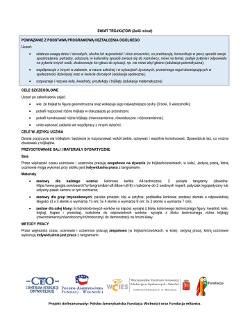 ŚWIAT TRÓJKĄTÓW (2x45 minut) POWIĄZANIE Z PODSTAWĄ PROGRAMOWĄ KSZTAŁCENIA OGÓLNEGO Uczeń: obdarza uwagą dzieci i dorosłych, słucha ich wypowiedzi i chce zrozumieć, co przekazują; komunikuje w jasny sposób swoje spostrzeżenia, potrzeby, odczucia; w kulturalny sposób zwraca się do rozmówcy, mówi na temat, zadaje pytania i odpowiada na pytania innych osób, dostosowuje ton głosu do sytuacji, np. nie mówi zbyt głośno (edukacja polonistyczna); współpracuje z innymi w zabawie, w nauce szkolnej i w sytuacjach życiowych; przestrzega reguł obowiązujących w społeczności dziecięcej oraz w świecie dorosłych (edukacja społeczna); rozpoznaje i nazywa koła, kwadraty, prostokąty i trójkąty (edukacja matematyczna) CELE SZCZEGÓŁOWE Uczeń po zakończeniu zajęć: wie, że trójkąt to figura geometryczna oraz wskazuje jego najważniejsze cechy (3 boki, 3 wierzchołki); potrafi rozpoznać różne trójkąty w otaczającej go przestrzeni; potrafi konstruować różne trójkąty (równoramienne, równoboczne i różnoramienne); umie wykonać zadanie we współpracy z innymi dziećmi. CELE W JĘZYKU UCZNIA Dzisiaj przyjrzycie się trójkątom: będziecie je rozpoznawać wokół siebie, opisywać i wspólnie konstruować. Sprawdzicie też, co można zbudować z trójkątów. PRZYGOTOWANIE SALI I MATERIAŁY DYDAKTYCZNE Sala Przez większość czasu uczniowie i uczennice pracują zespołowo na dywanie (w trójkach/czwórkach, w kole). Jedyną pracą, którą uczniowie mogą wykonać przy stoliku jest indywidualna praca z tangramami. Materiały zestawy dla każdego ucznia: kolorowa kartka A4-techniczna; 2 pocięte tangramy (dowolne: https://www.google.com/search?q=tangram&ie=utf-8&oe=utf-8) i rozłożone do 2 osobnych kopert; patyczek logopedyczny lub sztywny pasek kartonu w tym rozmiarze; zestawy dla grup trzyosobowych: paczka pinezek; klej w sztyfcie; podkładka korkowa; zestawy słomek o odpowiedniej długości (3 x 3 słomki o wymiarze 13 cm; 3x 4 słomki o wymiarze 9 cm; 3x 2 słomki o wymiarze 7 cm); zestaw dla całej klasy: 6 różnokolorowych worków na kapcie; wycięte z bloku kolorowego technicznego figury: kwadrat, koło, trójkąt, trapez i prostokąt, rozłożone do odpowiednich worków; wycięte z bloku technicznego różne trójkąty (równoramienny/równoboczny/różnoboczny) do demonstracji na forum klasy. METODY PRACY Przez większość czasu uczniowie i uczennice pracują zespołowo (w trójkach/czwórkach, w kole). Jedyną pracą, którą uczniowie wykonują indywidualnie jest praca z tangramami. Projekt dofinansowały: Polsko-Amerykańska Fundacja Wolności oraz Fundacja mBanku. PRZEBIEG ZAJĘĆ WSTĘP 1. Zabawa na dobry początek. Zaproponuj uczniom i uczennicom zabawę na dobry początek. W zależności od tego, z jaką grupą pracujesz, może to być: spotkanie w kręgu, sylabizowanie i wyklaskiwanie własnych imion, szukanie wspólnych cech, coś na rozgrzewkę lub koncentrację itp. 2. Nasze zasady. Przedstaw dzieciom zasady panujące na dzisiejszych zajęciach, np. mówi osoba, którą wyznacza nauczyciel poprzez wylosowanie patyczka; w jednym czasie mówi jedna osoba; dzieci aktywnie uczestniczą w zajęciach. Możesz też spróbować ustalić te zasady wspólnie z grupą (lub np. ostatnią zasadę). Pamiętaj, by do tych zasad odwoływać się w toku całej lekcji. W tym momencie wyjaśnij dzieciom – pokazując patyczki – zasadę „wywoływania” do odpowiedzi podczas zajęć. Możemy też zademonstrować zasadę „losowania patyczków” prosząc, by właśnie wylosowane dziecko dodało do listy zasad własną zasadę która np. obowiązuje w ich klasie, lub zasady, która dziś będzie obowiązywała. Poproś, by każde dziecko zapisało swoje imię na patyczku (plus pierwszą literę nazwiska). Patyczki te mogą być przygotowane wcześniej. Wtedy warto poprosić dzieci, by je przyozdobiły w taki sposób, jaki chcą. Pateczki zbieramy do jednego kubeczka. ROZWINIĘCIE 3. Tajemnicze worki. Zaproś dzieci do kręgu. Na środku połóż przygotowane wcześniej tajemnicze worki (w którym umieść poszczególne figury – wycięte ze sztywnego kartony lub z innych materiałów). Losując po 6 patyczków z imionami dzieci, poproś, by każde podchodziło do wolnego worka i – nie zaglądając do nich – sprawdziło dłońmi zawartość. Poproś o zachowanie całkowitego milczenia. Daj im tyle czasu, by jak najlepiej wyczuły, co jest w środku. Gdy wszystkie dzieci już „zbadają zawartość” worków w kręgu zacznijcie rozmowę. Zadawaj uczniom i uczennicom kolejno pytania: Co czuliście dotykając tego, co jest ukryte w worku? Jakie to było (miękkie, twarde, zimne, ciepłe)? Czy potraficie nazwać to, co jest w środku? Dzięki tym pytaniom, zbieramy od dzieci informacje na temat tego, czego doświadczyli; rozbudzamy także ich ciekawość. Następnie wyjmujemy figury z worków i zaczepiamy na tablicy. Prosimy, by uczniowie dobrali się w zespoły (lub losujemy zespoły za pomocą patyczków) i spróbowali ułożyć z siebie wybraną figurę (trójkąt, koło, prostokąt, kwadrat). Losujemy liczbę dzieci adekwatną do figury (trójkąt – 3 osoby; itp.). Wspólnie podsumowujemy. 4. Cele zajęć. Przedstaw dzieciom cele i temat zajęć. Poproś, by rozejrzały się po sali i spróbowały odnaleźć jak najwięcej trójkątów. Za pomocą patyczków zbieramy wyniki poszukiwań dzieci. Z zawieszonych na tablicy figur wybierz trójkąt (możesz poprosić o to jedno dziecko) i powieś w oddaleniu od innych. Wspólnie omówcie tę figurę: Co przypomina? Co jest dla trójkąta charakterystyczne? Jak nazywają się jego części? Następnie pokaż dzieciom różne trójkąty: równoboczne, różnoboczne, równoramiennie. Zapytaj, czym się różnią? 5. Konstruujemy różne trójkąty. Poleć, by w trójkach dzieci zbudowały na korkowych podkładkach te trójkąty (z wykorzystaniem słomek, pinezek i podkładek korkowych). Możesz