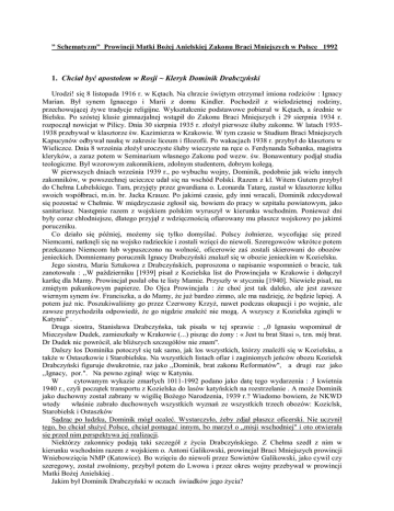 ” Schematyzm” Prowincji Matki Bożej Anielskiej Zakonu Braci Mniejszych w Polsce 1992 1. Chciał być apostołem w Rosji ~ Kleryk Dominik Drabczyński Urodzi! się 8 listopada 1916 r. w Kętach. Na chrzcie świętym otrzymał imiona rodziców : Ignacy Marian. Był synem Ignacego i Marii z domu Kindler. Pochodził z wielodzietnej rodziny, przechowującej żywe tradycje religijne. Wykształcenie podstawowe pobierał w Kętach, a średnie w Bielsku. Po szóstej klasie gimnazjalnej wstąpił do Zakonu Braci Mniejszych i 29 sierpnia 1934 r. rozpoczął nowicjat w Pilicy. Dnia 30 sierpnia 1935 r. złożył pierwsze śluby zakonne. W latach 19351938 przebywał w klasztorze św. Kazimierza w Krakowie. W tym czasie w Studium Braci Mniejszych Kapucynów odbywał naukę w zakresie liceum i filozofii. Po wakacjach 1938 r. przybył do klasztoru w Wieliczce. Dnia 8 września złożył uroczyste śluby wieczyste na ręce o. Ferdynanda Sobanka, magistra kleryków, a zaraz potem w Seminarium własnego Zakonu pod wezw. św. Bonawentury podjął studia teologiczne. Był wzorowym zakonnikiem, zdolnym studentem, dobrym kolegą. W pierwszych dniach września 1939 r., po wybuchu wojny, Dominik, podobnie jak wielu innych zakonników, w powszechnej ucieczce udał się na wschód Polski. Razem z kl. Witem Gutem przybył do Chełma Lubelskiego. Tam, przyjęty przez gwardiana o. Leonarda Tatarę, zastał w klasztorze kilku swoich współbraci, m.in. br. Jacka Krauze. Po jakimś czasie, gdy inni wracali, Dominik zdecydował się pozostać w Chełmie. W międzyczasie zgłosił się, bowiem do pracy w szpitalu powiatowym, jako sanitariusz. Następnie razem z wojskiem polskim wyruszył w kierunku wschodnim. Ponieważ dni były coraz chłodniejsze, dlatego przyjął z wdzięcznością ofiarowany mu płaszcz wojskowy po jakimś poruczniku. Co działo się później, możemy się tylko domyślać. Polscy żołnierze, wycofując się przed Niemcami, natknęli się na wojsko radzieckie i zostali wzięci do niewoli. Szeregowców wkrótce potem przekazano Niemcom łub wypuszczono na wolność, oficerowie zaś zostali skierowani do obozów jenieckich. Domniemany porucznik Ignacy Drabczyński znalazł się w obozie jenieckim w Kozielsku. Jego siostra, Maria Sztukowa z Drabczyńskich, poproszona o napisanie wspomnień o bracie, tak zanotowała : ,,W październiku [1939] pisał z Kozielska list do Prowincjała w Krakowie i dołączył kartkę dla Mamy. Prowincjał posłał oba te listy Mamie. Przyszły w styczniu [1940]. Niewiele pisał, na zmiętym pakunkowym papierze. Do Ojca Prowincjała : że choć jest tak daleko, ale jest zawsze wiernym synem św. Franciszka, a do Mamy, że już bardzo zimno, ale ma nadzieję, że będzie lepiej. A potem już nic. Poszukiwaliśmy go przez Czerwony Krzyż, nawet podczas okupacji i po wojnie, ale zawsze przychodziła odpowiedź, że go nigdzie znaleźć nie mogą. A wszyscy z Kozielska zginęli w Katyniu" . Druga siostra, Stanisława Drabczyńska, tak pisała w tej sprawie : ,,0 Ignasiu wspominał dr Mieczysław Dudek, zamieszkały w Krakowie (...) pisząc do żony : « Jest tu brat Stasi », tzn. mój brat. Dr Dudek nic powrócił, ale bliższych szczegółów nie znam". Dalszy los Dominika potoczył się tak samo, jak los wszystkich, którzy znaleźli się w Kozielsku, a także w Ostaszkowie i Starobielsku. Na wszystkich listach ofiar i zaginionych jeńców obozu Kozielsk Drabczyński figuruje dwukrotnie, raz jako ,,Dominik, brat zakonu Reformatów", a drugi raz jako ,,Ignacy, por.". Na pewno zginął więc w Katyniu. W cytowanym wykazie zmarłych 1011-1992 podano jako datę tego wydarzenia : 3 kwietnia 1940 r., czyli początek transportu z Kozielska do lasów katyńskich na rozstrzelanie . A może Dominik jako duchowny został zabrany w wigilię Bożego Narodzenia, 1939 r.? Wiadomo bowiem, że NKWD wtedy właśnie zabrało duchownych wszystkich wyznań ze wszystkich trzech obozów: Koziclsk, Starobielsk i Ostaszków Sądząc po ludzku, Dominik mógł ocaleć. Wystarczyło, żeby zdjął płaszcz oficerski. Nie uczynił tego, bo chciał służyć Polsce, chciał pomagać innym, bo marzył o „misji wschodniej" i oto otwierała się przed nim perspektywa jej realizacji. Niektórzy zakonnicy podają taki szczegół z życia Drabczyńskiego. Z Chełma szedł z nim w kierunku wschodnim razem z wojskiem o. Antoni Galikowski, prowincjał Braci Mniejszych prowincji Wniebowzięcia NMP (Katowice). Bo wzięciu do niewoli przez Sowietów Galikowski, jako cywil czy szeregowy, został zwolniony, przybył potem do Lwowa i przez okres wojny przebywał w prowincji Matki Bożej Anielskiej . Jakim był Dominik Drabczyński w oczach świadków jego życia? O. Bonawentura Staliński, magister nowicjatu Dominika, tak się wyraził : ,,Dominik Drabczyński jako nowicjusz w Pilicy wyróżniał się wielkim spokojem, pobożnością, pilnością, był bardzo zdolny, a w śpiewie gregoriańskim, w którym ćwiczono nowicjuszy, on był prymusem, z czego się bardzo cieszyłem. Gdy skończył nowicjat i poszedł do Krakowa, to też słyszałem same o n i m plusy". Br. Jacek Maria Krauze poznał kleryka, Dominika, gdy ten przybył do Wieliczki w 19.38 r. Po trzydziestu łatach takie o nim pozostawił wspomnienie : „Był to człowiek bardzo dobry, zawsze życzliwy, łagodny, wyrozumiały, uprzejmy, miły we współżyciu, wesoły, pobożny, skory do usług, pokorny, jednym słowem pełen ducha franciszkańskiego. Daleki od fałszu, obłudy i pychy. Był ze mną parę razy na kweście (na zbiorze snopków), zachowywał się bardzo dobrze. Ostatni raz widziałem się z nim w Chełmie Lubelskim, w czasie ucieczki". O. Wit Gut, współbrat, starszy kolega, wspominając Dominika napisał : „Był spokojny, pobożny, pracowity — od żadnej pracy się nic wykręcał. Ładnie śpiewał, i umiał naśladować kanarka. Zdrowie miał lepsze niż ja. Okazało się to w czasie ucieczki we wrześniu 1939 r. (...) Po kilkuna