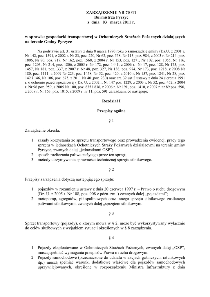ZARZĄDZENIE NR 70 /11 Burmistrza Pyrzyc z dnia 03 marca 2011 r. w sprawie: gospodarki transportowej w Ochotniczych StraŜach PoŜarnych działających na terenie Gminy Pyrzyce Na podstawie art. 31 ustawy z dnia 8 marca 1990 roku o samorządzie gminy (Dz.U. z 2001 r. Nr 142, poz. 1591, z 2002 r. Nr 23, poz. 220, Nr 62, poz. 558, Nr 113, poz. 984, z 2003 r. Nr 214, poz. 1806, Nr 80, poz. 717, Nr 162, poz. 1568, z 2004 r. Nr 153, poz. 1271, Nr 102, poz. 1055, Nr 116, poz. 1203, Nr 214, poz. 1806, z 2005 r. Nr 172, poz. 1441, z 2006 r. Nr 17, poz. 128, Nr 175, poz. 1457, Nr 181, poz.1337, z 2007 r. Nr 48, poz. 327, Nr 138, poz. 974, Nr 173, poz. 1218, z 2008 Nr 180, poz. 1111, z 2009 Nr 223, poz. 1458, Nr 52, poz. 420, z 2010 r. Nr 157, poz. 1241, Nr 28, poz. 142 i 146, Nr 106, poz. 675, z 2011 Nr 40 ,poz. 230) oraz art. 32 ust 2 ustawy z dnia 24 sierpnia 1991 r. o ochronie przeciwpoŜarowej ( Dz. U. z 2002 r. Nr 147 poz. 1229, z 2003 r. Nr 52, poz. 452, z 2004 r. Nr 96 poz. 959, z 2005 Nr 100, poz. 835 i 836, z 2006 r. Nr 191, poz. 1410, z 2007 r. nr 89 poz. 590, z 2008 r. Nr 163, poz. 1015, z 2009 r. nr 11, poz. 59) zarządzam, co następuje: Rozdział I Przepisy ogólne §1 Zarządzenie określa: 1. zasady korzystania ze sprzętu transportowego oraz prowadzenia ewidencji pracy tego sprzętu w jednostkach Ochotniczych StraŜy PoŜarnych działającymi na terenie gminy Pyrzyce, zwanych dalej „jednostkami OSP”; 2. sposób rozliczania paliwa zuŜytego przez ten sprzęt; 3. metody utrzymywania sprawności technicznej sprzętu silnikowego. §2 Przepisy zarządzenia dotyczą następującego sprzętu: 1. pojazdów w rozumieniu ustawy z dnia 20 czerwca 1997 r. – Prawo o ruchu drogowym (Dz. U. z 2005 r. Nr 108, poz. 908 z późn. zm. ) zwanych dalej „pojazdami”; 2. motopomp, agregatów, pił spalinowych oraz innego sprzętu silnikowego zasilanego paliwami silnikowymi, zwanych dalej „sprzętem silnikowym. §3 Sprzęt transportowy (pojazdy), o którym mowa w § 2, moŜe być wykorzystywany wyłącznie do celów słuŜbowych z wyjątkiem sytuacji określonych w § 8 zarządzenia. §4 1. Pojazdy eksploatowane w Ochotniczych StraŜach PoŜarnych, zwanych dalej „OSP”, muszą spełniać wymagania przepisów Prawa o ruchu drogowym. 2. Pojazdy samochodowe (przeznaczone do udziału w akcjach gaśniczych, ratunkowych itp.) muszą spełniać warunki dodatkowe właściwe dla pojazdów samochodowych uprzywilejowanych, określone w rozporządzeniu Ministra Infrastruktury z dnia 31 grudnia 2002 r., w sprawie warunków technicznych pojazdów oraz zakresu ich niezbędnego wyposaŜenia ( Dz. U. z 2003 r. Nr 32, poz. 262 z późn.zm.). 3. Elementy oznakowania muszą być trwale zamocowane, a oznakowanie pojazdu i sprzętu zgodne z zarządzeniem Nr 8 Komendanta Głównego Państwowej StraŜy PoŜarnej z dnia 10 kwietnia 2008 r. w sprawie gospodarki transportowej w jednostkach organizacyjnych Państwowej StraŜy PoŜarnej. §5 1. Naczelnicy jednostek OSP wspólnie z Komendantem Gminnym OSP decydują o sposobie korzystania z pojazdów, sprzętu silnikowego oraz sprzętu poŜarniczego jednostek w granicach określonych w zarządzeniu. 2. Naczelnicy OSP zapewniają sprawność i niezawodność pojazdów, sprzętu silnikowego oraz poŜarniczego, uwzględniając zalecenia producentów przez: a) zapewnienie wykonania czynności obsługi codziennej w zakresie przygotowania sprzętu silnikowego do eksploatacji; b) zapewnienie wykonania badań technicznych, napraw bieŜących i okresowych obsług technicznych; c) właściwe garaŜowanie lub przechowywanie pojazdów, sprzętu silnikowego i sprzętu poŜarniczego. §6 1. Koszty wyposaŜenia, utrzymania, wyszkolenia i zapewnienia gotowości bojowej ochotniczej straŜy poŜarnej ponosi gmina, z zastrzeŜeniem art. 35 ust. 1. ustawy z dnia 24 sierpnia 1991 r. o ochronie przeciwpoŜarowej( Dz. U. z 2002 r. Nr 147, poz. 1229 z późn. zm.). 2. Burmistrz Pyrzyc wykonuje zadania z zakresu ochrony przeciwpoŜarowej i prowadzi nadzór merytoryczny i formalny nad funkcjonowaniem gospodarki transportowej w jednostkach OSP, finansowanych z budŜetu Gminy. Rozdział II Oznakowanie pojazdów, sprzętu silnikowego i sprzętu poŜarniczego §7 1. W jednostkach OSP muszą być stosowane oznakowania pojazdów, sprzętu silnikowego i sprzętu poŜarniczego stosownie do Zarządzenia Nr 8/08 Komendanta Głównego Państwowej StraŜy PoŜarnej z dnia 10 kwietnia 2008 r. 2. Naczelnicy jednostek OSP wspólnie z Komendantem Gminnym OSP odpowiadają za prawidłowe oznakowanie pojazdów, sprzętu silnikowego i sprzętu poŜarniczego eksploatowanego przez te jednostki. Rozdział III UŜywanie pojazdów §8 Pojazdy OSP mogą być nieodpłatnie uŜyte do: 1) udzielenia pomocy straŜakom i mieszkańcom Gminy Pyrzyce, w przypadkach losowych, za zgodą Burmistrza Pyrzyc; 2) udzielenia doraźnej pomocy instytucjom i organizacjom społecznym lub charytatywnym, za zgodą Burmistrza Pyrzyc; 3) zbiorowego przewozu straŜaków i ich rodzin na wyjazdy organizowane przez Zarząd OSP, za zgodą Burmistrza Pyrzyc. 4) przewozu na rzecz jednostek ochrony przeciwpoŜarowej, o których mowa w art. 15, pkt. 6 ustawy z dnia 24 sierpnia 1991 r. o ochronie przeciwpoŜarowej ( Dz. U. z 2002 r. Nr 147, poz. 1229 z późn. zm. ), zwanych dalej „jednostkami OSP”: Rozdział IV Kierowanie pojazdami §9 1. Osoby kierujące pojazdami uprzywilejowanymi OSP muszą posiadać zaświadczenie wydane przez Burmistrza Pyrzyc potwierdzające kwalifikacje do prowadzenia pojazdów uprzywilejowanych zgodnie z postanowieniami art. 95a, ust. 1 pkt. 2 ustawy z dnia 20 czerwca 1997 r. – Prawo o ruchu drogowym (Dz. U. z 2005 r. Nr 108, poz. 908 z późn.zm.). Wzór zaświadczenia stanowi załącznik nr 1 do niniejszego zarządzenia. 2. Dokumentację dotyczącą posiadania uprawnień do kierowania pojazdami uprzywilejowanymi w OSP, stanowiącą podstawę do wydania zaświadczeń o których mowa w ust. 1, prowadzi pracownik Gminy, rea