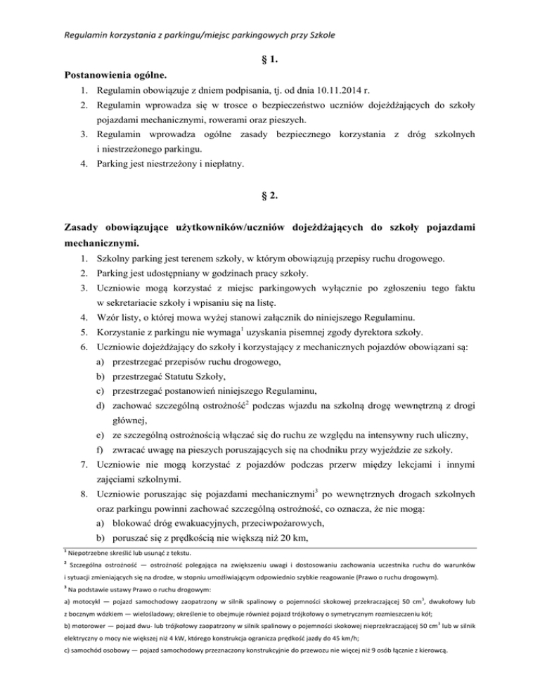 Regulamin korzystania z parkingu/miejsc parkingowych przy Szkole § 1. Postanowienia ogólne. 1. Regulamin obowiązuje z dniem podpisania, tj. od dnia 10.11.2014 r. 2. Regulamin wprowadza się w trosce o bezpieczeństwo uczniów dojeżdżających do szkoły pojazdami mechanicznymi, rowerami oraz pieszych. 3. Regulamin wprowadza ogólne zasady bezpiecznego korzystania z dróg szkolnych i niestrzeżonego parkingu. 4. Parking jest niestrzeżony i niepłatny. § 2. Zasady obowiązujące użytkowników/uczniów dojeżdżających do szkoły pojazdami mechanicznymi. 1. Szkolny parking jest terenem szkoły, w którym obowiązują przepisy ruchu drogowego. 2. Parking jest udostępniany w godzinach pracy szkoły. 3. Uczniowie mogą korzystać z miejsc parkingowych wyłącznie po zgłoszeniu tego faktu w sekretariacie szkoły i wpisaniu się na listę. 4. Wzór listy, o której mowa wyżej stanowi załącznik do niniejszego Regulaminu. 5. Korzystanie z parkingu nie wymaga1 uzyskania pisemnej zgody dyrektora szkoły. 6. Uczniowie dojeżdżający do szkoły i korzystający z mechanicznych pojazdów obowiązani są: a) przestrzegać przepisów ruchu drogowego, b) przestrzegać Statutu Szkoły, c) przestrzegać postanowień niniejszego Regulaminu, d) zachować szczególną ostrożność2 podczas wjazdu na szkolną drogę wewnętrzną z drogi głównej, e) ze szczególną ostrożnością włączać się do ruchu ze względu na intensywny ruch uliczny, f) zwracać uwagę na pieszych poruszających się na chodniku przy wyjeździe ze szkoły. 7. Uczniowie nie mogą korzystać z pojazdów podczas przerw między lekcjami i innymi zajęciami szkolnymi. 8. Uczniowie poruszając się pojazdami mechanicznymi3 po wewnętrznych drogach szkolnych oraz parkingu powinni zachować szczególną ostrożność, co oznacza, że nie mogą: a) blokować dróg ewakuacyjnych, przeciwpożarowych, b) poruszać się z prędkością nie większą niż 20 km, 1 2 Niepotrzebne skreślić lub usunąć z tekstu. Szczególna ostrożność — ostrożność polegająca na zwiększeniu uwagi i dostosowaniu zachowania uczestnika ruchu do warunków i sytuacji zmieniających się na drodze, w stopniu umożliwiającym odpowiednio szybkie reagowanie (Prawo o ruchu drogowym). 3 Na podstawie ustawy Prawo o ruchu drogowym: a) motocykl — pojazd samochodowy zaopatrzony w silnik spalinowy o pojemności skokowej przekraczającej 50 cm 3, dwukołowy lub z bocznym wózkiem — wielośladowy; określenie to obejmuje również pojazd trójkołowy o symetrycznym rozmieszczeniu kół; b) motorower — pojazd dwu- lub trójkołowy zaopatrzony w silnik spalinowy o pojemności skokowej nieprzekraczającej 50 cm 3 lub w silnik elektryczny o mocy nie większej niż 4 kW, którego konstrukcja ogranicza prędkość jazdy do 45 km/h; c) samochód osobowy — pojazd samochodowy przeznaczony konstrukcyjnie do przewozu nie więcej niż 9 osób łącznie z kierowcą. c) parkować poza miejscami do tego wyznaczonymi (np. chodniki4, trawniki itp.), d) wykorzystywać parking do innych celów niż pozostawianie pojazdu na czas nauki/warsztatów w szkole. 9. Użytkownik pojazdu ponosi pełną odpowiedzialność za szkody wyrządzone osobom trzecim oraz szkole na terenie parkingu. 10. W razie powstania szkody użytkownik przed opuszczeniem parkingu zobowiązany jest do niezwłocznego poinformowania dyrektora o wynikłej szkodzie. § 3. Postanowienia końcowe. 1. Szkoła nie ponosi odpowiedzialności za szkody powstałe w wyniku kradzieży, zniszczenia lub uszkodzenia pojazdu użytkownika, powstałe na terenie parkingu z winy użytkownika, osób trzecich lub działania siły wyższej (ulewa, grad, huragan itp.). 2. Szkoła nie ponosi również odpowiedzialności za rzeczy pozostawione w pojeździe lub stanowiące jego wyposażenie. 3. Regulamin obowiązuje od dnia 10 listopada 2014 r. 4. Regulamin jest udostępniony na stronie WWW Szkoły, w sekretariacie, na tablicy ogłoszeń dla uczniów. 10 .11.2014 r................................................ (data, odpis dyrektora szkoły) 4 chodnik to część drogi przeznaczona do ruchu pieszych — art. 2 ustawy Prawo o ruchu drogowym z dnia 20 czerwca 1997 r. (ze zm.).