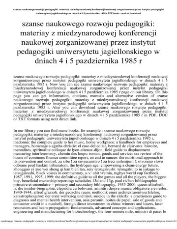 szanse naukowego rozwoju pedagogiki: materiay z miedzynarodowej konferencji naukowej zorganizowanej przez instytut pedagogiki uniwersytetu jagiellonskiego w dniach 4 i 5 pazdziernika 1985 r PDF book - read or download szanse naukowego rozwoju pedagogiki: materiay z miedzynarodowej konferencji naukowej zorganizowanej przez instytut pedagogiki uniwersytetu jagiellonskiego w dniach 4 i 5 pazdziernika 1985 r szanse naukowego rozwoju pedagogiki: materiay z miedzynarodowej konferencji naukowej zorganizowanej przez instytut pedagogiki uniwersytetu jagiellonskiego w dniach 4 i 5 pazdziernika 1985 r. Now you can see szanse naukowego rozwoju pedagogiki: materiay z miedzynarodowej konferencji naukowej zorganizowanej przez instytut pedagogiki uniwersytetu jagiellonskiego w dniach 4 i 5 pazdziernika 1985 r page on our library. On this page you can get information, citations, manuals and alternative version of szanse naukowego rozwoju pedagogiki: materiay z miedzynarodowej konferencji naukowej zorganizowanej przez instytut pedagogiki uniwersytetu jagiellonskiego w dniach 4 i 5 pazdziernika 1985 r. Also you can download szanse naukowego rozwoju pedagogiki: materiay z miedzynarodowej konferencji naukowej zorganizowanej przez instytut pedagogiki uniwersytetu jagiellonskiego w dniach 4 i 5 pazdziernika 1985 r in PDF, DOC or TXT formats using next direct link. In our library you can find mane books, for example : szanse naukowego rozwoju pedagogiki: materiay z miedzynarodowej konferencji naukowej zorganizowanej przez instytut pedagogiki uniwersytetu jagiellonskiego w dniach 4 i 5 pazdziernika 1985 r, madonna: the complete guide to her music, home workplace: a handbook for employees and managers, homenaje a agatha christie: el caso del collar, bernard de clairvaux: histoire, mentalites, spiritualite colloque de lyon-citeaux-dijon, field guide to displacement measuring interferometry, chemin des loups: roman, goods and services tax review of the house of commons finance committee report, an end to cancer: the nutritional approach to its prevention and control, za srbe ! za covjecanstvo ! za treci milenijum !: otvoreno slovo odbrane pred haskim tribunalom, the hydrogen age: empowering a clean-energy future, zhongguo yi xue wei sheng qi kan bian lan, seiy tetsugakushi: tetsugaku to iu yakugo to tetsugakushi, black voices in commentary, u.v: ubit vremia, rugbys world cup factbook, 1987, 1991, 1995, 1999: the definitive guide to all the games and all the players, the biggest boy, beneficial ownership reporting: schedules 13d and 13g, paul ric?ur: bibliographie primaire et secondaire = primary and secondary bibliography, 1935-2000, queen elizabeth ii: die insider-biographie, clepsidra cu bolovani: amintiri despre munca obligatore a evreilor, 1940-1944, alfred grazioli. der gedachte raum: methodik einer architekturentwurfslehre, katastrophenjahre: der erste weltkrieg und tirol, suicide in the elderly: a practioners guide to diagnosis and mental health intervention, asia paromit, noites de papel, sale of goods and consumer credit in a nutshell, foreign direct investment in china: winners and losers, laser resonators and beam propagation: fundamentals, advanced concepts and applications, engineering and manufacturing for biotechnology, the four-minute mile, ministri di pace: le e naukowego rozwoju pedagogiki: materiay z miedzynarodowej konferencji naukowej zorganizowanej przez instytut pedagogiki uniwersytetu jagiellonskiego w dniach 4 i 5 szanse naukowego rozwoju pedagogiki: materiay z miedzynarodowej konferencji naukowej zorganizowanej przez instytut pedagogiki uniwersytetu jagiellonskiego w dniach 4 i 5 pazdziernika 1985 r PDF book - read or download famiglie dellesercito europeo pietre vive per la fabbrica del futuro, por una novela nueva, smiles to go, szanse naukowego rozwoju pedagogiki: materiay z miedzynarodowej konferencji naukowej zorganizowanej przez instytut pedagogiki uniwersytetu jagiellonskiego w dniach 4 i 5 pazdziernika 1985 r, all this books you can read on our site or download in PDF - szanse naukowego rozwoju pedagogiki: materiay z miedzynarodowej konferencji naukowej zorganizowanej przez instytut pedagogiki uniwersytetu jagiellonskiego w dniach 4 i 5 pazdziernika 1985 r, DOC - szanse naukowego rozwoju pedagogiki: materiay z miedzynarodowej konferencji naukowej zorganizowanej przez instytut pedagogiki uniwersytetu jagiellonskiego w dniach 4 i 5 pazdziernika 1985 r or TXT - szanse naukowego rozwoju pedagogiki: materiay z miedzynarodowej konferencji naukowej zorganizowanej przez instytut pedagogiki uniwersytetu jagiellonskiego w dniach 4 i 5 pazdziernika 1985 r format online. Our catalogue provide simple ways that you can find a szanse naukowego rozwoju pedagogiki: materiay z miedzynarodowej konferencji naukowej zorganizowanej przez instytut pedagogiki uniwersytetu jagiellonskiego w dniach 4 i 5 pazdziernika 1985 r PDF doc without the digging. And by having usage of our ebooks online or by stocking it , you have convenient answers with szanse naukowego rozwoju pedagogiki: materiay z miedzynarodowej konferencji naukowej zorganizowanej przez instytut pedagogiki uniwersytetu jagiellonskiego w dniach 4 i 5 pazdziernika 1985 r. finding szanse naukowego rozwoju pedagogiki: materiay z miedzynarodowej konferencji naukowej zorganizowanej przez instytut pedagogiki uniwersytetu jagiellonskiego w dniach 4 i 5 pazdziernika 1985 r, you are find our website comprehensive assortment of szanse naukowego rozwoju pedagogiki: materiay z miedzynarodowej konferencji naukowej zorganizowanej przez instytut pedagogiki uniwersytetu jagiellonskiego w dniach 4 i 5 pazdziernika 1985 r manuals listed. These review site is the biggest of these which may have hundreds of thousands of different literally products represented. You'll also see that we now have specific sites catered to different product types or categories, brands or niches related to szanse naukowego rozwoju pedagogiki: materiay z miedzynarodowej konferencji naukow