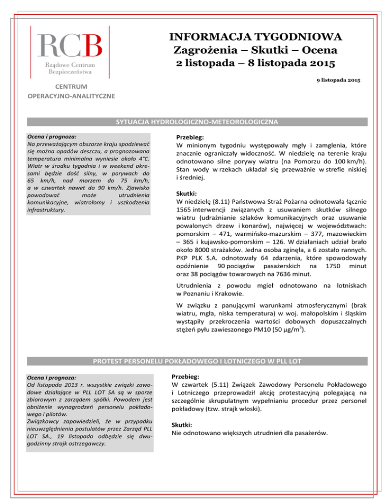 INFORMACJA TYGODNIOWA Zagrożenia – Skutki – Ocena Ców? kalaŁo podpisanie 2 listopada – 8 listopada 2015 9 listopada 2015 CENTRUM OPERACYJNO-ANALITYCZNE SYTUACJA HYDROLOGICZNO-METEOROLOGICZNA Ocena i prognoza: Na przeważającym obszarze kraju spodziewać się można opadów deszczu, a prognozowana temperatura minimalna wyniesie około 4°C. Wiatr w środku tygodnia i w weekend okresami będzie dość silny, w porywach do 65 km/h, nad morzem do 75 km/h, a w czwartek nawet do 90 km/h. Zjawisko powodować może utrudnienia komunikacyjne, wiatrołomy i uszkodzenia infrastruktury. Przebieg: W minionym tygodniu występowały mgły i zamglenia, które znacznie ograniczały widoczność. W niedzielę na terenie kraju odnotowano silne porywy wiatru (na Pomorzu do 100 km/h). Stan wody w rzekach układał się przeważnie w strefie niskiej i średniej. Skutki: W niedzielę (8.11) Państwowa Straż Pożarna odnotowała łącznie 1565 interwencji związanych z usuwaniem skutków silnego wiatru (udrażnianie szlaków komunikacyjnych oraz usuwanie powalonych drzew i konarów), najwięcej w województwach: pomorskim – 471, warmińsko-mazurskim – 377, mazowieckim – 365 i kujawsko-pomorskim – 126. W działaniach udział brało około 8000 strażaków. Jedna osoba zginęła, a 6 zostało rannych. PKP PLK S.A. odnotowały 64 zdarzenia, które spowodowały opóźnienie 90 pociągów pasażerskich na 1750 minut oraz 38 pociągów towarowych na 7636 minut. Utrudnienia z powodu mgieł odnotowano na lotniskach w Poznaniu i Krakowie. W związku z panującymi warunkami atmosferycznymi (brak wiatru, mgła, niska temperatura) w woj. małopolskim i śląskim wystąpiły przekroczenia wartości dobowych dopuszczalnych stężeń pyłu zawieszonego PM10 (50 μg/m3). PROTEST PERSONELU POKŁADOWEGO I LOTNICZEGO W PLL LOT Ocena i prognoza: Od listopada 2013 r. wszystkie związki zawodowe działające w PLL LOT SA są w sporze zbiorowym z zarządem spółki. Powodem jest obniżenie wynagrodzeń personelu pokładowego i pilotów. Związkowcy zapowiedzieli, że w przypadku nieuwzględnienia postulatów przez Zarząd PLL LOT SA., 19 listopada odbędzie się dwugodzinny strajk ostrzegawczy. Przebieg: W czwartek (5.11) Związek Zawodowy Personelu Pokładowego i Lotniczego przeprowadził akcję protestacyjną polegającą na szczególnie skrupulatnym wypełnianiu procedur przez personel pokładowy (tzw. strajk włoski). Skutki: Nie odnotowano większych utrudnień dla pasażerów. INFORMACJA TYGODNIOWA 02.11.2015 – 08.11.2015 STRAJK W PKP CARGO ZAWIESZONY Ocena i prognoza: Spór pomiędzy związkowcami a zarządem Spółki PKP CARGO S.A. trwa od wielu miesięcy. Głównym postulatem związkowców jest podniesienie wynagrodzeń. Ponadto, pracownicy zakładu w Tarnowskich Górach są przeciwni przenoszeniu centrali spółki do Katowic, co może spowodować likwidację kilkuset miejsc pracy. Komitet Protestacyjny zapowiedział, że mogą zostać przeprowadzone akcje protestacyjne w poszczególnych zakładach spółki jeśli pracodawca podejmie działania o charakterze restrukturyzacyjnym, bądź decyzję o alokacji pracowników. Przebieg: Krajowy Komitet Protestacyjno Strajkowy w PKP CARGO S.A. zadecydował o zawieszeniu do 9 grudnia br. zaplanowanej na poniedziałek (9.11) akcji strajkowej. Utrzymane zostaje pogotowie strajkowe i oflagowanie zakładów. Związkowcy poinformowali również, że do prokuratury zostanie skierowane doniesienie o możliwości „popełnienia przestępstwa przez Zarząd PKP CARGO S.A. i pracodawców kierujących zakładami spółki poprzez utrudnianie działalności związkowej oraz zastraszanie pracowników”. Skutki: Nie odnotowano. PLANOWANE ZGROMADZENIA PUBLICZNE ŚWIĘTO NIEPODLEGŁOŚCI Na 11 listopada w Warszawie, Wrocławiu, Szczecinie i Krakowie środowiska prawicowe planują organizacje marszów i demonstracji związanych z przypadającym w tym dniu Świętem Niepodległości. Przewidywany jest udział od kilku do kilkudziesięciu tysięcy uczestników. Największa demonstracja – Marsz Niepodległości odbędzie się w Warszawie. Podczas organizowanych w ubiegłych latach manifestacjach dochodziło do przypadków naruszenia porządku publicznego, uszkodzeń mienia oraz interwencji służb wobec agresywnych uczestników. ZAPOWIEDZI PROTESTU W PGNIG W środę (4.11) Związki Zawodowe poinformowały Zarząd Polskiego Górnictwa Naftowego i Gazownictwa SA o zakończeniu referendum w spółce. Pracownicy opowiedzieli się za akcją protestacyjną ze strajkiem włącznie. Wcześniej związki zawodowe odrzuciły propozycję zarządu zakładającą wypłatę premii rocznej w wysokości 5 tys. zł oraz zasilenie bonów towarowych dodatkową kwotą 250 zł dla każdego uprawnionego pracownika ponad uzgodnione wcześniej 2 tys. zł. Według Zarządu PGNiG zapowiadane obciążenia fiskalne sektora wydobycia uniemożliwiają spełnienie wszystkich żądań związków zawodowych. Spór zbiorowy w PGNIG SA trwa od 18 maja bieżącego roku. WSPARCIE POLSKIEJ STRAŻY GRANICZNEJ DLA WĘGIERSKIEJ POLICJI Na mocy porozumienia między Komendantem Głównym Straży Granicznej a Komendantem Głównym Policji Krajowej Węgier o intensyfikacji współpracy transgranicznej, szczególnie w zwalczaniu terroryzmu i przestępczości transgranicznej, grupa 43 funkcjonariuszy SG od 5 listopada do 3 grudnia br. weźmie udział w misji. Oddelegowanych zostało po ośmiu funkcjonariuszy z pięciu oddziałów Straży Granicznej: Morskiego OSG, Warmińsko-Mazurskiego OSG, Podlaskiego OSG, Nadbużańskiego OSG i Bieszczadzkiego OSG, oraz po jednym funkcjonariuszu ze Sztabu Komendanta Głównego SG, Nadwiślańskiego OSG i Ośrodka Szkoleń Specjalistycznych SG. Funkcjonariusze w ramach wspólnych patroli będą wspierać Policję Węgier w ochronie zewnętrznej granicy Unii Europejskiej na odcinku granicy państwowej Węgier z Republiką Serbii oraz zwalczaniu nielegalnej migracji na tym odcinku. Rządowe Cent