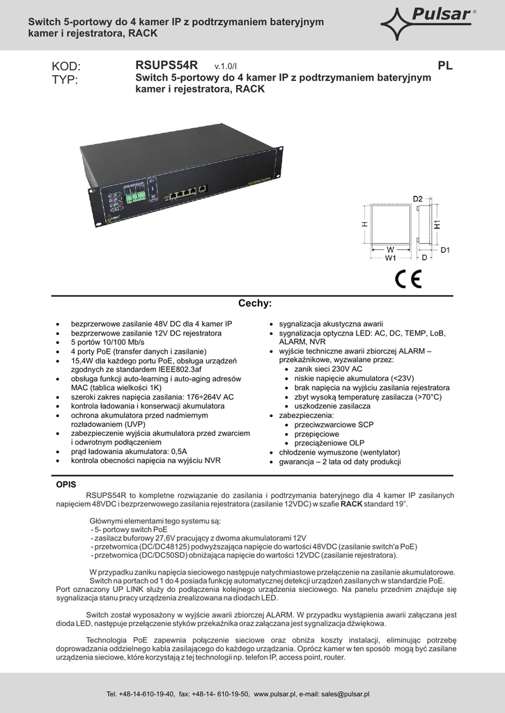Switch 5-portowy do 4 kamer IP z podtrzymaniem bateryjnym kamer i rejestratora, RACK KOD: TYP: RSUPS54R Pulsar PL v.1.0/I Switch 5-portowy do 4 kamer IP z podtrzymaniem bateryjnym kamer i rejestratora, RACK Cechy: · · · · · · · · · · · · bezprzerwowe zasilanie 48V DC dla 4 kamer IP bezprzerwowe zasilanie 12V DC rejestratora 5 portów 10/100 Mb/s 4 porty PoE (transfer danych i zasilanie) 15,4W dla każdego portu PoE, obsługa urządzeń zgodnych ze standardem IEEE802.3af obsługa funkcji auto-learning i auto-aging adresów MAC (tablica wielkości 1K) szeroki zakres napięcia zasilania: 176÷264V AC kontrola ładowania i konserwacji akumulatora ochrona akumulatora przed nadmiernym rozładowaniem (UVP) zabezpieczenie wyjścia akumulatora przed zwarciem i odwrotnym podłączeniem prąd ładowania akumulatora: 0,5A kontrola obecności napięcia na wyjściu NVR · sygnalizacja akustyczna awarii · sygnalizacja optyczna LED: AC, DC, TEMP, LoB, ALARM, NVR · wyjście techniczne awarii zbiorczej ALARM – przekaźnikowe, wyzwalane przez: · zanik sieci 230V AC · niskie napięcie akumulatora (<23V) · brak napięcia na wyjściu zasilania rejestratora · zbyt wysoką temperaturę zasilacza (>70°C) · uszkodzenie zasilacza · zabezpieczenia: · przeciwzwarciowe SCP · przepięciowe · przeciążeniowe OLP · chłodzenie wymuszone (wentylator) · gwarancja – 2 lata od daty produkcji OPIS RSUPS54R to kompletne rozwiązanie do zasilania i podtrzymania bateryjnego dla 4 kamer IP zasilanych napięciem 48VDC i bezprzerwowego zasilania rejestratora (zasilanie 12VDC) w szafie RACK standard 19”. Głównymi elementami tego systemu są: - 5- portowy switch PoE - zasilacz buforowy 27,6V pracujący z dwoma akumulatorami 12V - przetwornica (DC/DC48125) podwyższająca napięcie do wartości 48VDC (zasilanie switch'a PoE) - przetwornica (DC/DC50SD) obniżająca napięcie do wartości 12VDC (zasilanie rejestratora). W przypadku zaniku napięcia sieciowego następuje natychmiastowe przełączenie na zasilanie akumulatorowe. Switch na portach od 1 do 4 posiada funkcję automatycznej detekcji urządzeń zasilanych w standardzie PoE. Port oznaczony UP LINK służy do podłączenia kolejnego urządzenia sieciowego. Na panelu przednim znajduje się sygnalizacja stanu pracy urządzenia zrealizowana na diodach LED. Switch został wyposażony w wyjście awarii zbiorczej ALARM. W przypadku wystąpienia awarii załączana jest dioda LED, następuje przełączenie styków przekaźnika oraz załączana jest sygnalizacja dźwiękowa. Technologia PoE zapewnia połączenie sieciowe oraz obniża koszty instalacji, eliminując potrzebę doprowadzania oddzielnego kabla zasilającego do każdego urządzania. Oprócz kamer w ten sposób mogą być zasilane urządzenia sieciowe, które korzystają z tej technologii np. telefon IP, access point, router. Tel. +48-14-610-19-40, fax: +48-14- 610-19-50, www.pulsar.pl, e-mail: [email protected] ® Switch 5-portowy do 4 kamer IP z podtrzymaniem bateryjnym kamer i rejestratora, RACK Pulsar PARAMETRY SWITCH'A Porty Zasilanie PoE Protokoły, Standardy Szybkość przekierowań Przepustowość Metoda transmisji Optyczna sygnalizacja pracy 5 portów 10/100Mb/s (4 x PoE + 1 x UPLINK) z automatyczną negocjacją szybkości połączeń, automatycznym krosowaniem Auto MDI/MDIX) IEEE 802.3af (porty 1÷4), 48V DC / 15,4W na każdy port * IEEE802.3, 802.3u, 802.3x CSMA/CD, TCP/IP 10BASE-T: 14880pps/port 100BASE-TX: 148800pps/port 1,6Gbps Store-and-Forward Zasilanie switch'a; Link/Act; PoE Status * podana wartość 15,4W na port jest wartością maksymalną. Przy pełnym obsadzeniu portów PoE sumaryczny pobór mocy nie powinien przekroczyć 48W. PARAMETRY ELEKTRYCZNE Napięcie zasilania Pobór prądu Moc zasilacza Napięcie wyjściowe na portach PoE (RJ45) Napięcie na wyjściu NVR – zasilanie rejestratora Prąd wyjściowy na portach PoE (RJ45) Prąd na wyjściu NVR – zasilanie rejestratora Napięcie tętnienia – wyjście rejestratora NVR Zabezpieczenie przed zwarciem SCP i przeciążeniem OLP Pobór prądu przez układy zasilacza Prąd ładowania akumulatora Zabezpieczenie w obwodzie akumulatora SCP i odwrotna polaryzacja podłączenia Zabezpieczenie akumulatora przed nadmiernym rozładowaniem UVP Optyczna sygnalizacja pracy Akustyczna sygnalizacja pracy: Wyjście techniczne awarii zbiorczej ALARM Bezpiecznik FMAINS w obwodzie zasilania 230V 176÷264V AC 1,1A@230VAC max. 122W 48VDC – utrzymywane niezależnie od stanu naładowania akumulatora 12VDC – utrzymywane niezależnie od stanu naładowania akumulatora 4 x 0,3A ΣI=1A (max.) 5A 150mV 105% ÷ 150% mocy zasilacza, ponowne uruchomienie ręczne (awaria wymaga odłączenia obwodu wyjściowego DC) 0,2A 0,5A max. (+/-5%) bezpiecznik topikowy U<19V (± 5%) – odłączenie zacisku akumulatora Diody LED: AC, DC, NVR, TEMP, LoB, ALARM, LINK, PoE Sygnalizator piezoelektryczny ~75dB/0,3m typu przekaźnikowego: 1A@ 30VDC/50VAC T 3,15A PARAMETRY MECHANICZNE Wymiary obudowy Mocowanie Waga netto/brutto Obudowa Złącza Uwagi W=19”, H=2U; 482 x 88 x 265 mm (WxHxD) czteropunktowe doczołowe do profili RACK - w komplecie 4 śruby M6 + koszyki 6,37 / 6,89 kg Blacha stalowa RAL 9005, czarny Wejście 230V AC: gniazdo IEC C14 z bezpiecznikiem, kabel zasilający 1,5m (na wyposażeniu) 2 Wyjście techniczne ALARM: Φ0,5-2,1 (AWG 24-12) 0,5-1,5mm 2 Wyjście zasilania rejestratora NVR : Φ0,5-2,1 (AWG 24-12) 0,5-1,5mm kabel zasilający 2m zakończony wtykiem DC 5,5/2,1 (na wyposażeniu) Wyjścia kamer PoE: gniazda RJ45 8P8C Wyjście danych rejestratora UPLINK: gniazdo RJ45 8P8C Wyjście akumulatora BAT: 6,3F-2,5 chłodzenie wymuszone (wentylator) Tel. +48-14-610-19-40, fax: +48-14- 610-19-50, www.pulsar.pl, e-mail: [email protected] ®