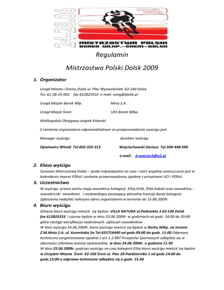 Regulamin Mistrzostwa Polski Dolsk 2009 1. Organizator Urząd Miasta i Gminy Dolsk ul. Plac Wyzwolenia4. 63-140 Dolsk Tel. 61-28-25-001 fax 612825510 e-mail: [email protected] Urząd Miejski Borek Wlp. Mróz S.A. Urząd Miejsk Śrem UKS Borek Wlkp. Wielkopolski Okręgowy wiązek Kolarski Z ramienia organizatora odpowiedzialnym za przeprowadzenie wyścigu jest: Menager wyścigu dyrektor wyścigu Opielewicz Witold Tel.602-325-313 Wojciechowski Dariusz Tel.509-448-500 e-mail: [email protected] 2. Klasa wyścigu Szosowe Mistrzostwa Polski – jazda indywidualna na czas i start wspólny umieszczony jest w kalendarzu imprez PZKol i zostanie przeprowadzony zgodnie z przepisami UCI i PZKol. 3. Uczestnictwo W wyścigu prawo startu mają zawodnicy kategorji Elita,Orlik, Elita kobiet oraz zawodnicy zawodniczki niewidomi i niedowidzący posiaający aktualną licencję danej kategorji. Zgłoszenia nadsyłać należyna adres organizatora w terminie do 15.06.2009r. 4. Biuro wyścigu Glówne biuro wyścigu mieścić się będzie: VILLA NATURA ul.Podrzekta 3 63-140 Dolsk fax 612825253 i czynne będzie w dniu 23.06.2009r. w godzinach od godz. 18:00 do 20:00 gdzie nastąpi weryfikacja nadeslanych zgłoszeń zawodników . W dniu wyścigu 24.06.2009r. biuro wyścigu mieścić się będzie w Borku Wlkp. na terenie Z.M.Mróz S.A. ul. Kozmińska 5a Tel.655716440 od godz.09:00 do godz. 11:00 Odprawa techniczna zorganizowana zgodnie z art.1.2.087 Przepisów Sportowych odbędzie się w obecności członków komisji sędziowskiej w dniu 24.06.2009r. o godzinie 11:30 W dniu 25.06.2009r. podczas wyścigu na czas kategorii Elita biuro wyścigu mieścić się będzie w Urzędzie Miasta Śrem 63-100 Śrem ul. Plac 20 Pażdziernika 1 od godz.14:00 do godz.15:00 a odprawa techniczna odbędzie się o godz. 15:30 4a. BIURA WYŚCIGU I ODPRAWY TECHNICZNE Dla zawodników startujących dniu 26.06.09. Dolsk biuro wyścigu czynne będzie od godz. 14:00 do godz.15:00 a odprawa techniczna o godz.15:30 w Villa Natura, Dolsk ul,Podrzekta Dla zawodniczek kategorii ELITA KOBIET oraz zawodników kategorii ORLIK Startujących w Dniu 27.06.09 biuro wyścigu i odprawa techniczna odbędzie się 26.06.09. o godz. 21:00 w Villa Natura,Dolsk ul Podrzekta 3 Dla zawodników Kategorii ELITA startujących w dniu 28.06.09. odprawa techniczna odbędzie się w dniu 28.06.09. godzin.09:00 w Borku wlkp. na terenieZ.M. Mróz S.A. ul.Kożmińska 5a 5. Radio wyścigu Informacje na temat radia wyścigu podane zostaną na odprawie technicznej. 6. Neutralna Pomoc Techniczna Organizator zapewnia na trasie profesjonalną neutralną pomoc techniczną . 7. Kolejność startów 24 .06.09. Borek Wlkp. jazda indywidualna na czas kat. Elita kobiet oraz zawodniczki niewidome i niedowidzące , dystans 18 km. Na trasie Borek Wlkp-Jeżewo- Jawory-WyciłowoKoszkowo nawrót-dojazd na metę Borek Wlkp. Kategoria Orlik jazda indywidualna na czas dystans 32 km. Na trasie Borek Wlkp-JeżewoJawory-Wycisłowo – Koszkowo-Pokrzywnica nawrót –dojazd na metę Borek Wlkp . Zawodnicy niewidomi i niedowidzący Jazda indywidualna na czas dystans 32 km. Na trasie jak dla kategorii Orlik Trasa uwidoczniona na mapce nr. 2 Start pierwszej Zawodniczki godzina 13:30, zakończenie około godz.19:00 25.06.09. Śrem jazda indywidualna na czas kat. ELITA , dystans 46 km. Start i meta Śrem Rynek ( 2 rundy po 23 km ) Start godz. 16:00 zakończenie Około godz. 19:00 26.06.09. Dolsk wyścig ze startu wspólnego zawodników niewidomych i niedowidzących na dystansie 93 km. (7 rund po 13,3 km. ) z zawodnikami startują 3 pary niedowidzących kobiet na dystansie 53 km. ( 4 rundy 13,3 km. ) Start godz, 16:00 zakończenie około godz. 19:00 27.06.09. Borek Wlkp- Dolsk wyścig ze startu wspólnego Elita Kobiet na dystansie 119,3 km ( 9 rund 13,3 km. ) Kategoria Orlik Wyścig ze startu wspólnego na dystansie 177 km. ( 12 rund 13,3 km ) Trasa wyścigu- start Borek Wlkp – dojazd do Dolska-początek rundy-Trąbinek-OstrowieczkoPokrzywnica-DolskRynek Start 2 kategorie godz.10:00 zakończenie około godz.19:00 28.06.09. Borek Wlkp-Dolsk--Książ Wlkp.Dolsk Wyścig ze stratu wspólnego kategorii ELITA na dystansie 254 km. ( dojazd i 14 rund )na trasie Borek Wlkp-Dolsk-Książ Wlkp-powrót na Dolsk początek rund-Trąbinek-Ostrowieczko-Pokrzywnica-Dolsk Rynek . Start godz. 11:00 zakończenie około godz.18:00 8. Klasyfikacja Zwycięzcą w poszczególnych kategoriach zostanie zawodniczka lub zawodnik,który pokona dystans w najkrótszym czasie. 9. Nagrody Zwycięzcy udekorowani zostaną koszulkami i medalami PZKol. 10.Kontrola antydopingowa Podczas wyścigu obowiązują przepisy antydopingowe UCI iPZKol. Ilośc zawdników do badania w poszczególnych wyścigach podana zostanie na odprawie technicznej. 11.Ceremonia dekoracji Zgodnie z art. 1.2.112 Przepisów Sportowych do dekoracji mają obowiązek zgłosić się zawodnicy którzy zajmą pierwsze trzy miejsca na mecie każdego wyścigu. 12.Kary W zakresie kar obowiązują przepisy sportowe UCI i PZKol. 13.Zasady bezpieczeństwa Dyrektorzy sportowi oraz wszystkie osoby licencjonowane i akredytowane odpowiedzialne są za ścisłe przestrzeganie regulaminu i programu Mistrzostw Polski oraz zaleceń organizatora i komisji sędziowskiej. Organizator ubezpiecza zawody od OC na okres trwania zawodów . Wyścigi jazdy indywidualnej na czas rozegrane zostaną przy całkowicie zamkniętym ruchu drogowym. W przypadku straty kontaktu z peletonem powyżej 15 min. Każdy zawodnik traktowany jest jak normalny użytkownik ruchu drogowego i przestrzega zasad i przepisów drogowych. Organizator nie ponosi odpowiedzialności za rzeczy zaginione w trakcie trwania Mistrzostw Polski . Każdy uczestnik bierze udział w zawodach na własną odpowiedzialność. Samochody techniczne należy parkować w miejscach przeznaczonych dla ekip i stosować się należy do poleceń Policji i Straży Miejskiej. Podawanie napojów i żywności dozwolone jest w wyznaczonych strefach bufetu tyl